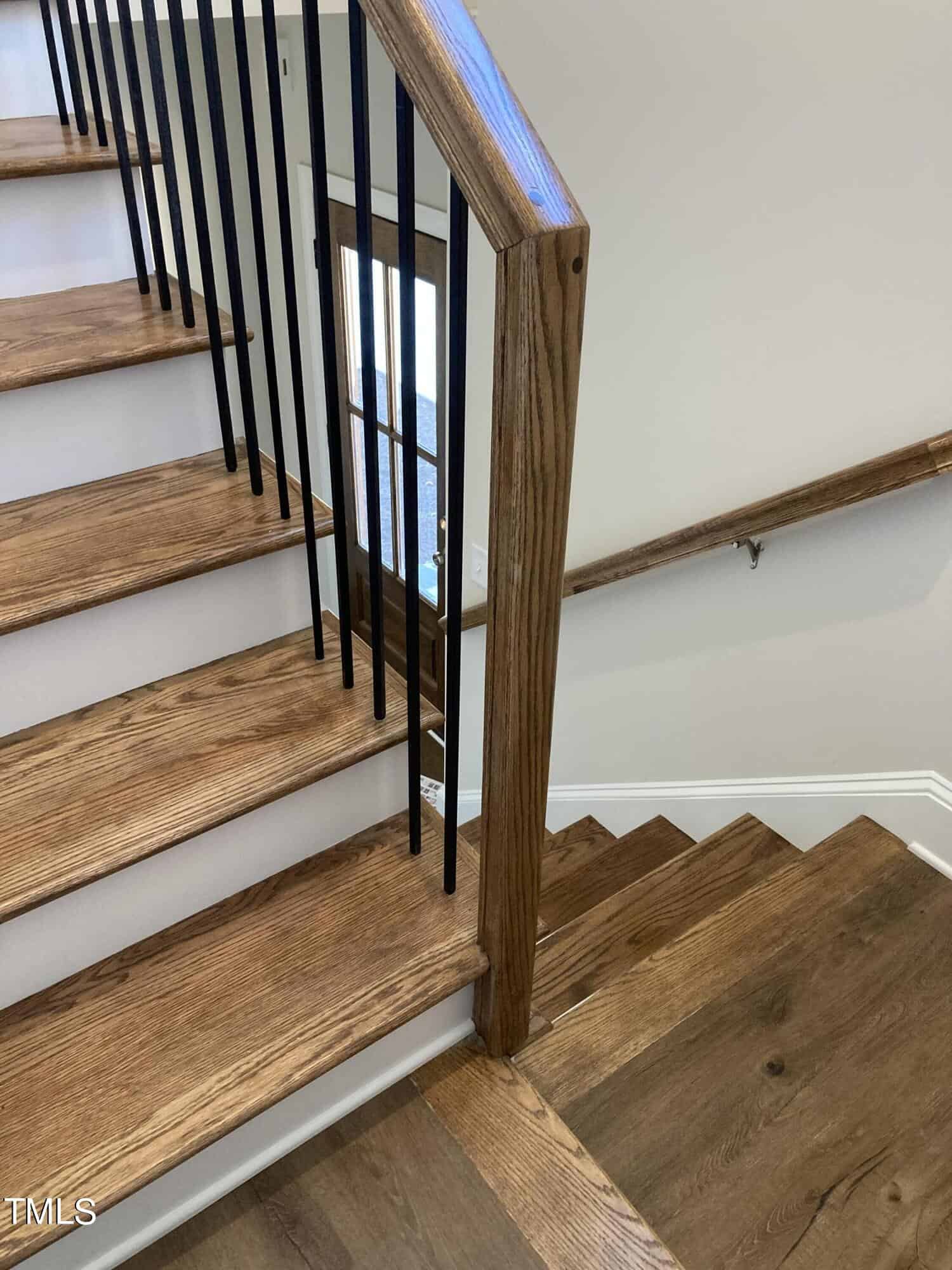 Stairs have stained hardwood stair treads and metal railings. Upstairs has upgraded carpet and carpet padding.