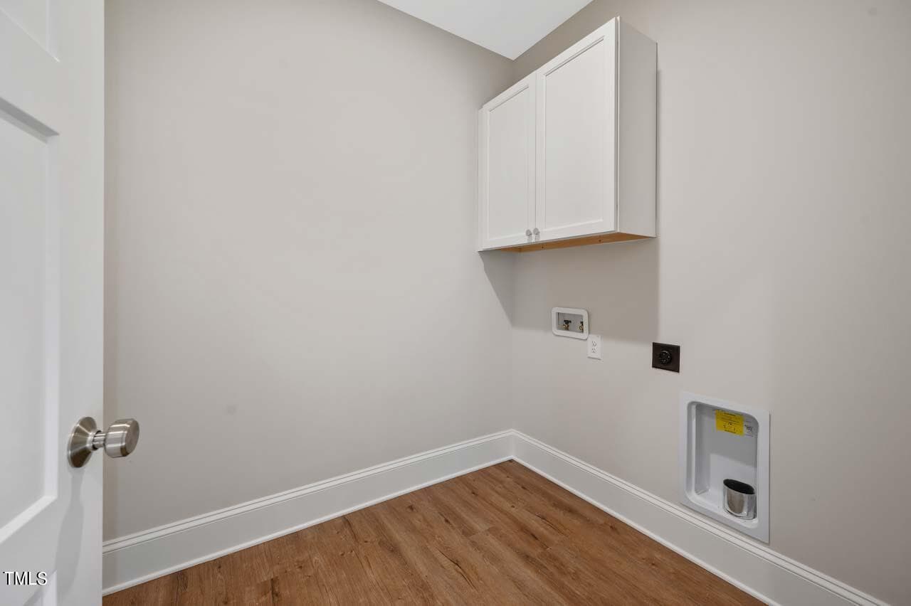 Main level roomy laundry room with wall cabinet is conveniently located.