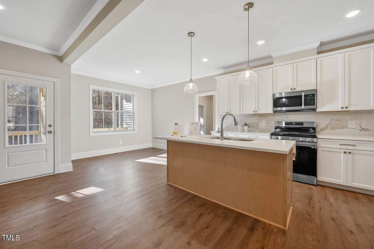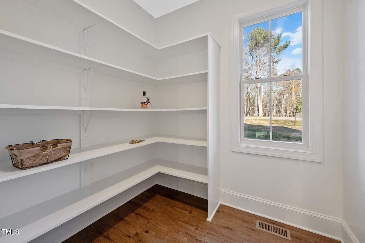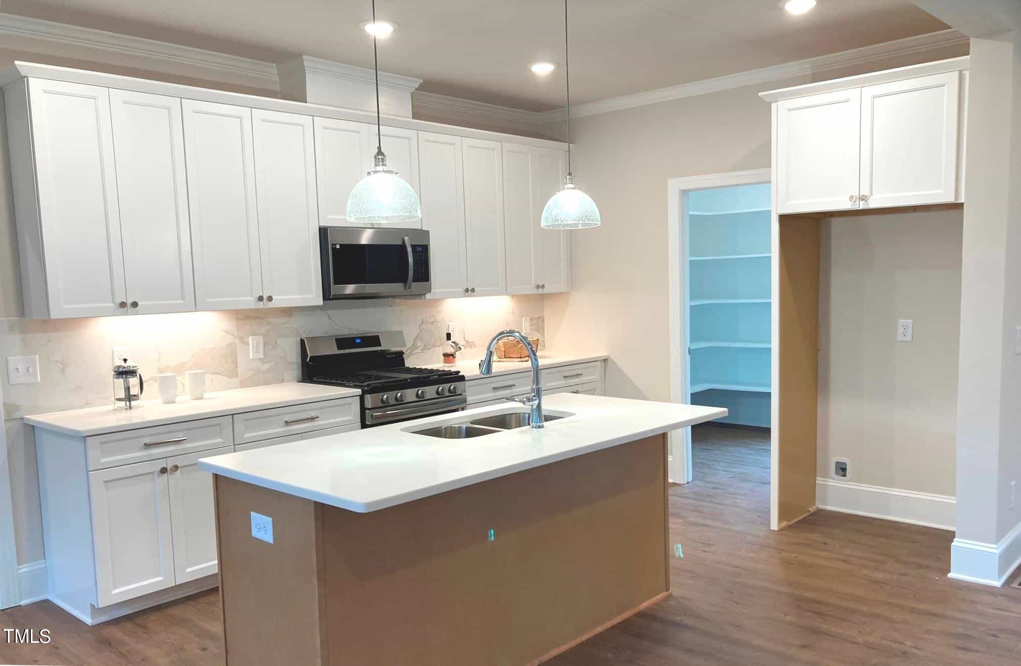 The designer kitchen dazzles with quartz countertops and stainless steel appliances. Soft-close cabinets and drawers, and 42” tall wall cabinets are additional compliments. Mega storage in the adjacent walk-in large separate pantry room.