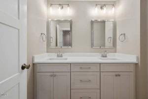 UPstairs are 2 more bedrooms, a full bath with tile floor, 2-sink quartz top vanity and linen closet, all private from the separate tub/shower & toilet room.