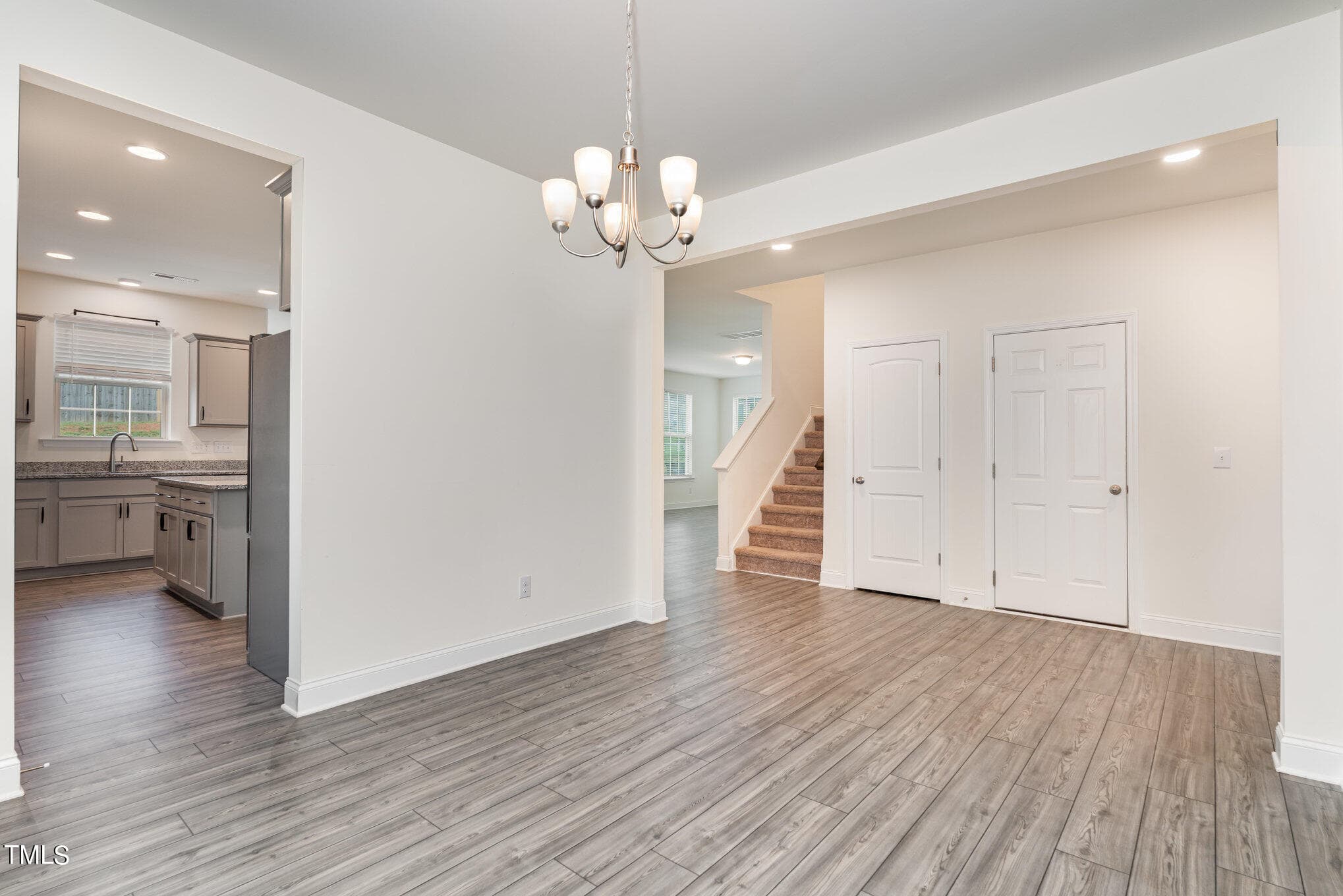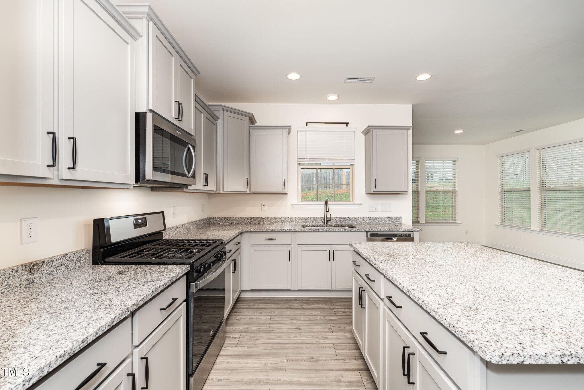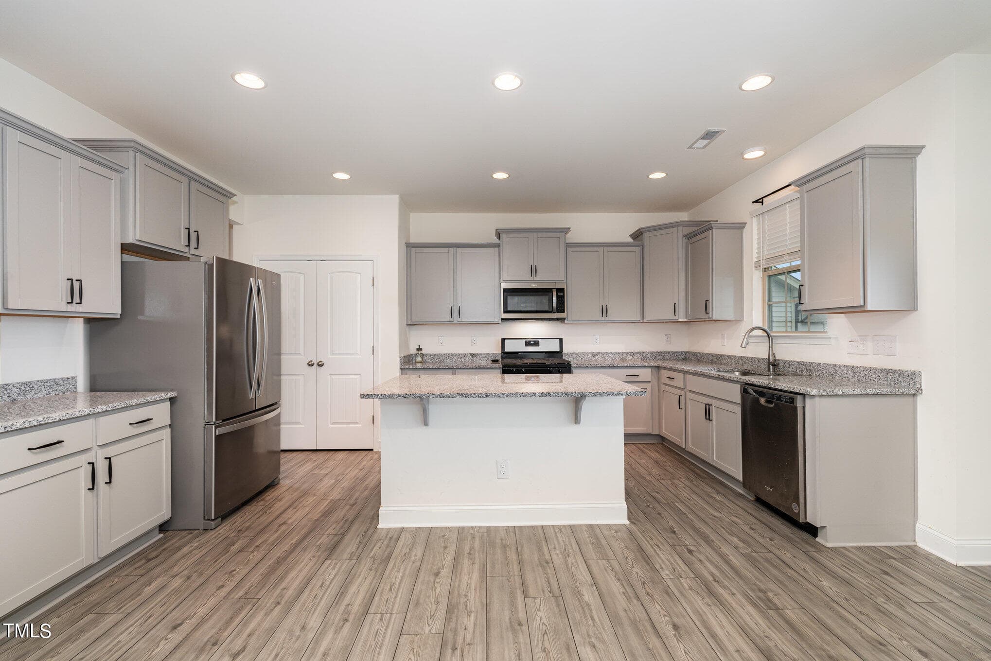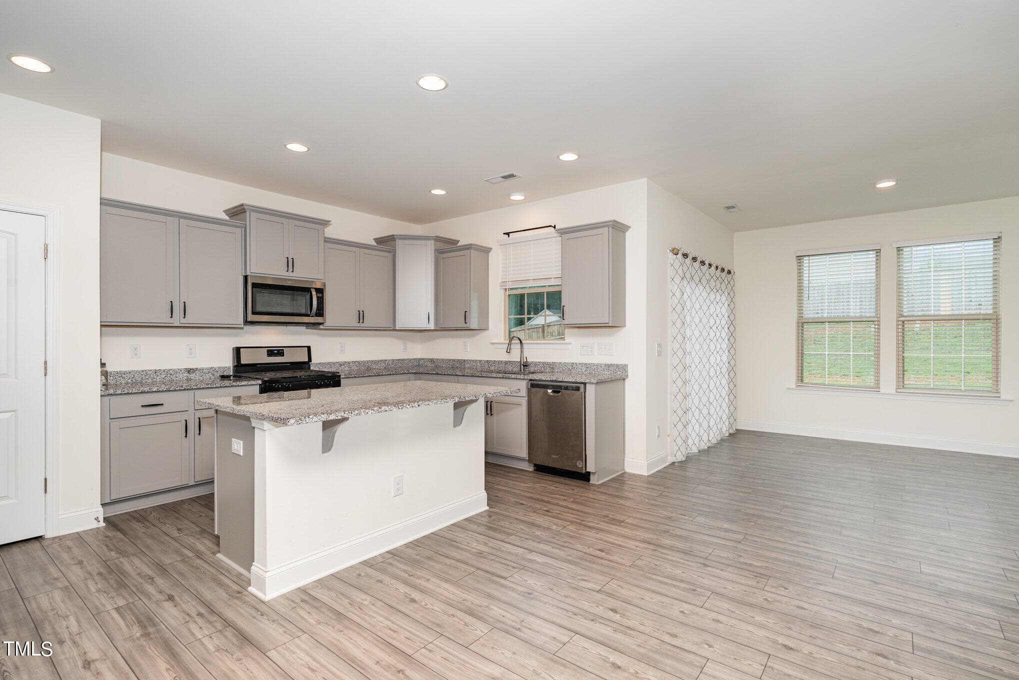 Open concept kitchen with gray cabinets and granite countertops, great for entertaining! Beautiful French door office on the 1st floor. Great for working from home. Community has a clubhouse and a swimming pool.