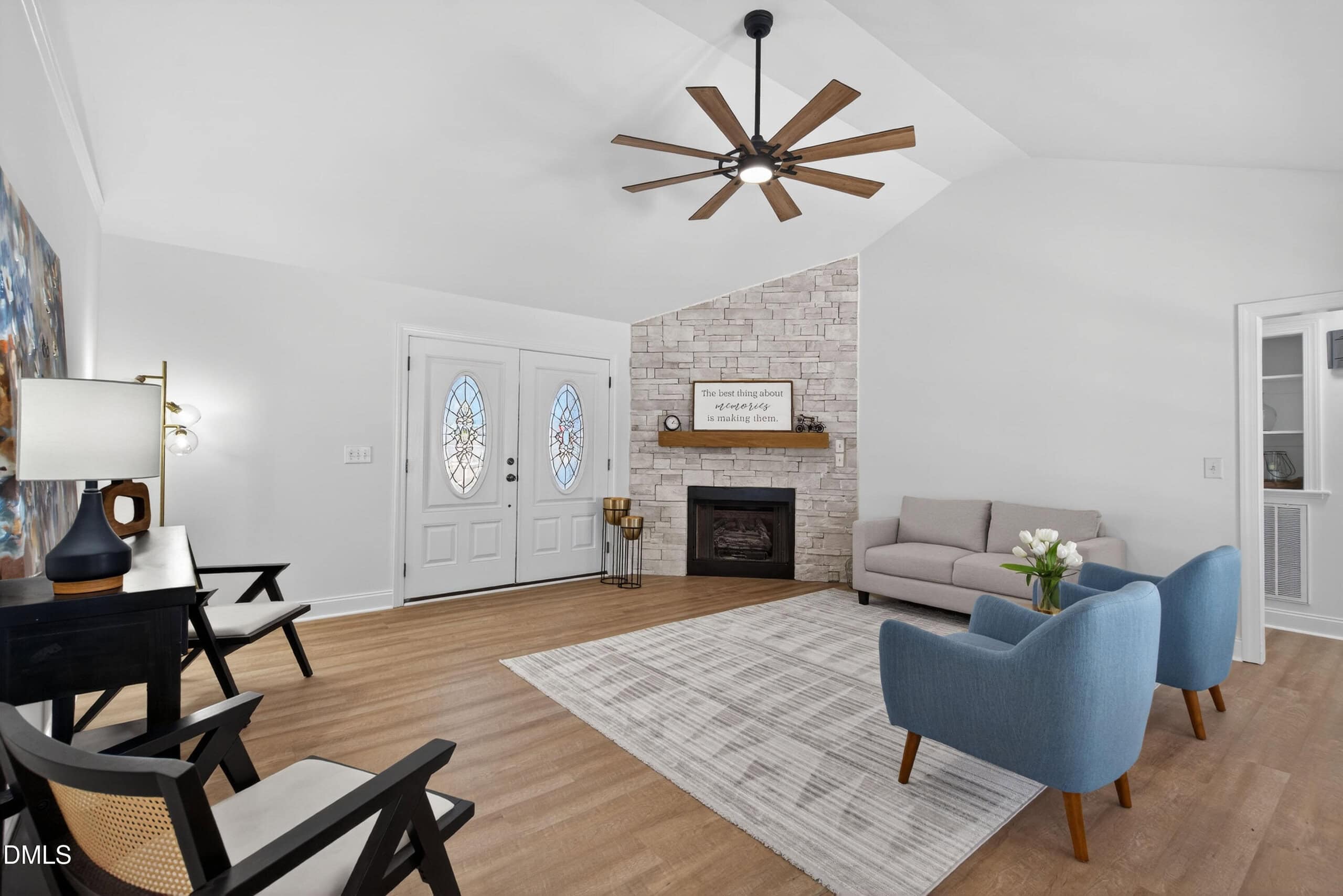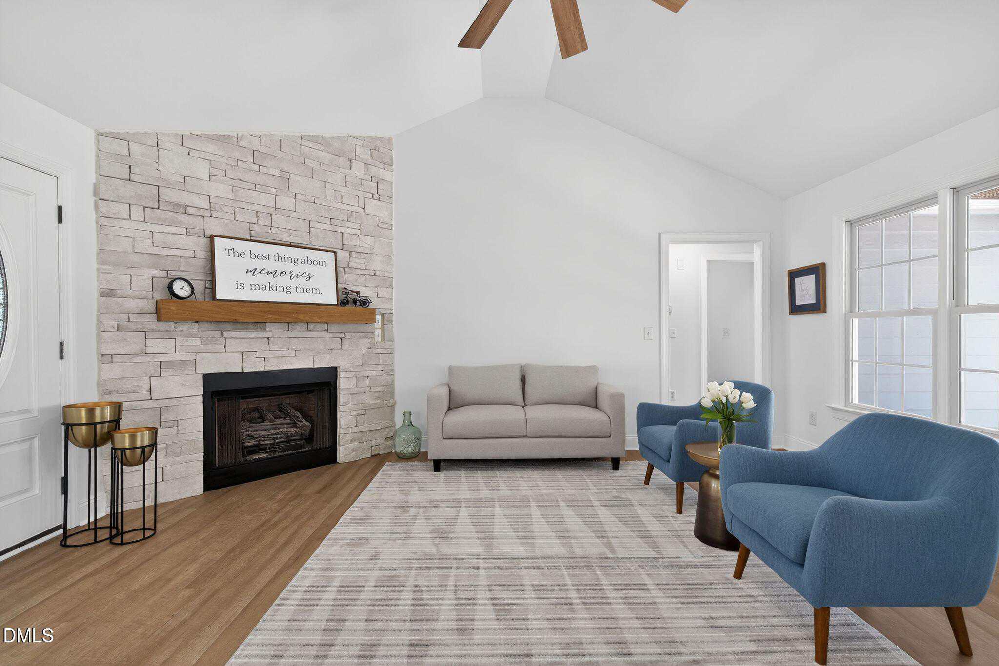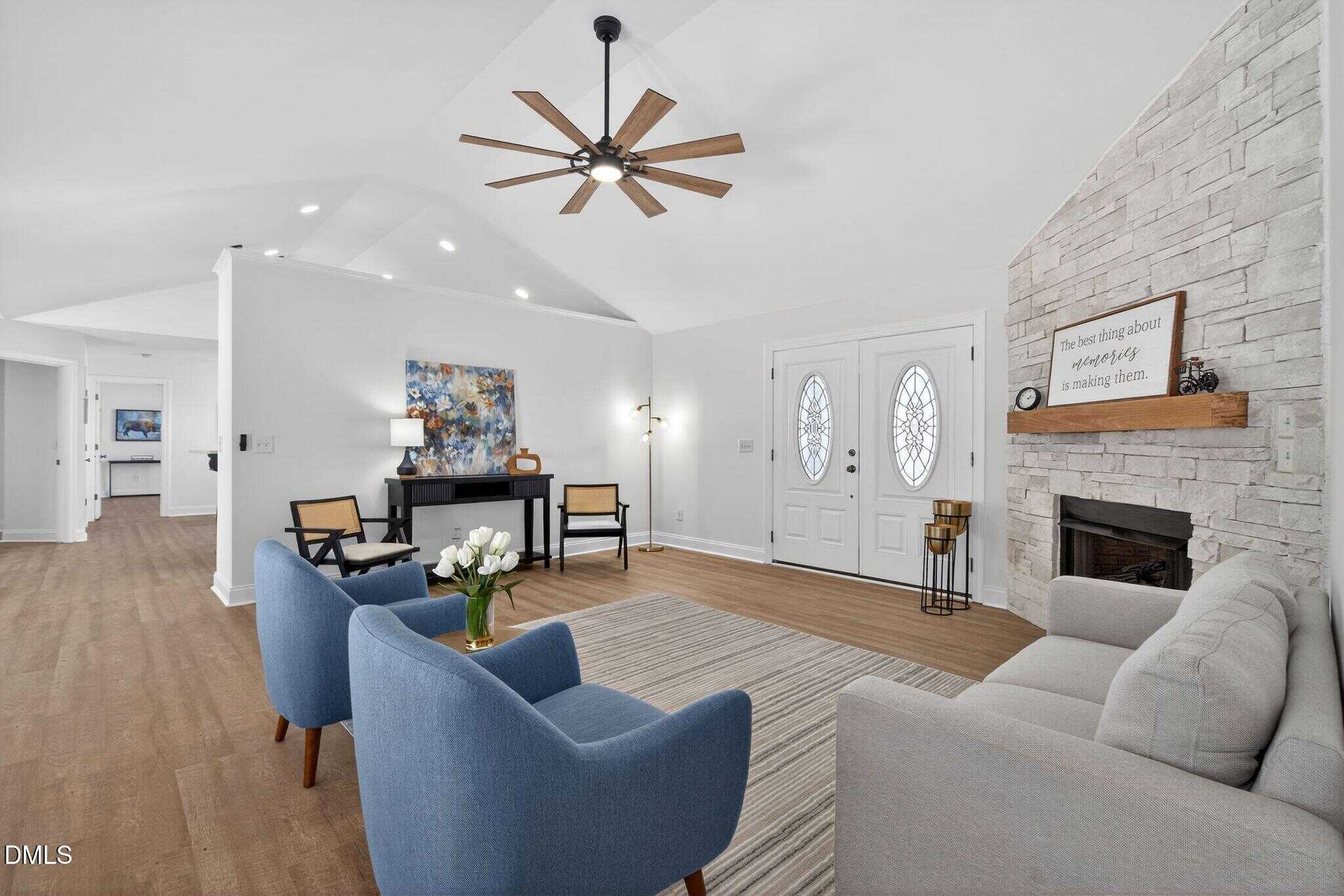 Improvements and upgrades include Flooring, Paint, Lighting, Double vanity, Countertops, Fixtures, a gorgeous stone fireplace and more.