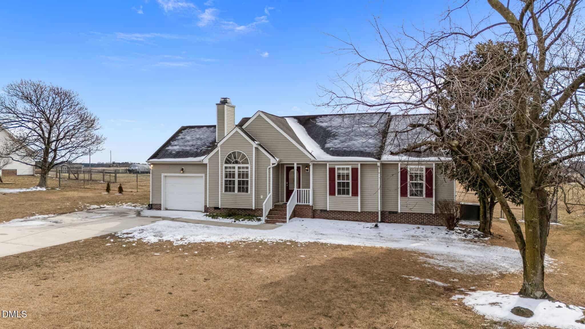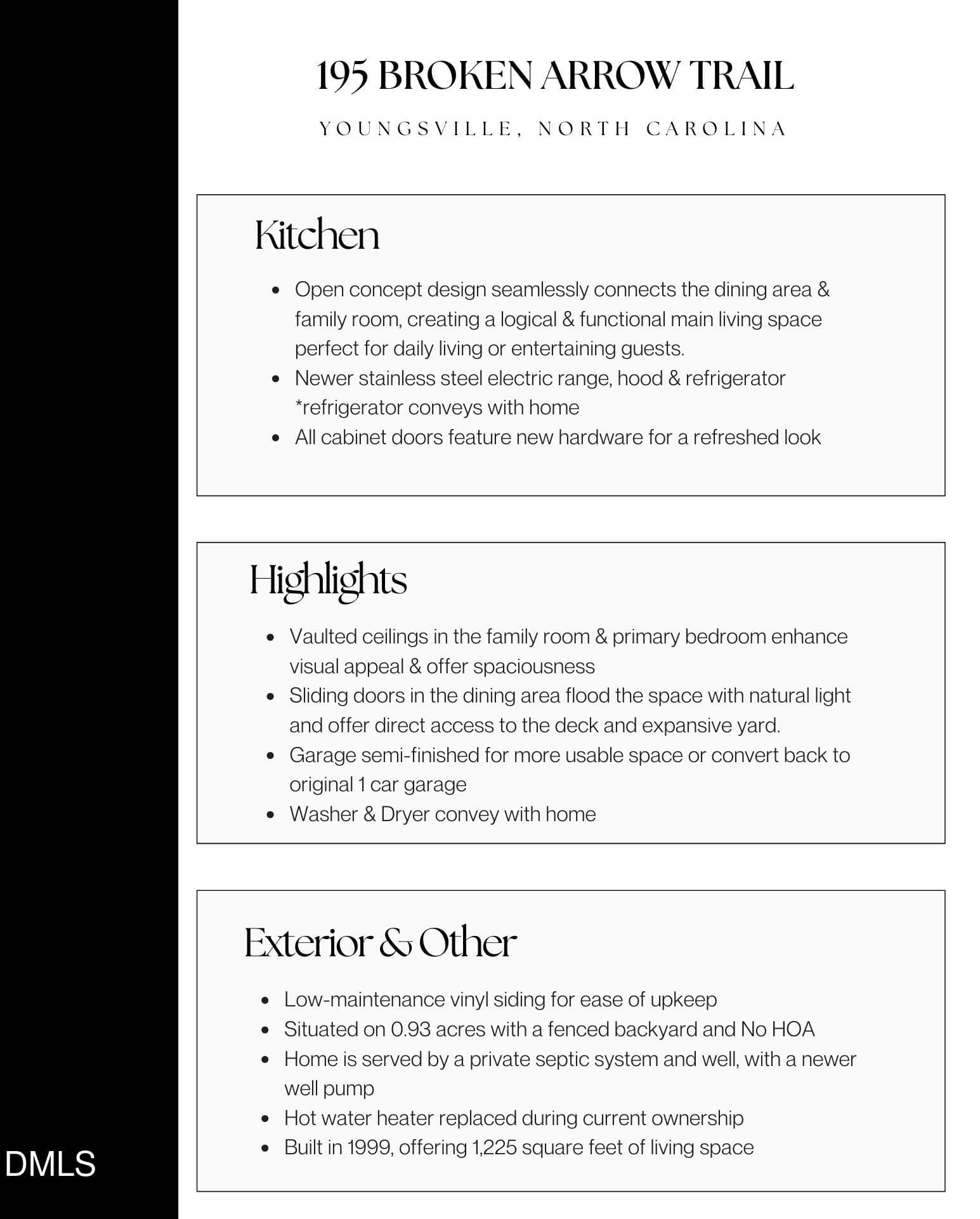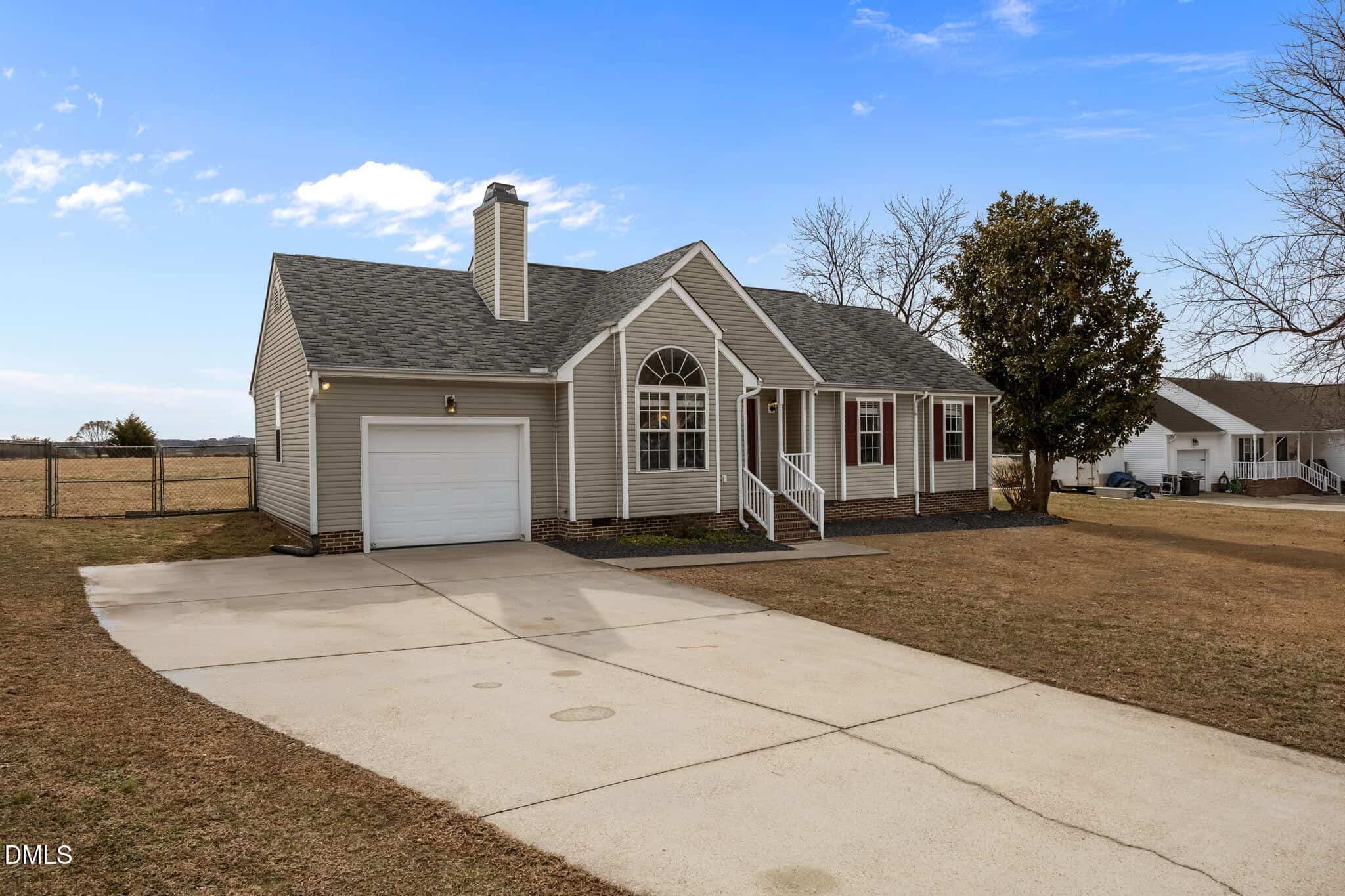 Nestled on an almost 1-acre lot, this charming ranch home offers 1,225 square feet of inviting living area. The spacious primary suite includes a generous walk-in closet and a large ensuite bath for ultimate comfort. Two additional bedrooms provide plenty of space for guests. The kitchen is bright and cheerful with green cabinetry and stainless steel appliances, including a refrigerator that conveys. Enjoy meals in the dining area, which offers a stunning view of the expansive backyard – imagine relaxing here, planting a garden, or playing with the dog in the open space. Situated in an established neighborhood with large lots and no HOA, this home provides the privacy and freedom you’ve been seeking. The property is served by a septic system and well, with newer updates including the water heater and well pump. Whether you’re greeting guests on the welcoming front porch or hosting gatherings on the back deck, this home offers the perfect setting for making memories. Garage is semi-finished (no heat or A/C & no permit for work-”as is”). More usable space, storage space or buyer can convert back to a 1 car garage after moving in!
