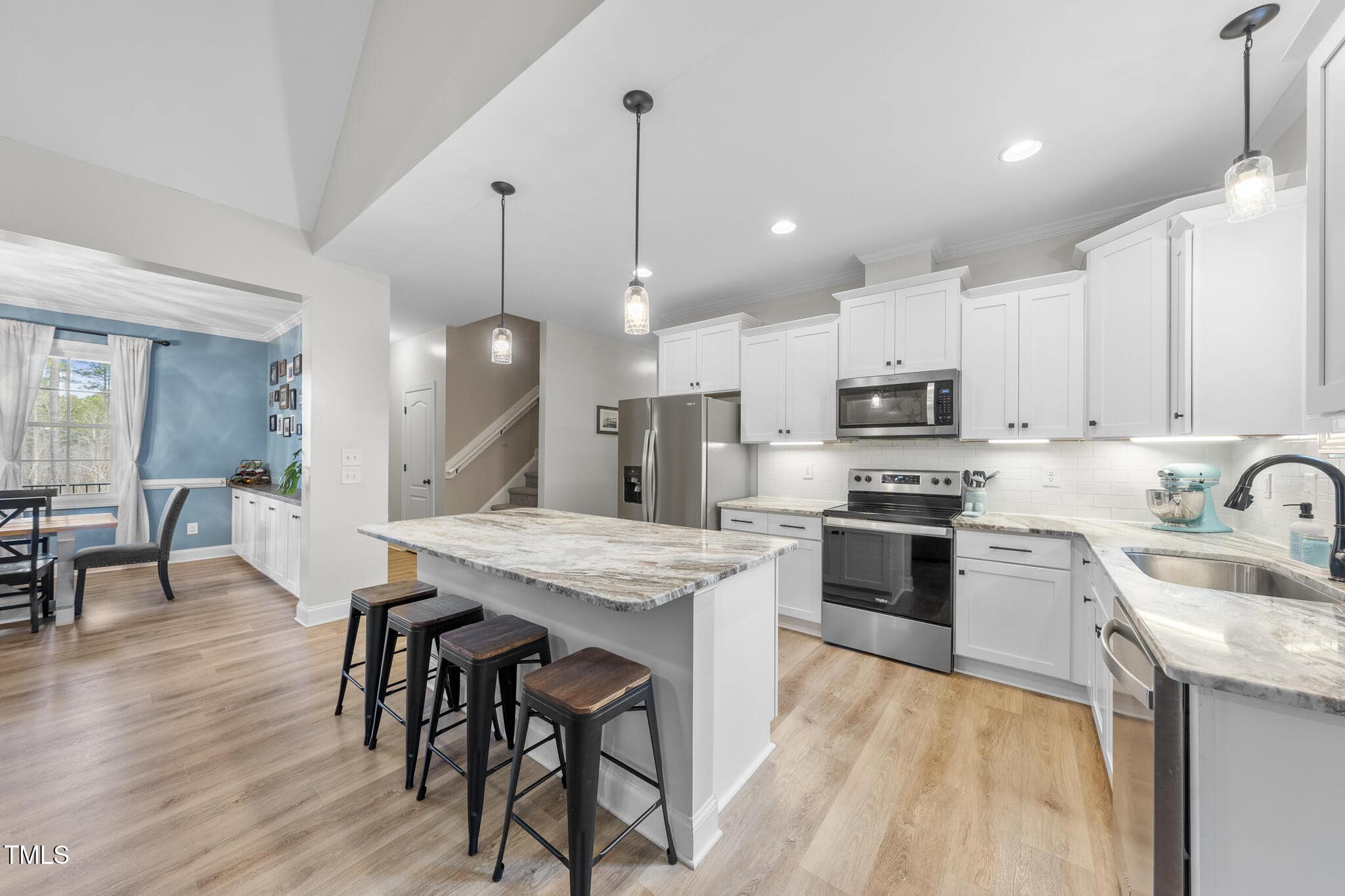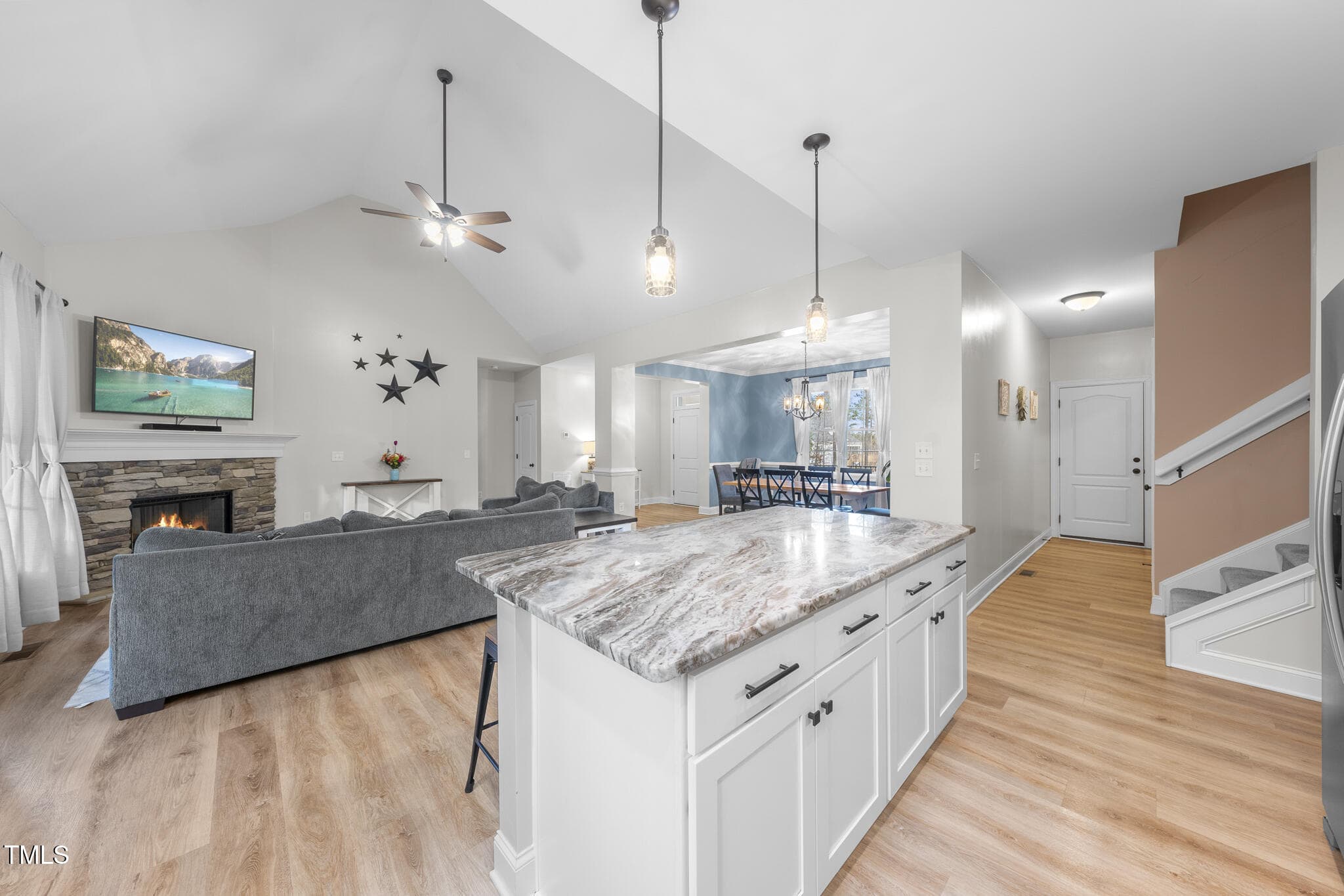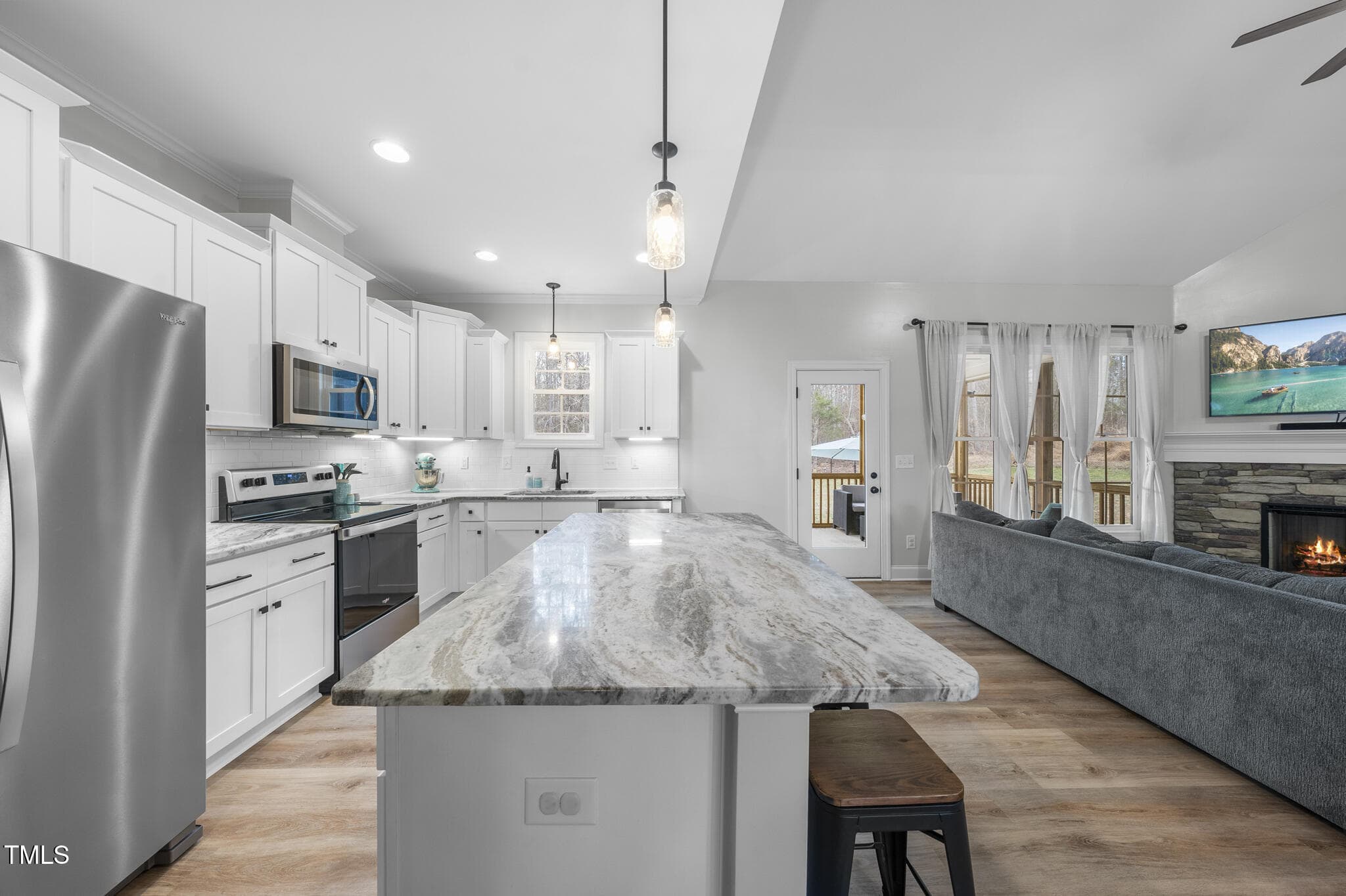 The gourmet kitchen boasts stainless steel appliances, granite counters, a stylish white tile backsplash, and a breakfast bar that flows seamlessly into the spacious living room with a stone fireplace. The first floor primary suite is a true retreat, featuring a spa-like ensuite with a walk-in shower, freestanding soaking tub, and spacious walk in closet. Two additional guest bedrooms share a beautifully appointed bath on the main floor.