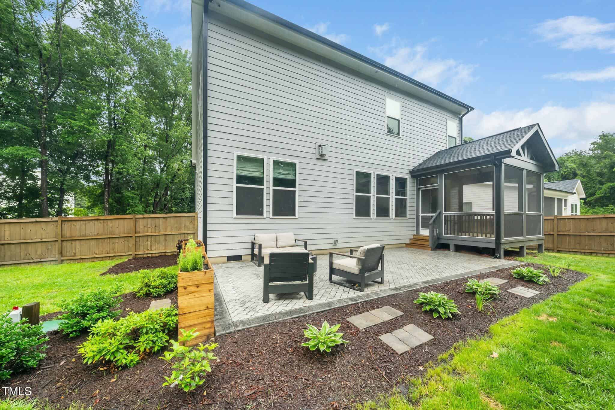 Outdoor amenities include a welcoming front porch, a screened-in back porch, and a concrete patio surrounded by thoughtful landscaping—perfect for relaxing or entertaining. The extended concrete driveway leads to a spacious garage with a protective floor coating, while a 6-foot wood privacy fence surrounds the backyard for added security and peace.