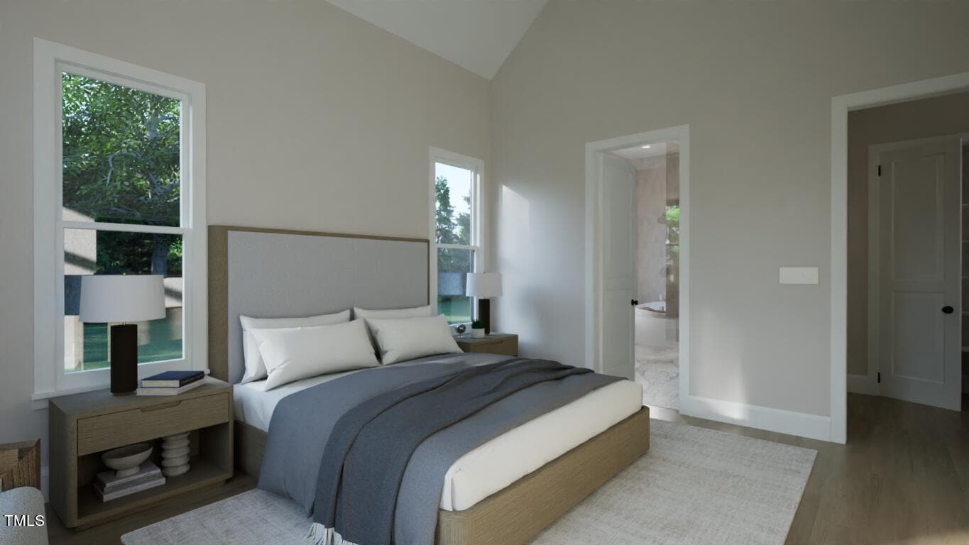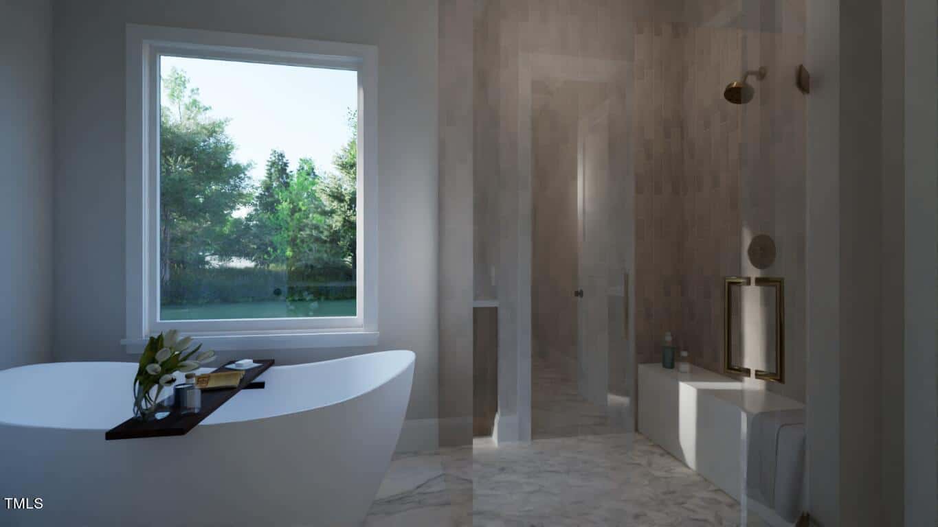 The main level hosts both the owner’s suite and a private guest suite. The owner’s suite features a vaulted ceiling, a luxurious bath with a freestanding tub, and a zero-entry tiled shower with a bench seat. The kitchen centers around a large quartz island with a seamless extension into a connected eat-in table—ideal for gathering and dining—and sits adjacent to a sunlit dining space.