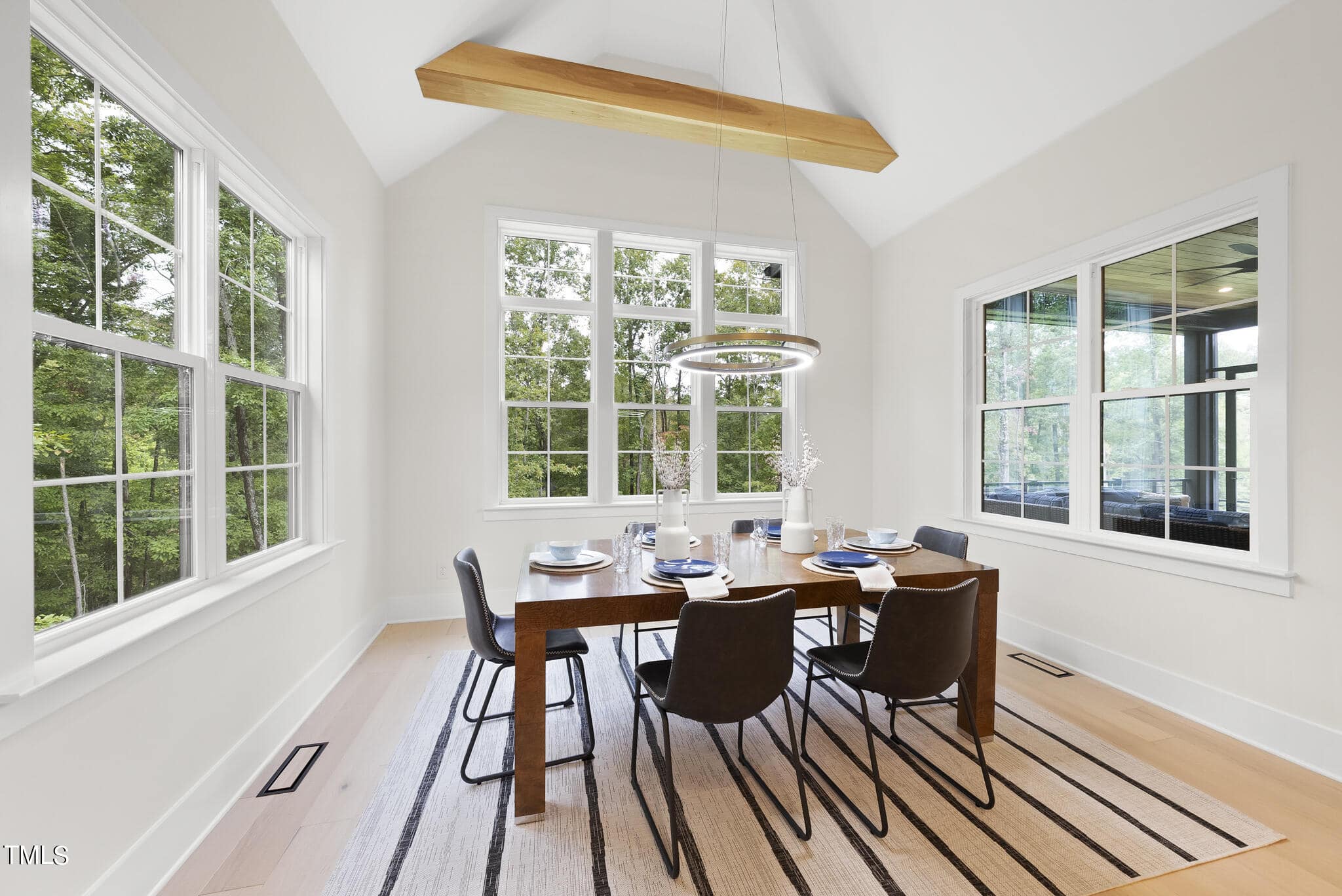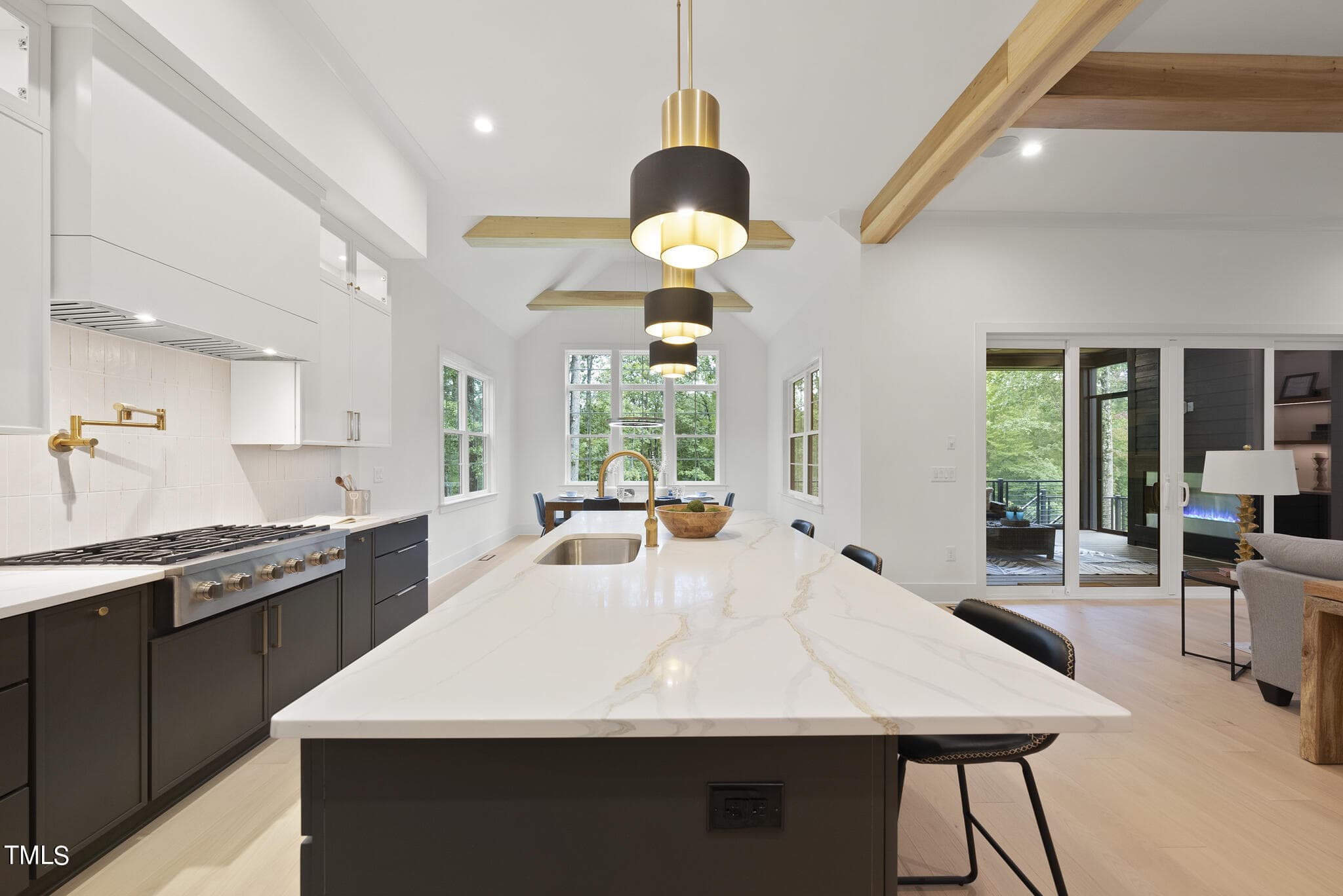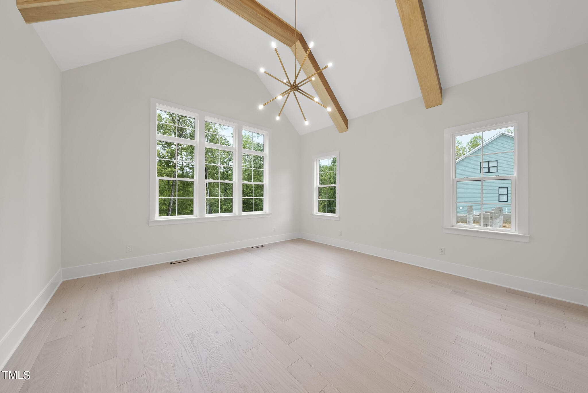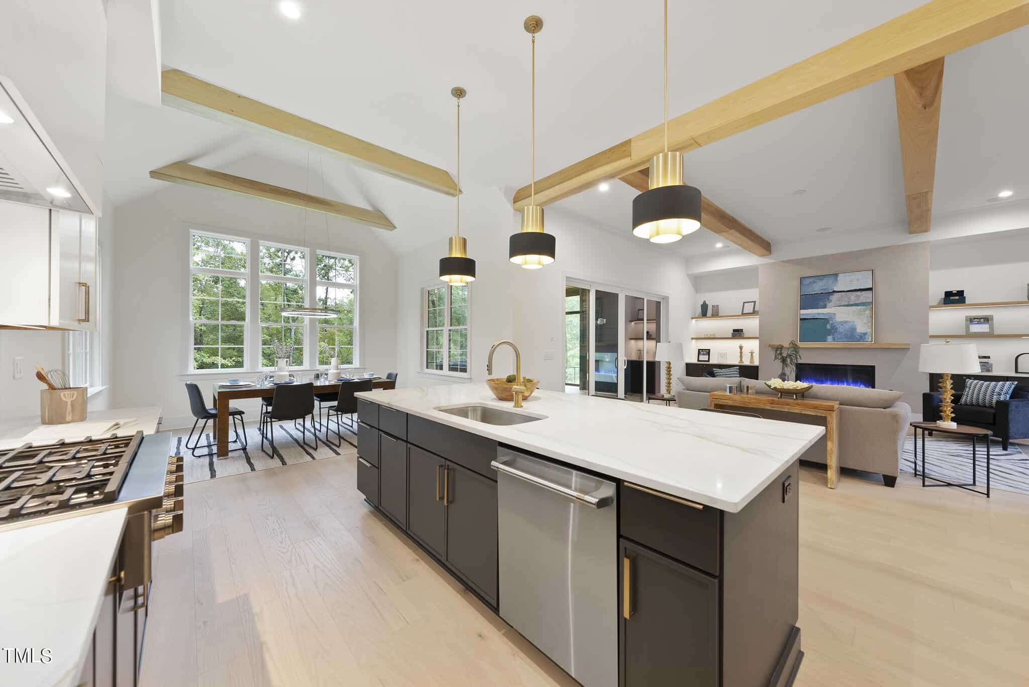 Open to Vaulted Dining Area w Beams Flooded w/Natural Light! Owner’s Suite offers Vaulted Ceiling w/ Beams, Hardwoods & Designer Chandelier! Luxurious Owner’s Bath features Dual Vanity w/Quartz Countertop, Zero Entry Shower with Tile Surround, Freestanding Tub & Spacious Walk in Closet!