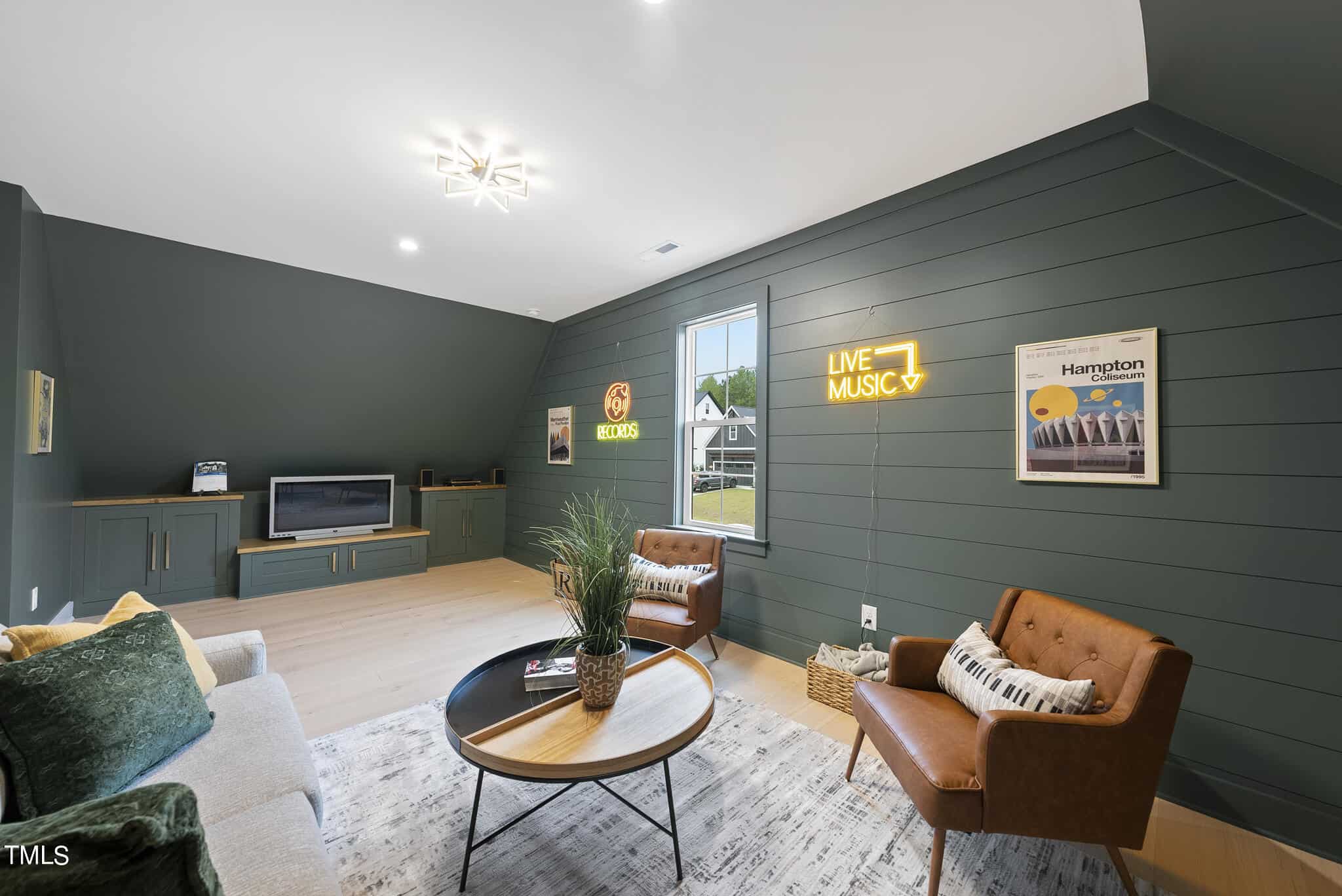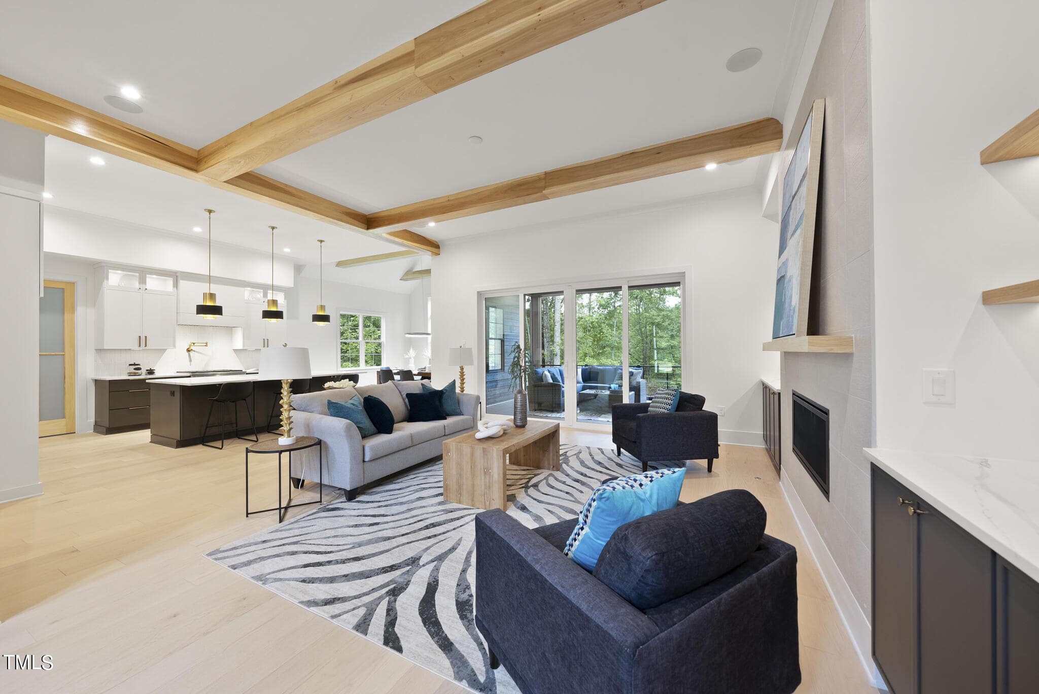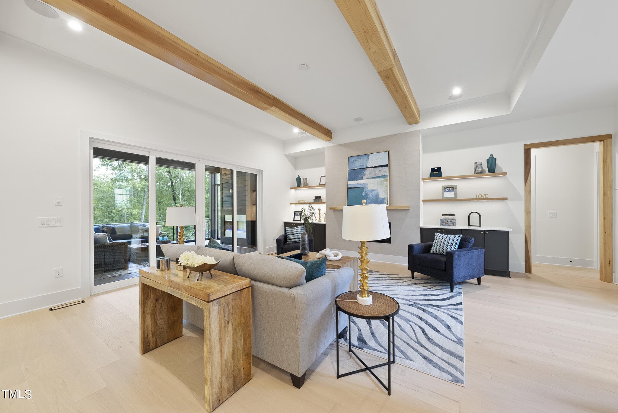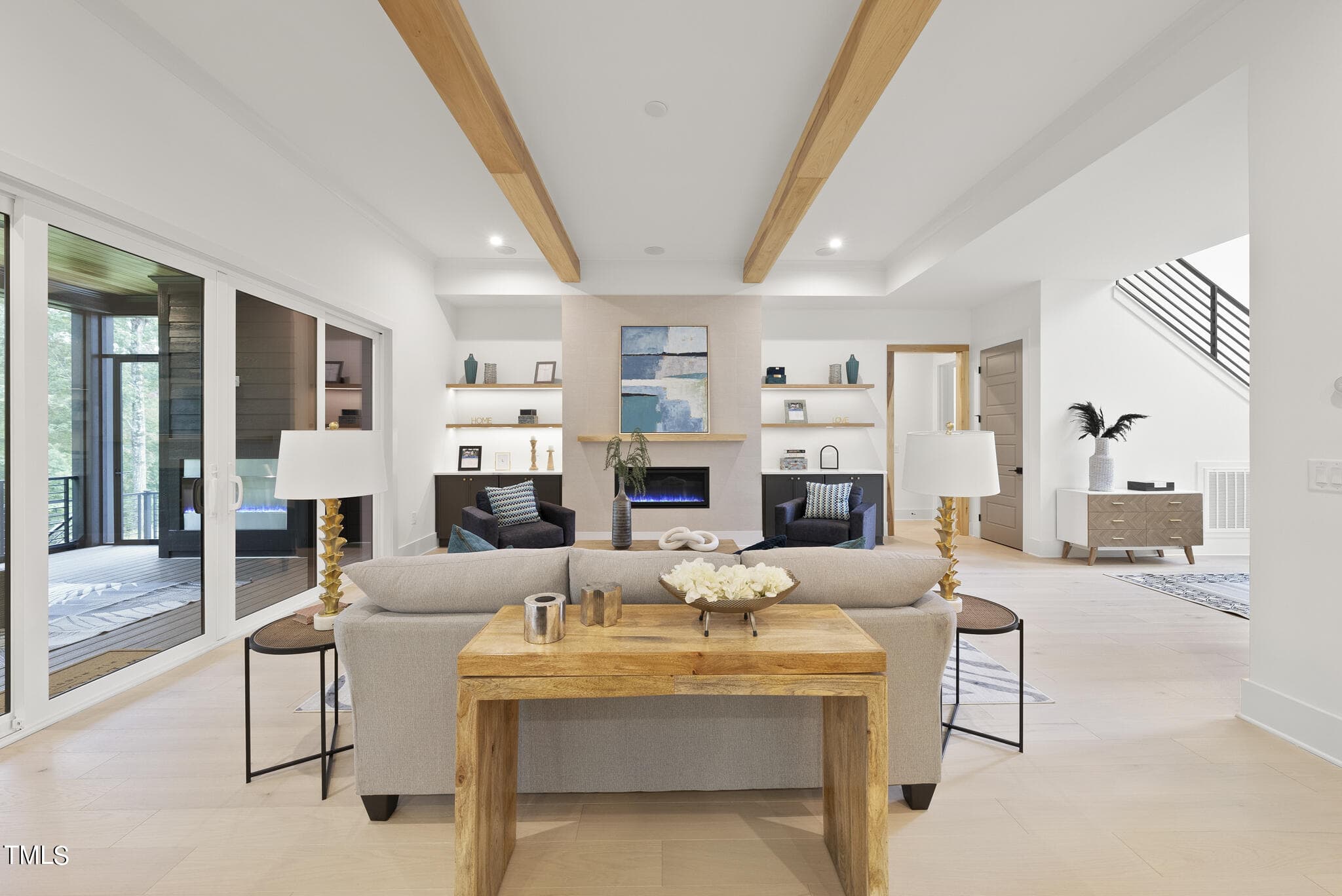 Family Room with Accent Beam Ceiling, Tile Surround Linear Fireplace w/Flanking Built ins & Large Sliders to Screened Porch with an Outdoor Fireplace & Phantom Screen! 2nd Floor Oversized Gameroom w/Wet Bar, Storage Areas & Spacious Secondary Bedrooms!
