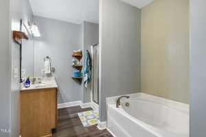 Main floor boasts great room with fireplace, kitchen with stainless steel appliances and granite countertops, plus first floor primary with double walk-in closet, double vanity, walk-in shower and separate soaking tub. Three additional bedrooms on second floor plus huge bonus room. New water heater, shed, & windows. HVAC new in 2021.