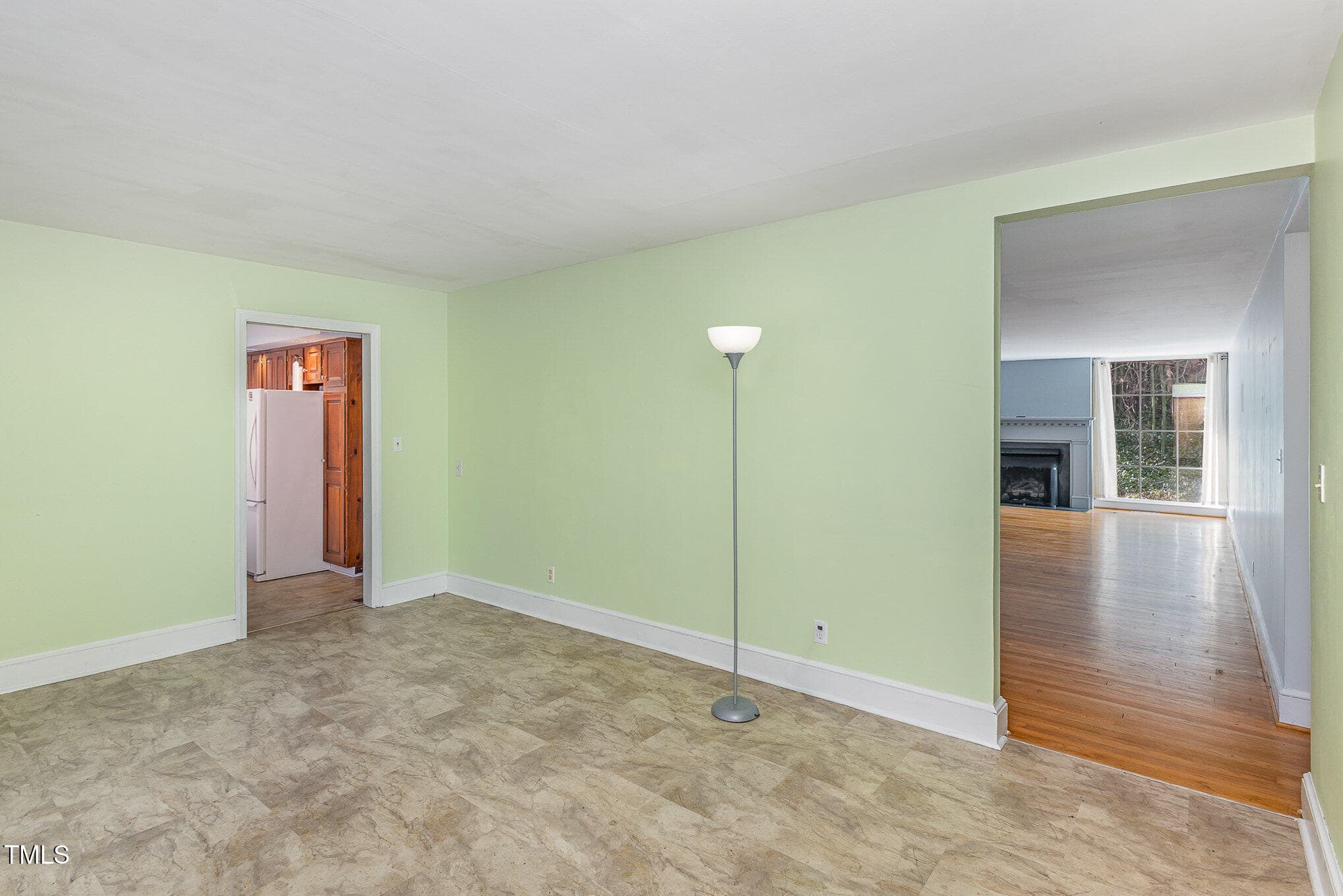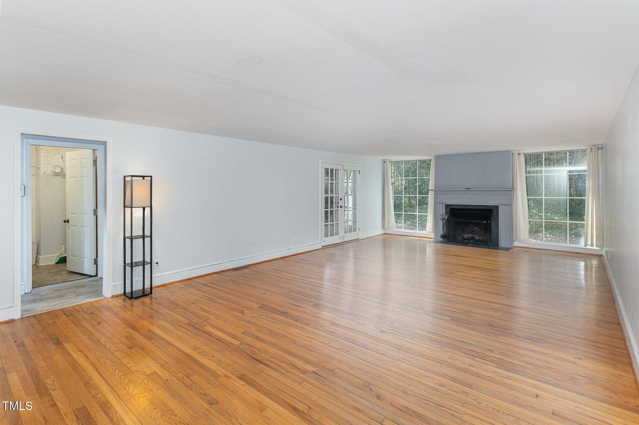 The large front porch enters into a sunny room that can serve as a formal greeting space for visitors or for dining. The great room features a wide fireplace flanked by floor-to-ceiling windows that look over a fenced-in backyard. French doors lead to a screened porch.