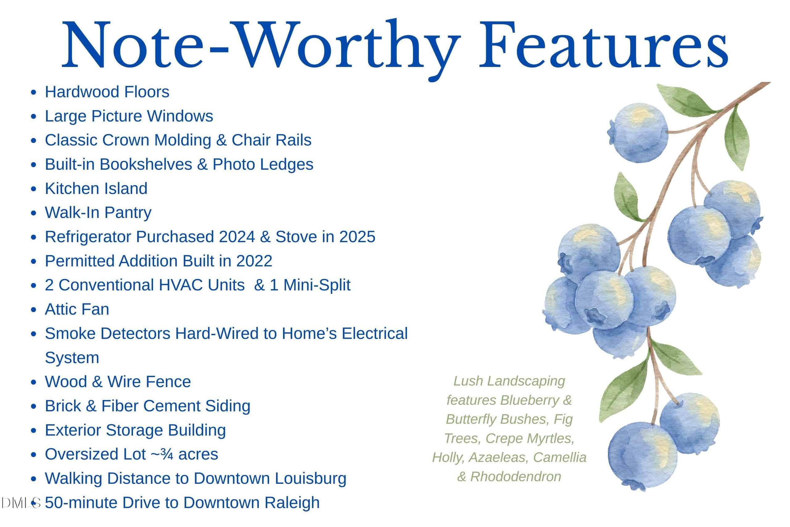 Outside, you’ll find 3/4 of a acre of usable, flat fenced yard. There’s plenty of space for dogs to run or for children to play soccer or for gardeners to grow tomatoes, asparagus and other summertime bounties. Fig trees, blueberry bushes, camellia and rhododendron make the land fruitful, beautiful and fragrant. The city of Louisburg allows chickens too — for those who want farm fresh eggs every morning even within city limits. Speaking of city, if you’ve never visited Louisburg, leave your car on John Street and walk to the quaint downtown to enjoy restaurants, shopping, bars and Louisburg College. If you’re itching for a night in the Big City, hop on 401 and head to downtown Raleigh. Within an hour, you’re in the midst of the Raleigh nightlife and weekend festivals.