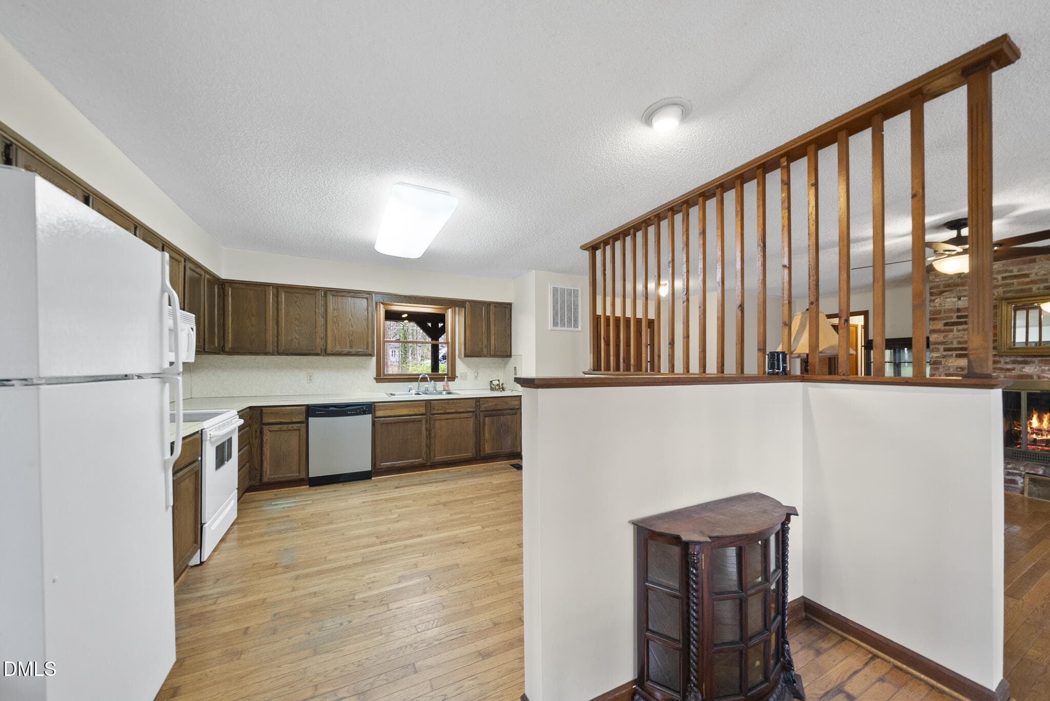 Relax on the inviting rocking chair front porch or unwind on the back deck overlooking a serene, wooded backyard. Inside, the home features an open kitchen and living area with warm hardwood flooring and a beautiful masonry fireplace in the living room, creating a cozy focal point for gathering and relaxing.