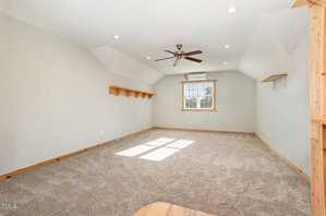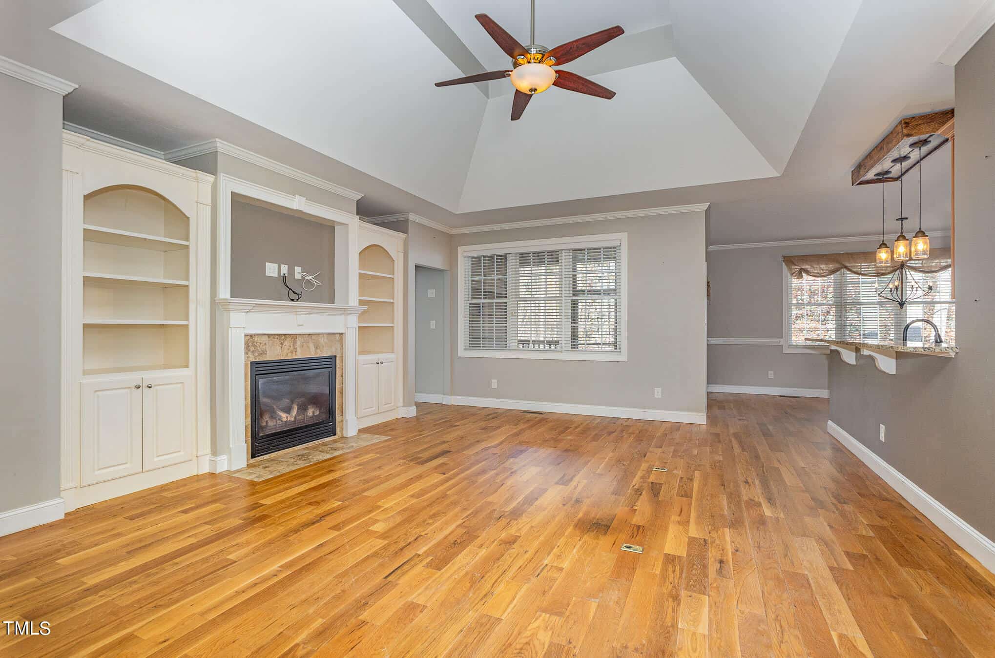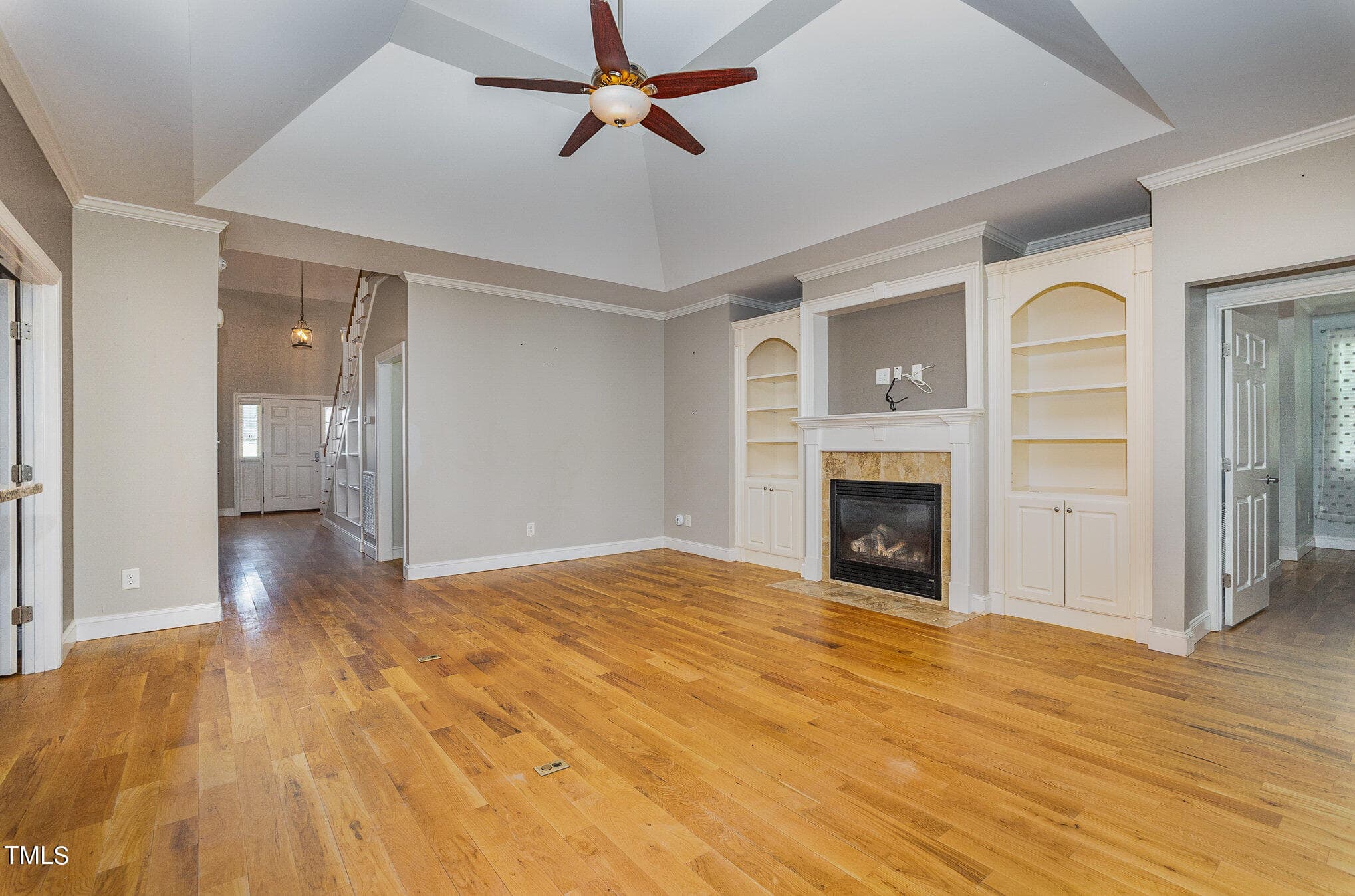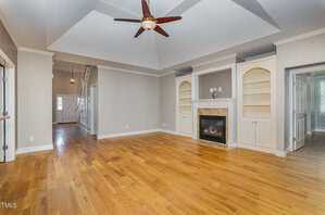 Spacious family room with gorgeous built-in shelves & cabinets.