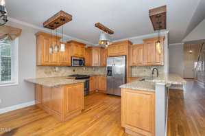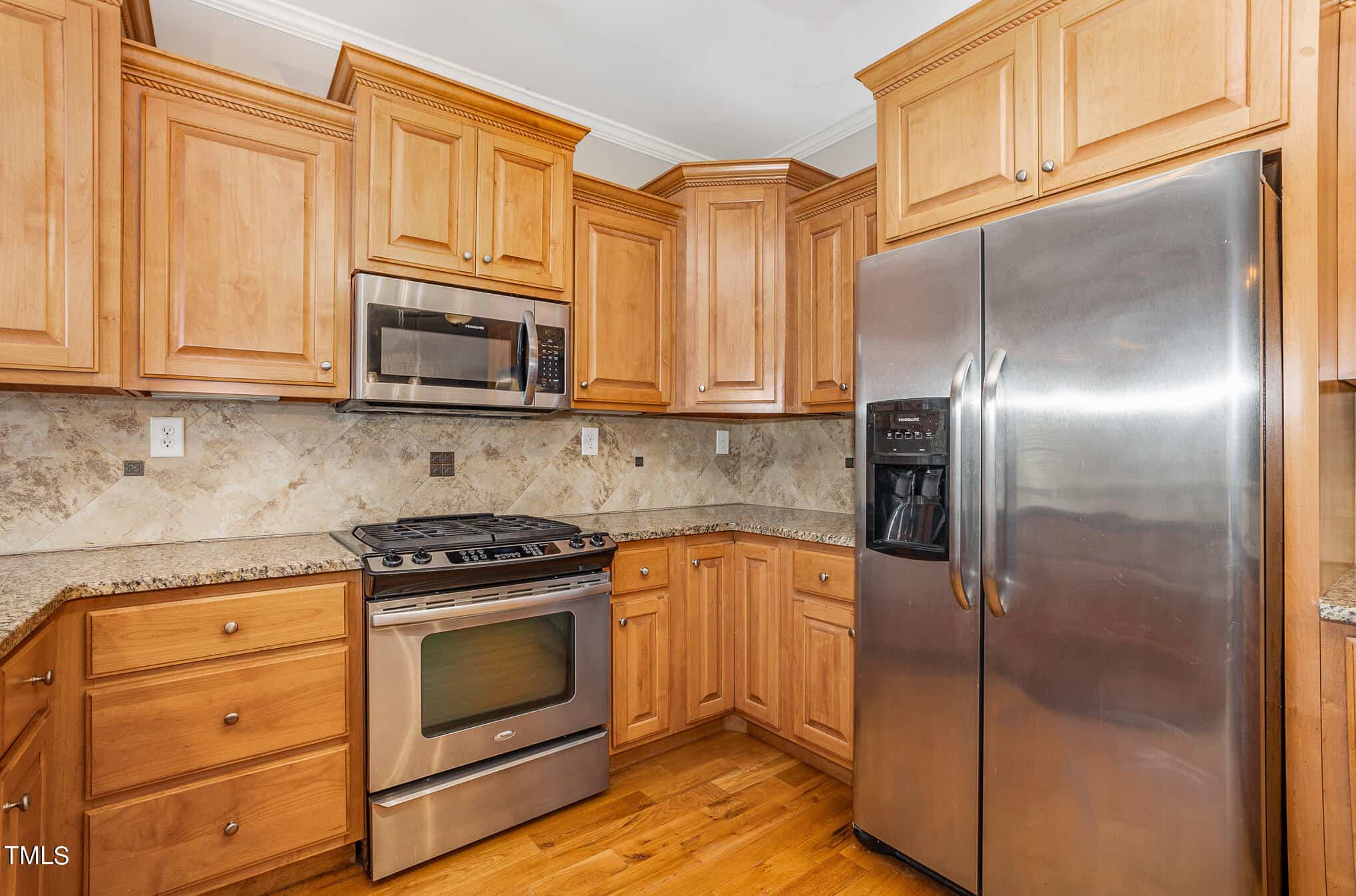 Gourmet chef’s kitchen with granite countertops, raised panel cabinets, SS appliances, spacious breakfast room.