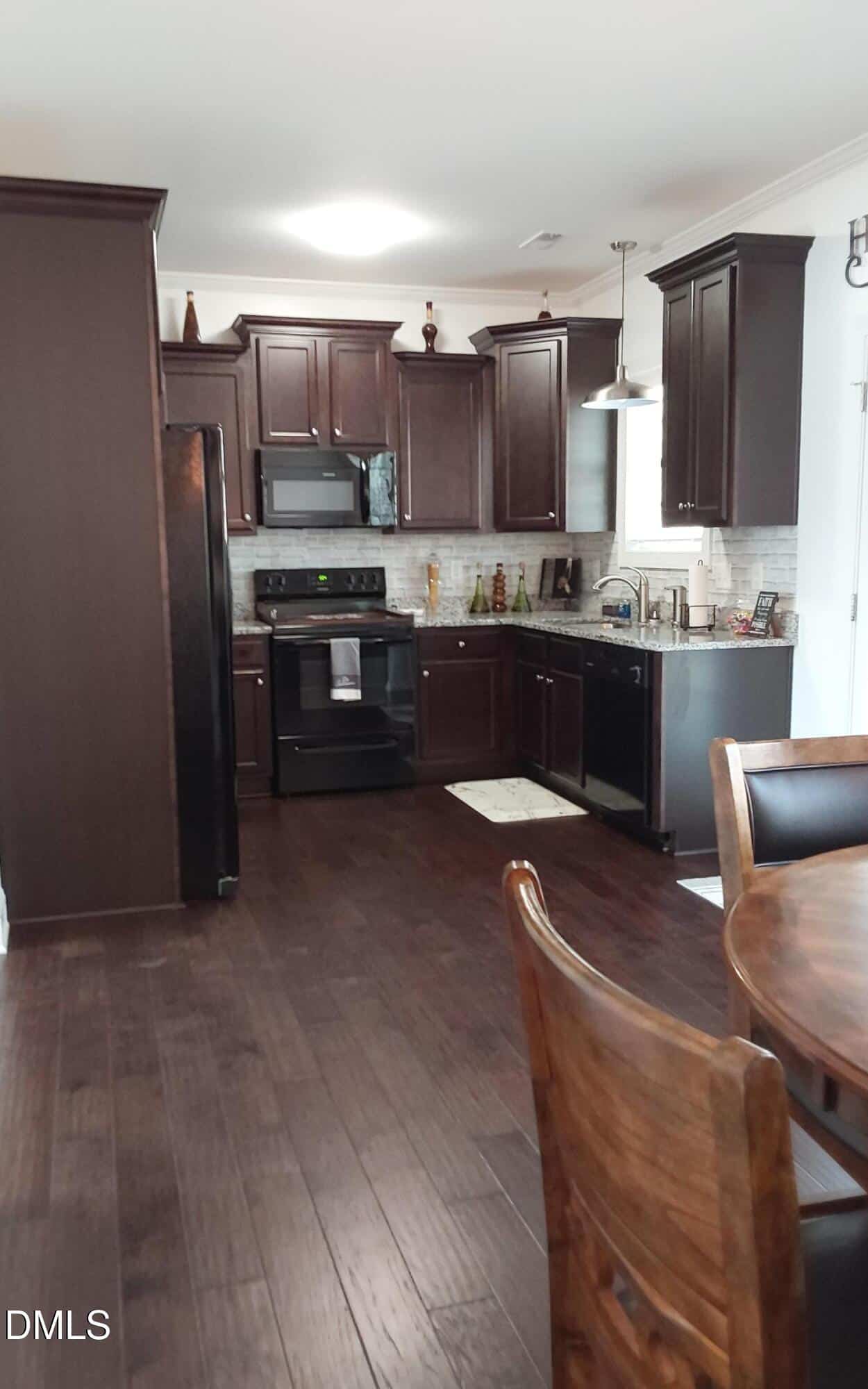 The cozy family room features gas log fireplace and flows seamlessly into the kitchen and dining area–perfect for both relaxing and entertaining.