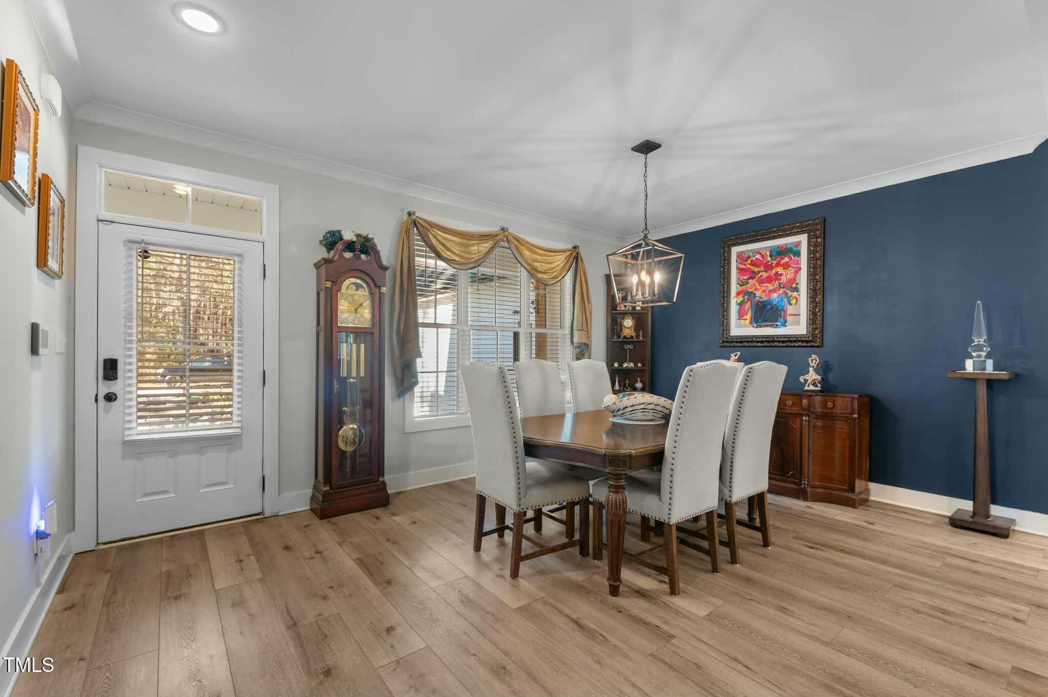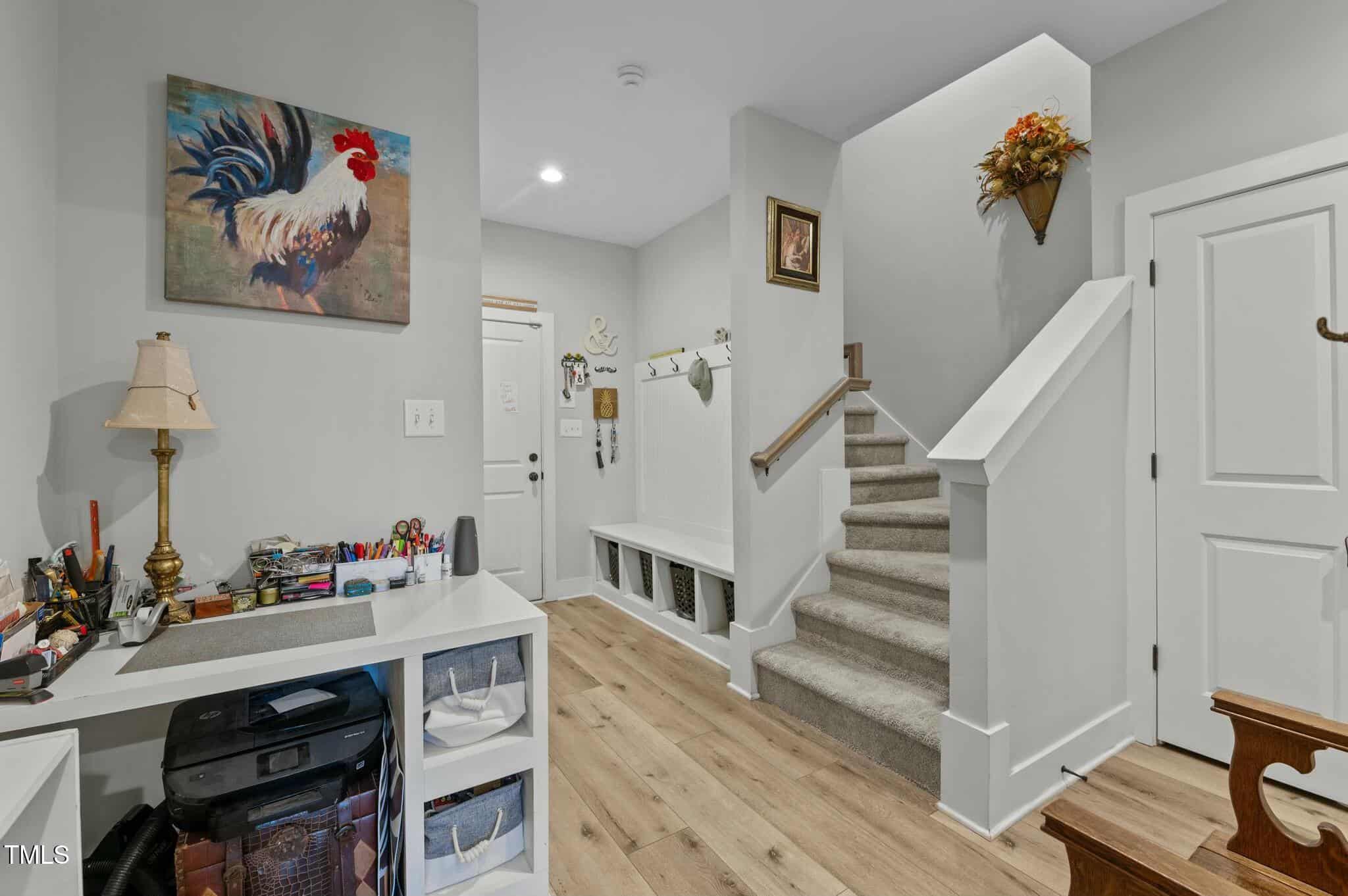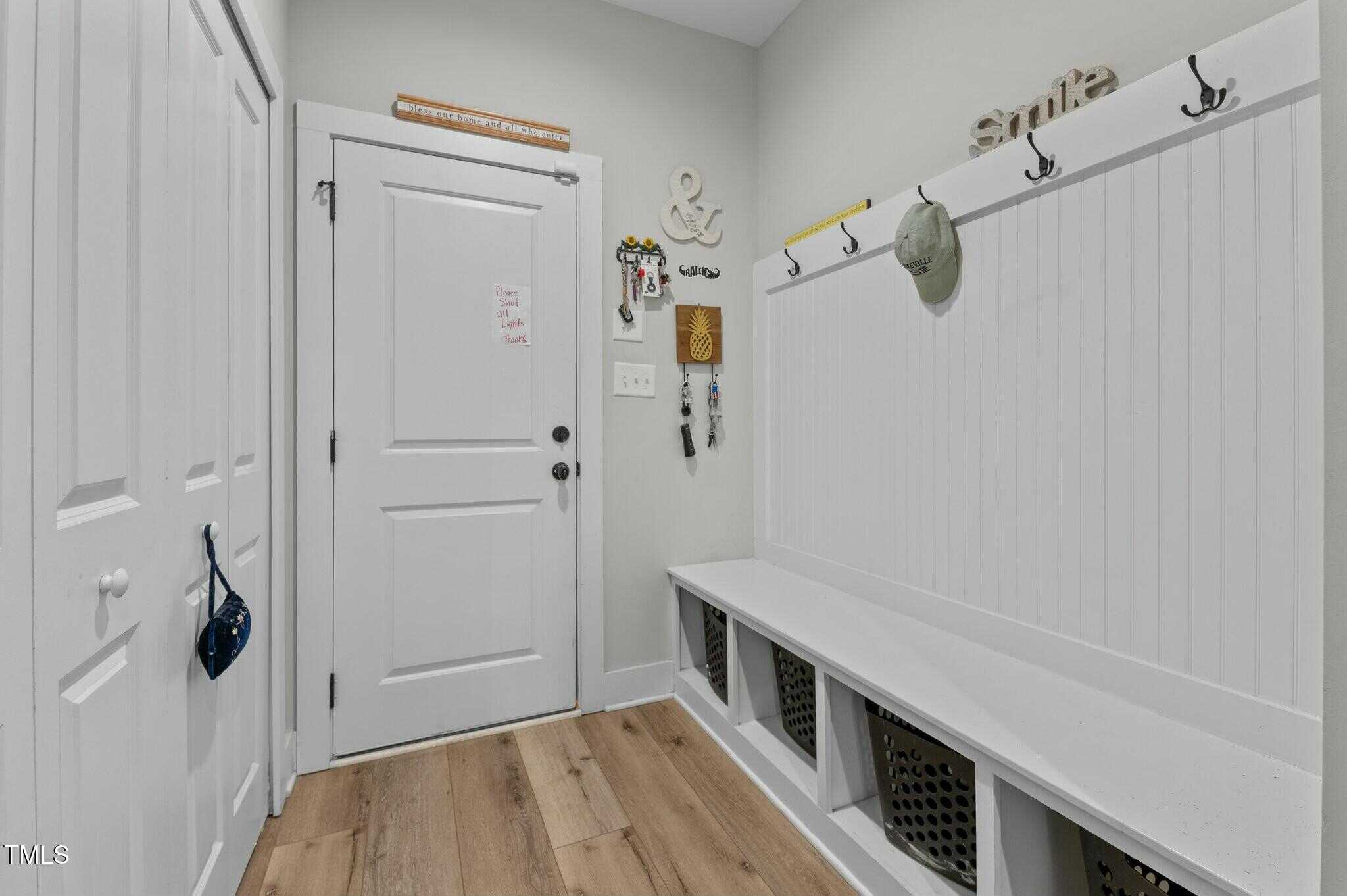 Welcome to 225 Rudd Rd in Youngsville, NC – a stunning 3-bedroom, 3-bathroom custom transitional 1.5-story home that offers the perfect combination of modern elegance and peaceful country living. With 2,033 square feet of thoughtfully designed space, this home features upgraded LVP flooring throughout the main floor, including the luxurious primary suite. The custom details are abundant, including a drop zone with a bench, cubbies, and hooks, as well as built-in wood cabinetry and shelving in the family room that add both functionality and charm.