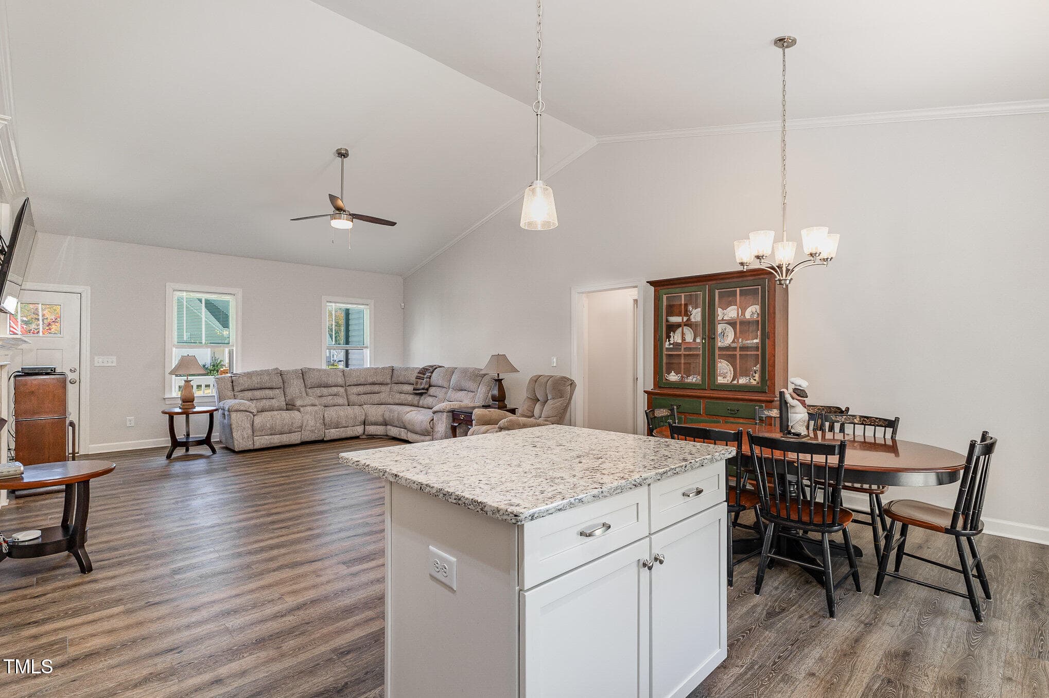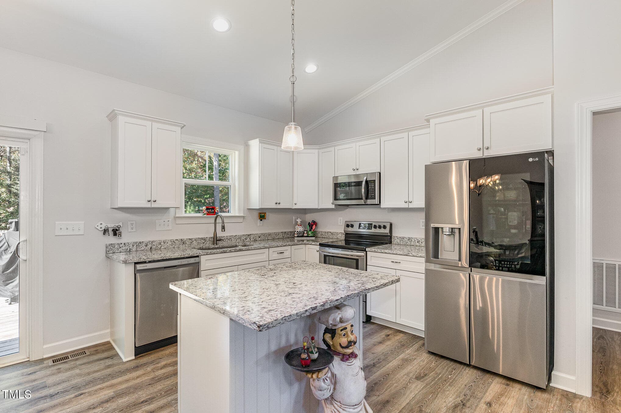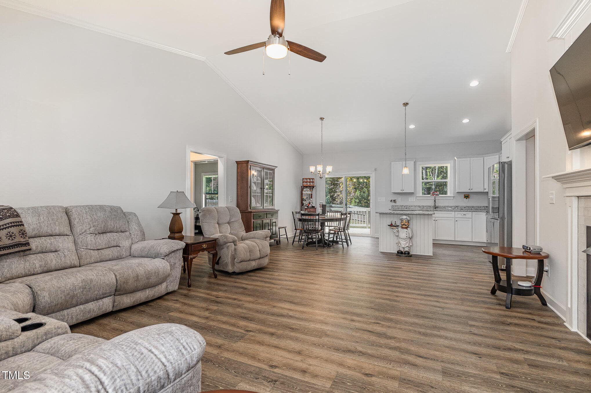 Open floorplan with upgraded LVP through main living area, vaulted ceiling, custom gas log fireplace and custom trim. Kitchen boasts Granite counters, custom cabinetry, S/S appliances, center island & lazy susan/soft-close drawers!