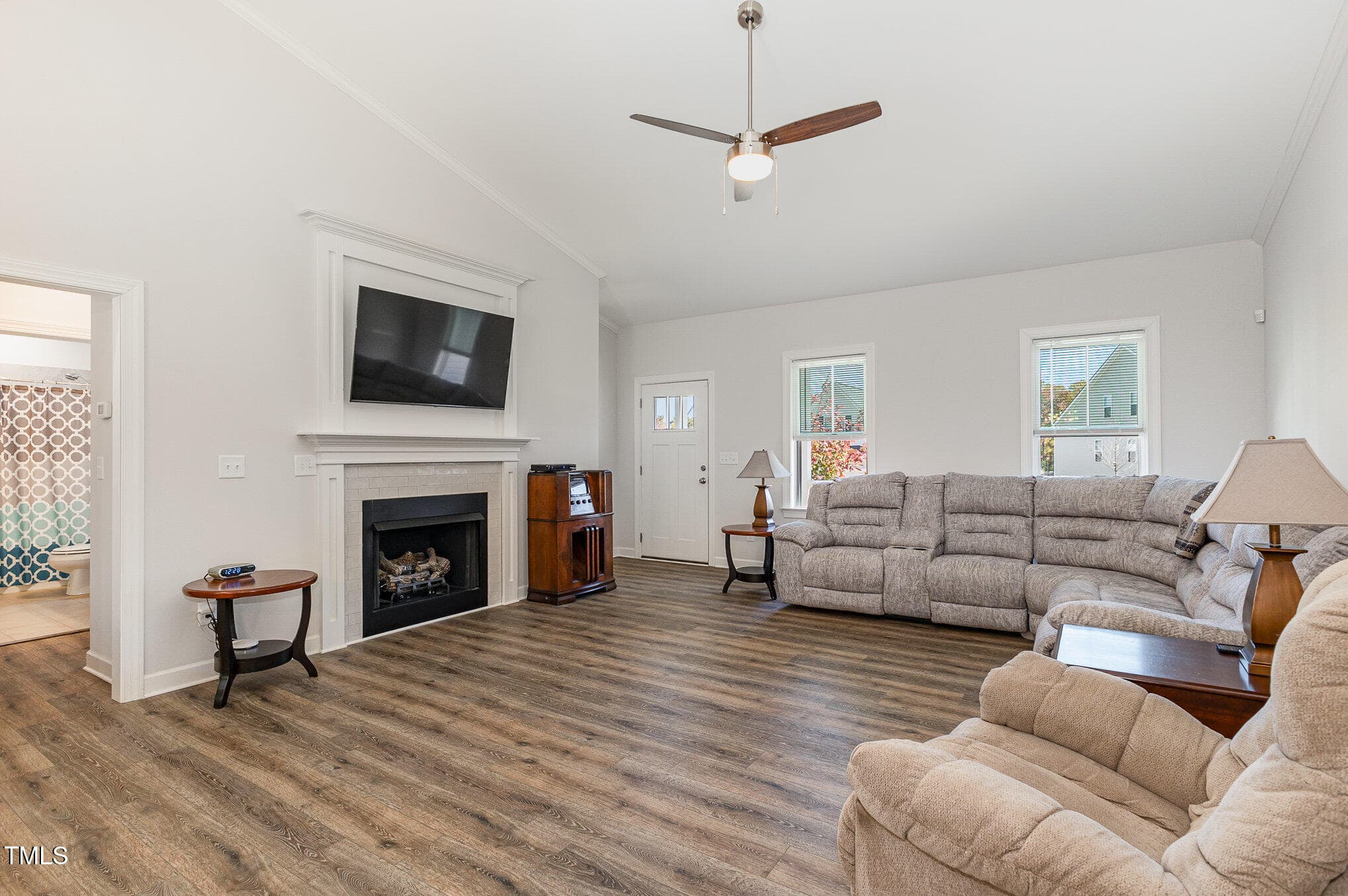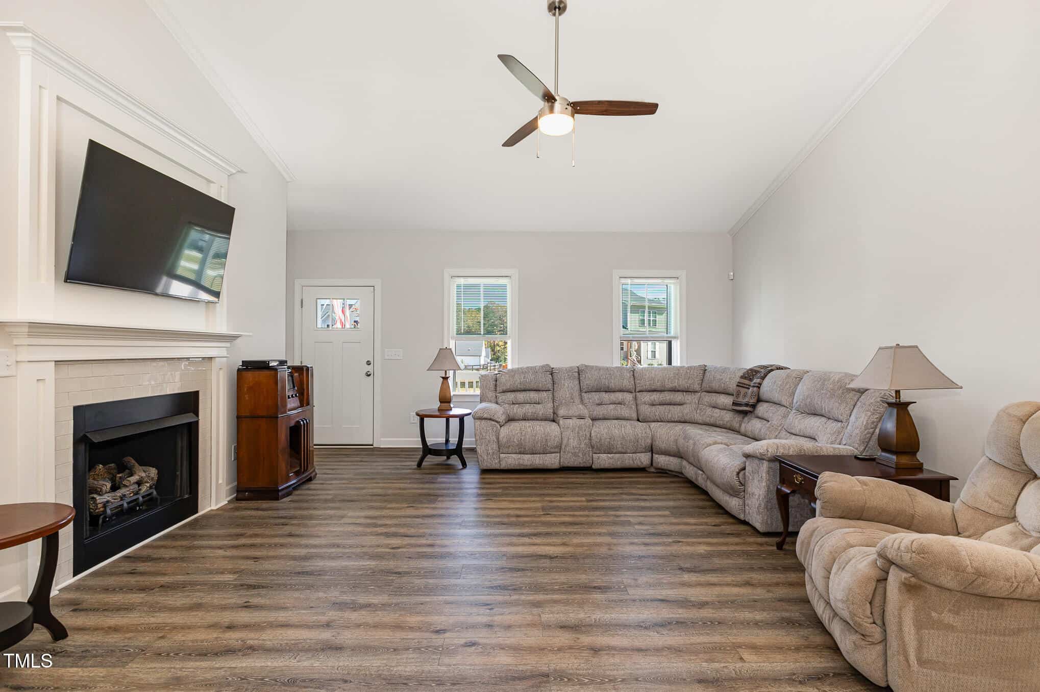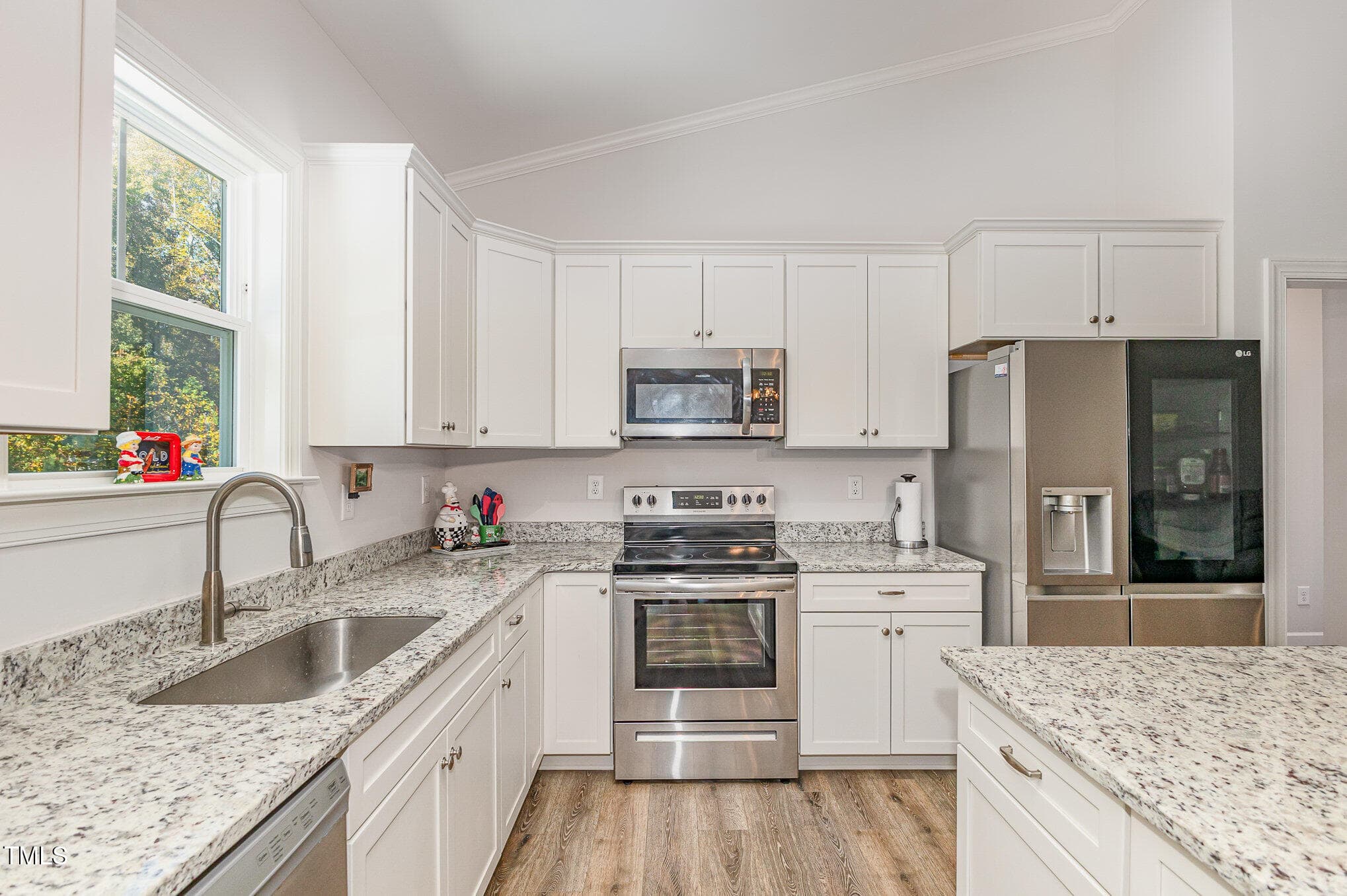 Open floorplan with upgraded LVP through main living area, vaulted ceiling, custom gas log fireplace and custom trim. Kitchen boasts Granite counters, custom cabinetry, S/S appliances, center island & lazy susan/soft-close drawers!