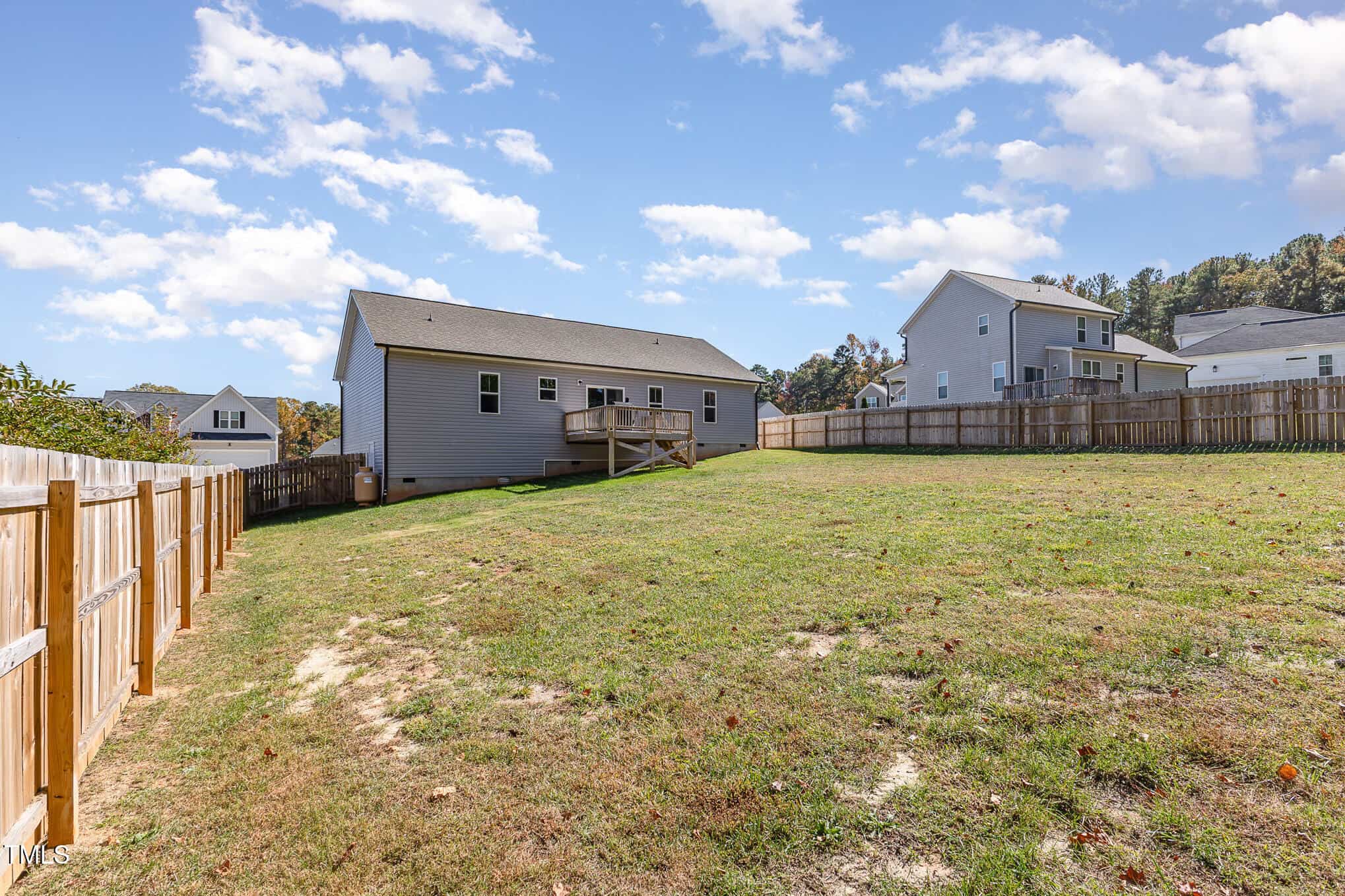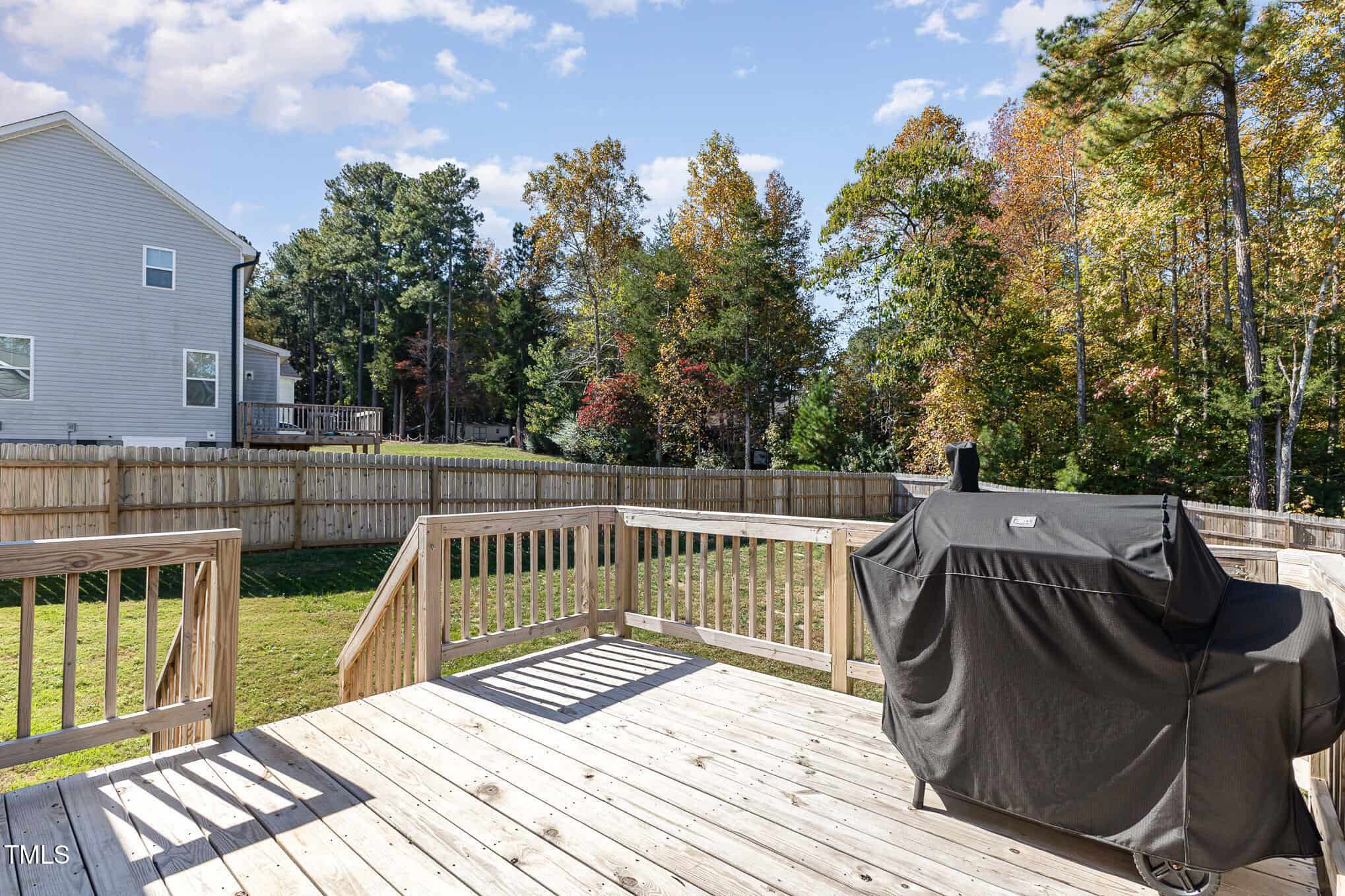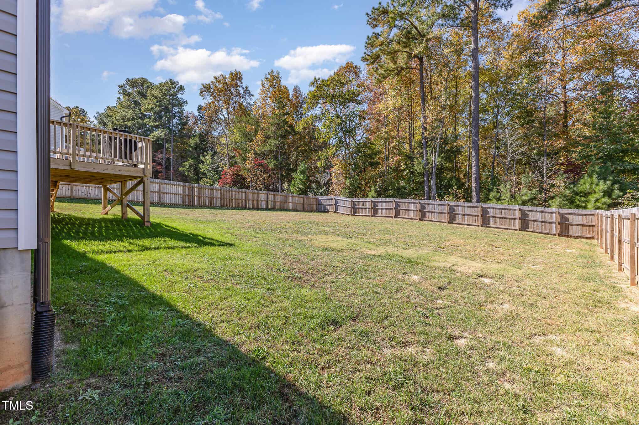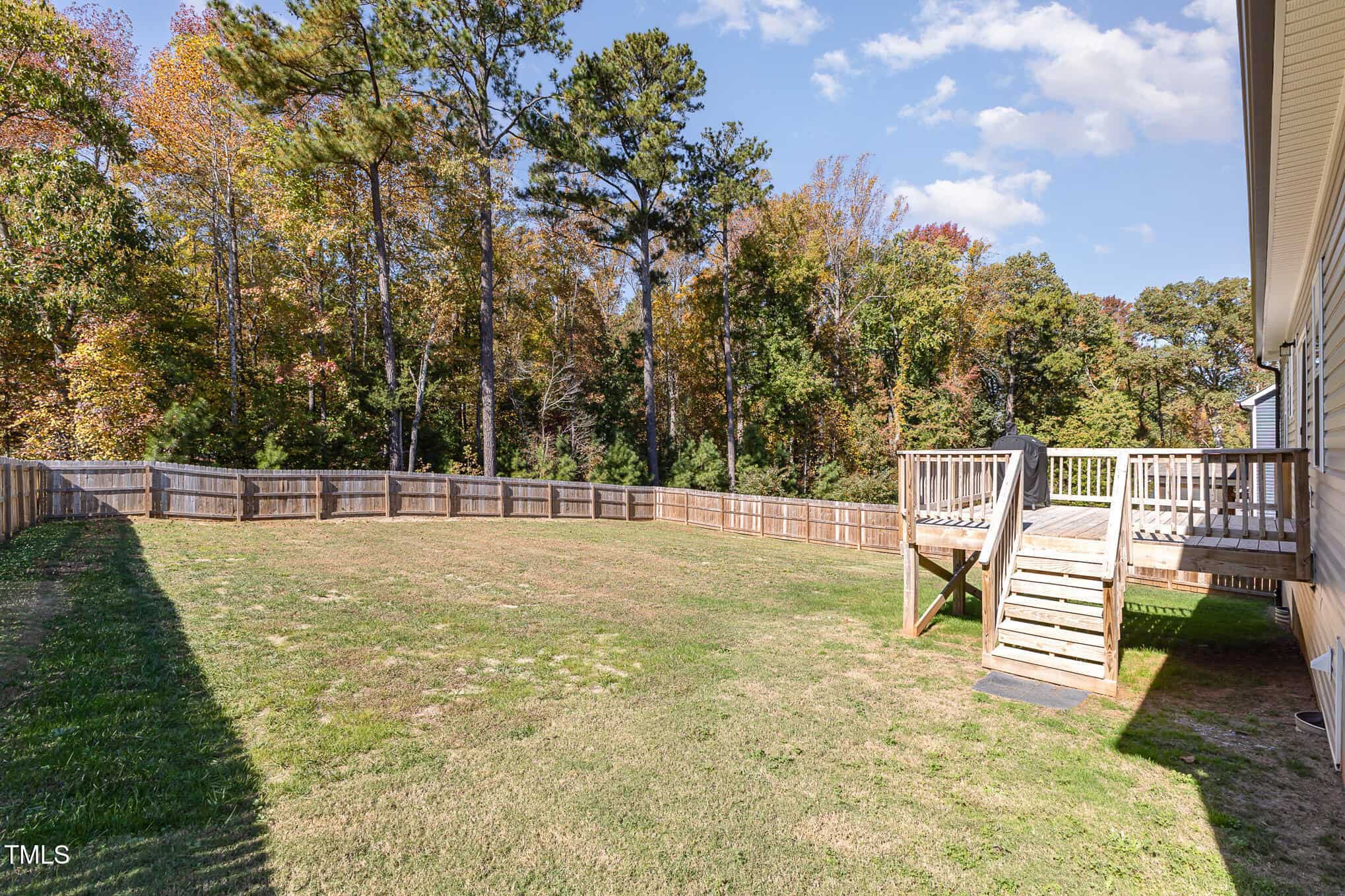 Large bedrooms (all with ceiling fans), large closets, tiled baths. Slider to deck overlooking private, fully fenced back yard. Washer, dryer, refrigerator & security system convey! Great Youngsville location – move-in ready!