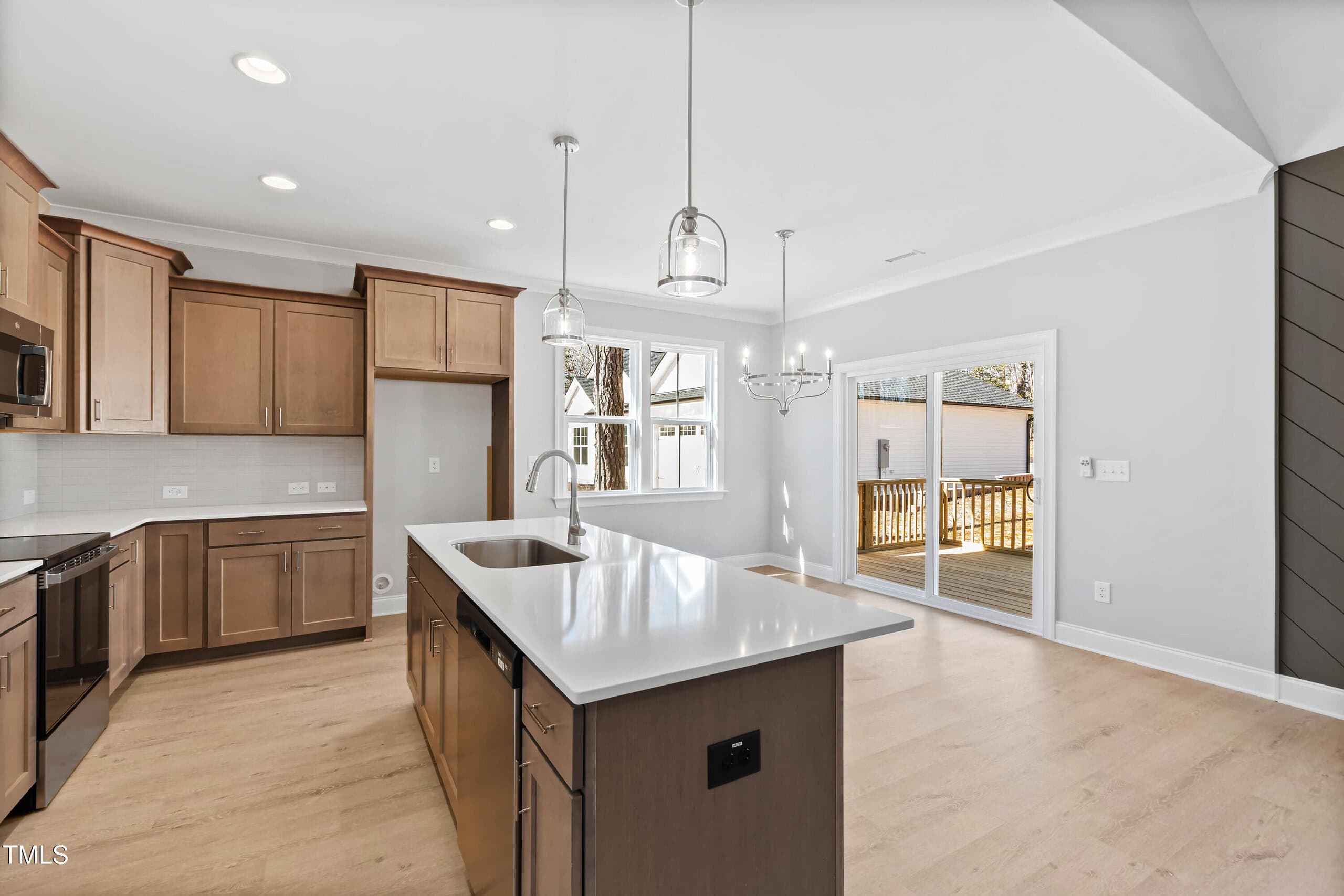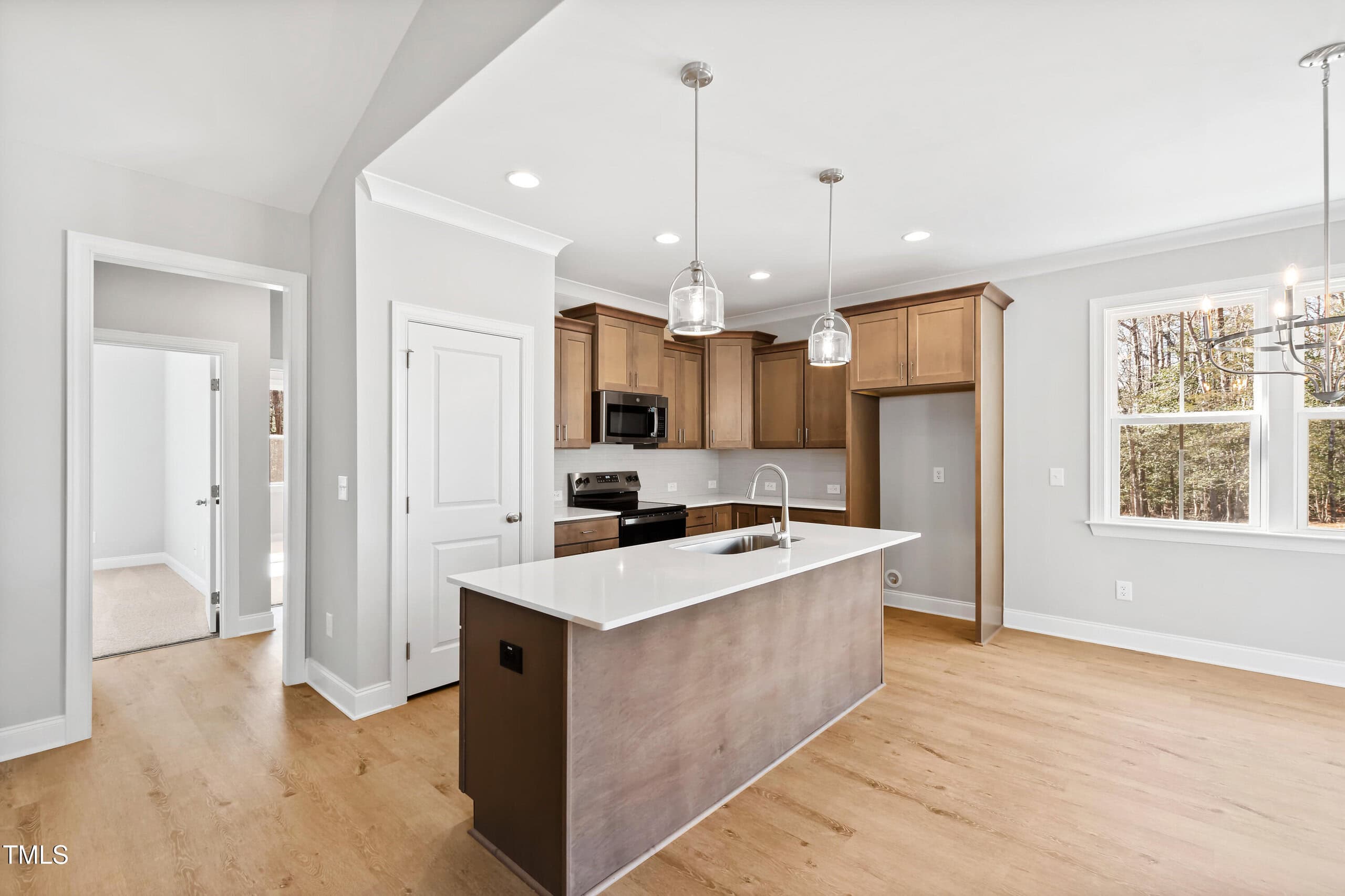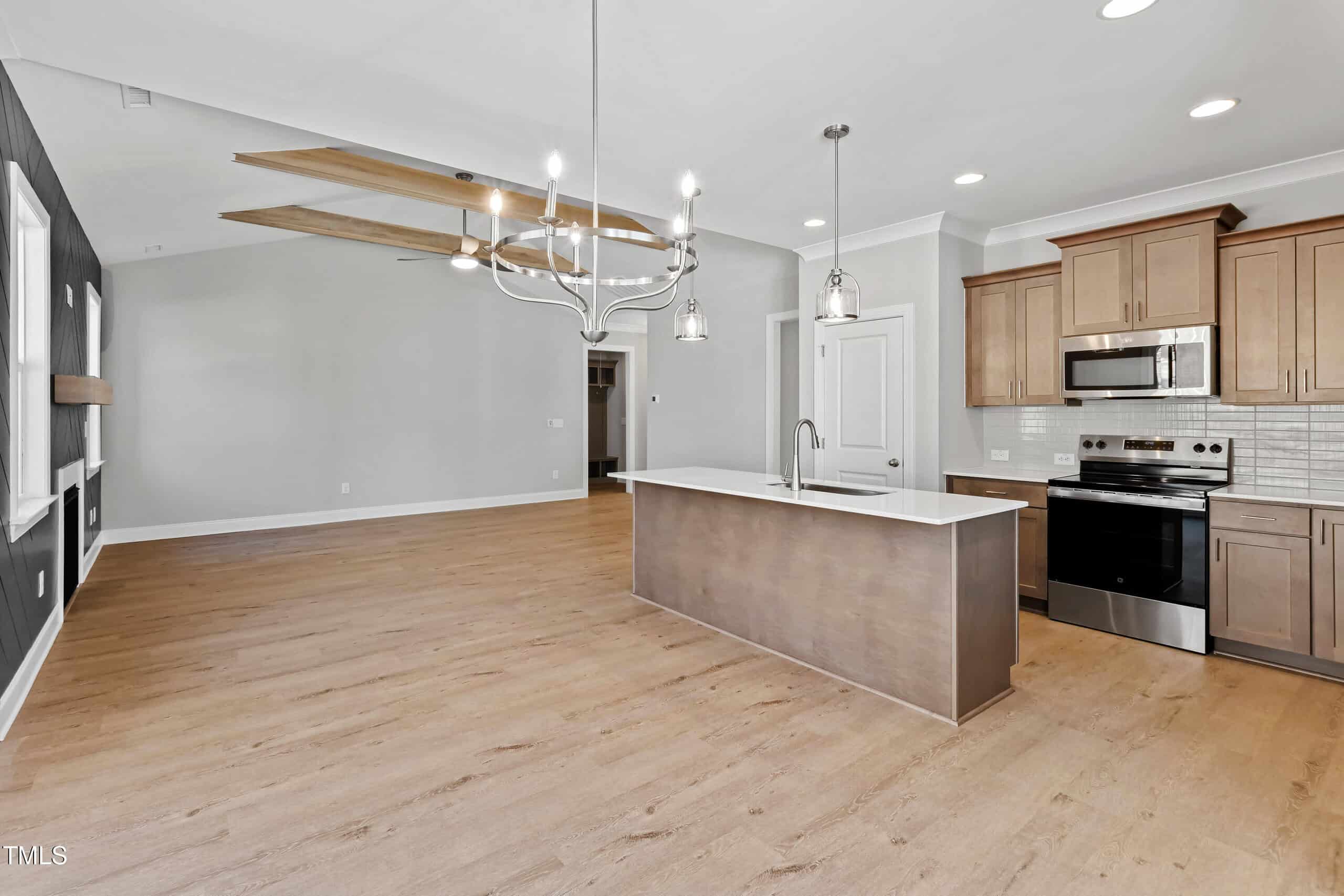 True Ranch floorplan! Custom-built by Ken Harvey Homes! This thoughtfully designed home offers wide plank, waterproof, and scratch-resistant LVP flooring throughout the main living areas. The gourmet kitchen features ”Maple Oyster” painted cabinets with cove crown trim, stunning ”Miami White” quartz countertops, a stylish ”Revalia Remix” 2×8 ripple tile backsplash, and a large island with a stainless steel single-bowl sink and pull-out faucet. Enjoy added conveniences like a double trash cabinet, lazy Susan corner, recessed lighting, pantry, and stainless steel appliances.