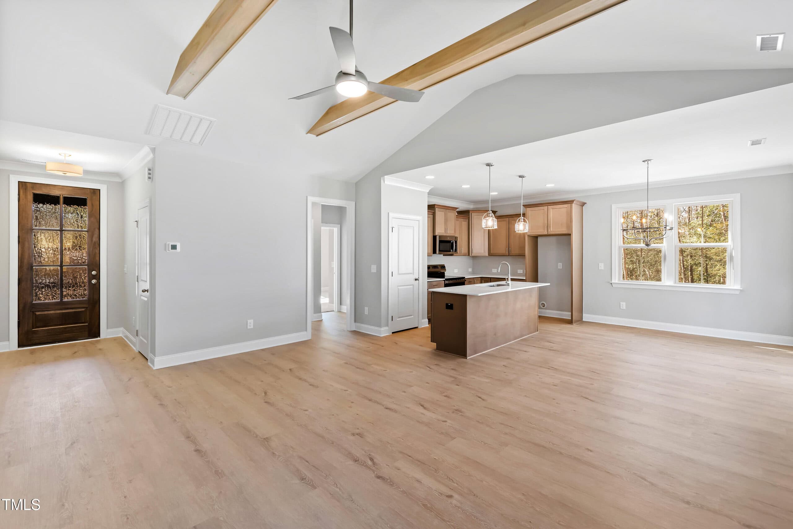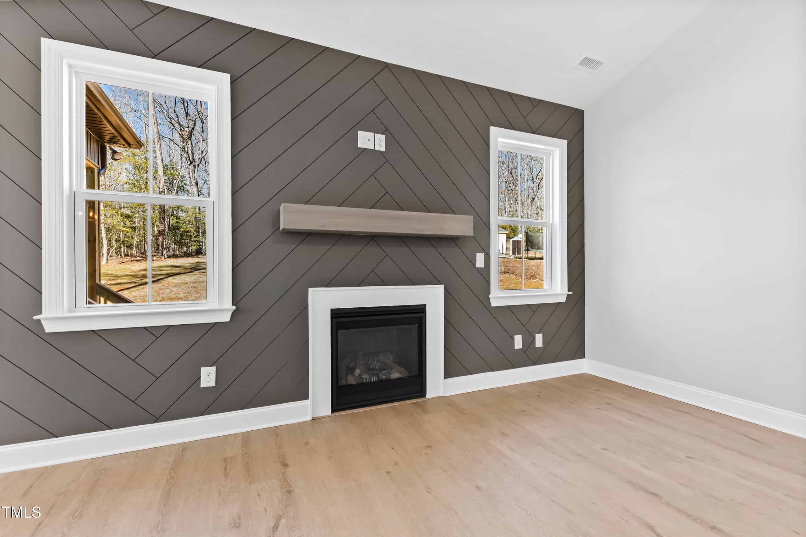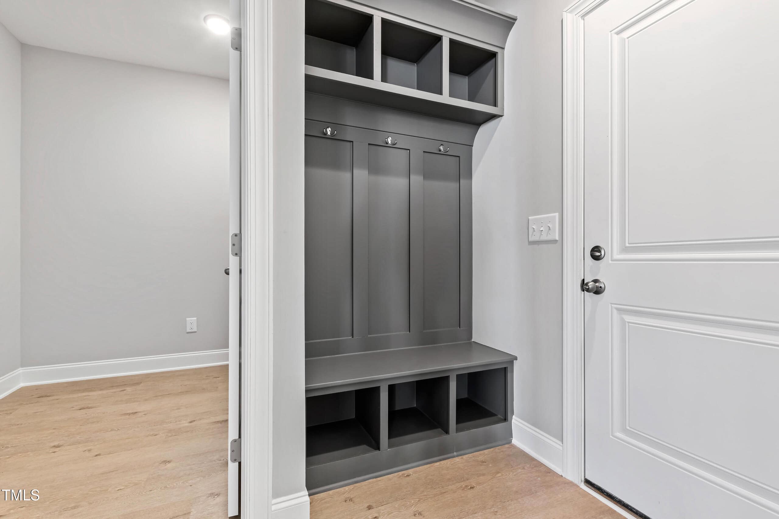 The open-concept family room is a perfect gathering space, showcasing a chevron shiplap accent wall surrounding the cozy 32” fireplace, along with eye-catching 2×6 dropped accent ceiling beams and a ceiling fan. Additional features include a mudroom with a bench and drop zone off the garage, a slider leading to a covered porch, two generously-sized secondary bedrooms, and a large laundry room. This home truly has it all!