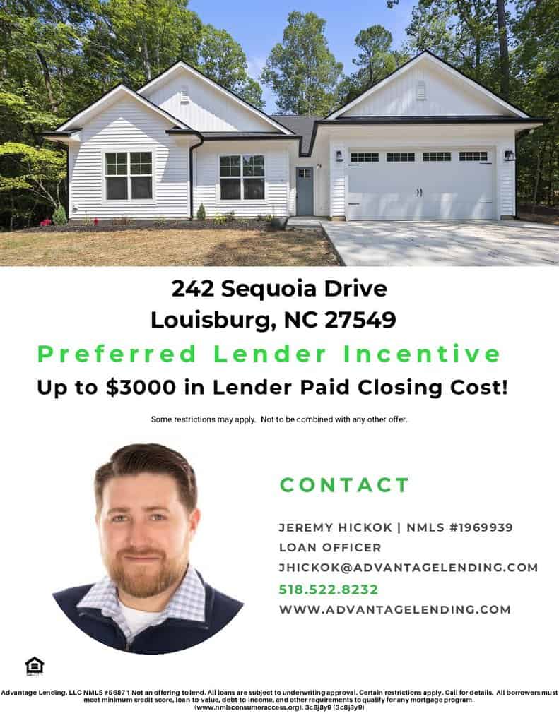 **Back on the market due to no fault of the seller!!** Welcome to 242 Sequoia Drive, a stunning new construction home located in the sought-after gated community of Lake Royale. This beautifully crafted residence offers modern luxury and impeccable attention to detail throughout. Step into an open-concept living space featuring luxury vinyl, plush carpet, and tile flooring, with large windows that fill the home with natural light. The gourmet kitchen is the heart of the home, equipped with quartz countertops, stainless steel appliances, a large center island, and custom cabinetry—perfect for cooking and entertaining. The primary suite is a private oasis, complete with a spacious walk-in closet and a spa-inspired en-suite bathroom featuring dual vanities, and gorgeous tiled shower. Additional bedrooms are generously sized with ample closet space. Located on a peaceful lot, this home offers a serene outdoor living space with a rear patio that’s perfect for enjoying the beautiful surroundings. Beyond the home, Lake Royale offers unparalleled amenities, including a 345-acre lake for boating, fishing, and water sports, a championship 18-hole golf course, tennis courts, a community clubhouse, a pool, and 24/7 gated security. *Up to $3k in closing costs with use of preferred lender*
