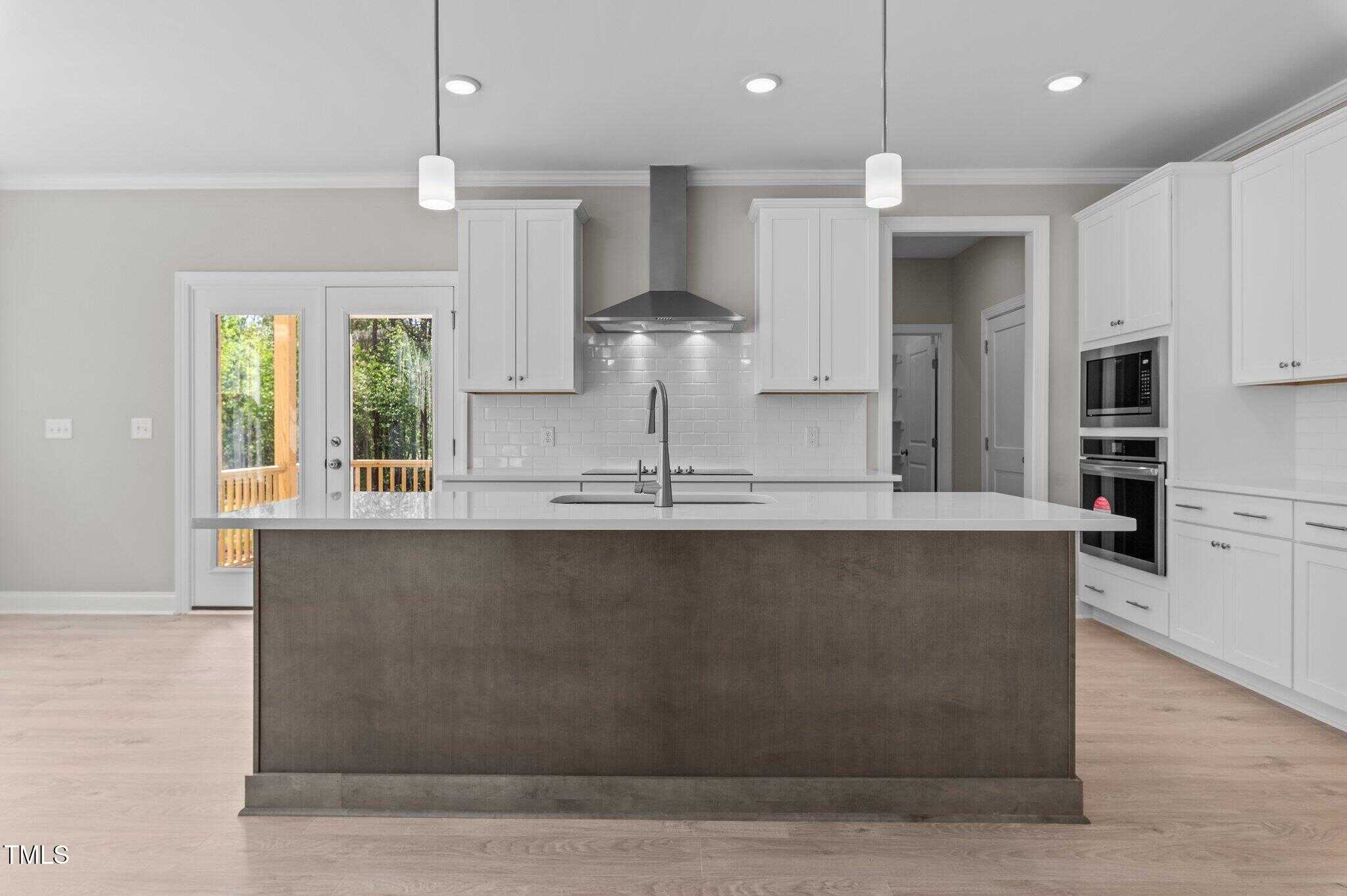 Kitchen: offers Quartz countertops, Custom White painted cabinets with crown trim, Large center island w/breakfast bar and accent pendant lights, Decorative tile backsplash & SS appliances incl 5-burner gas cooktop, built-in wall oven, built-in microwave & dishwasher! Opening to the breakfast nook with french door to the rear porch!