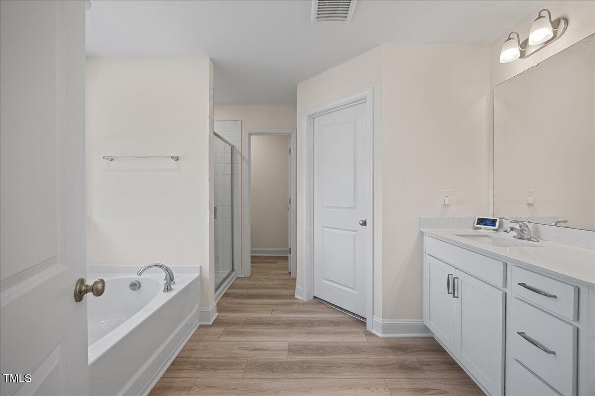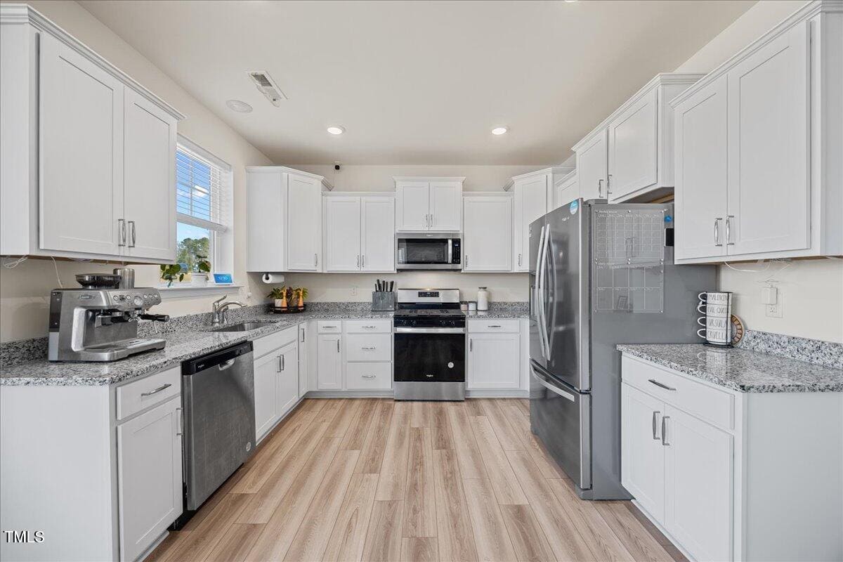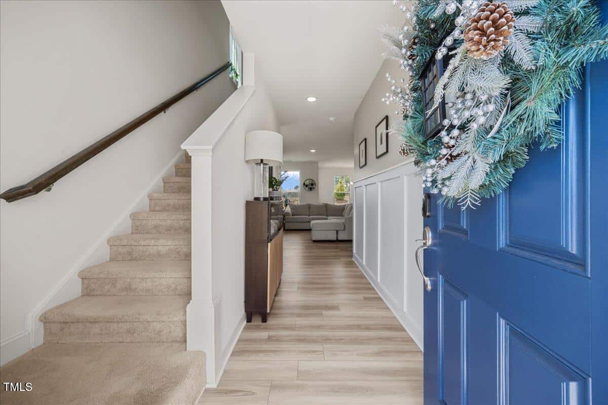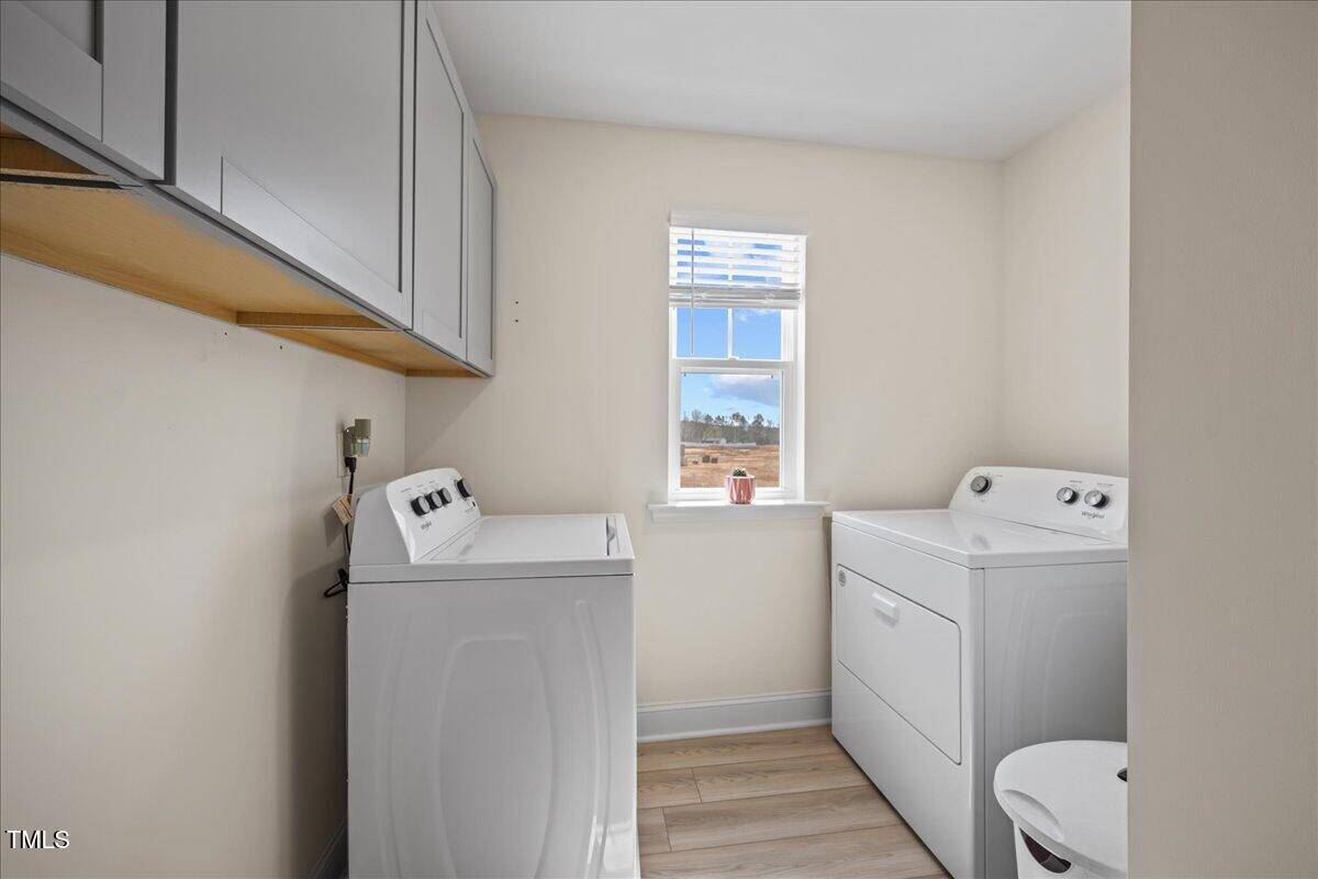 This beautifully designed 3-bedroom, 2.5-bath home offers a functional open floor plan with durable LVP flooring throughout the main level and wet areas upstairs with transferrable builder warranties. The kitchen stands out with its upgraded white cabinetry, Luna Pearl granite countertops, and ample storage, while the bathrooms showcase sleek white quartz countertops for a polished look.