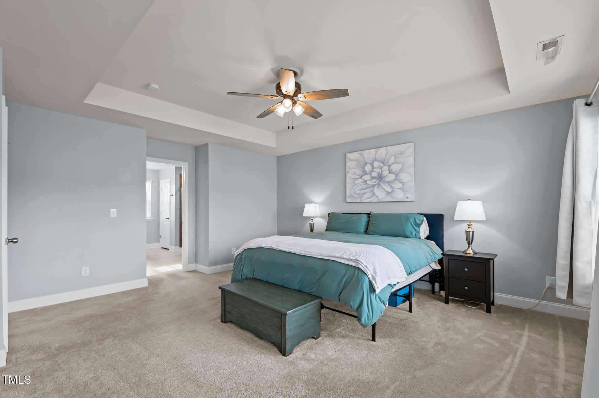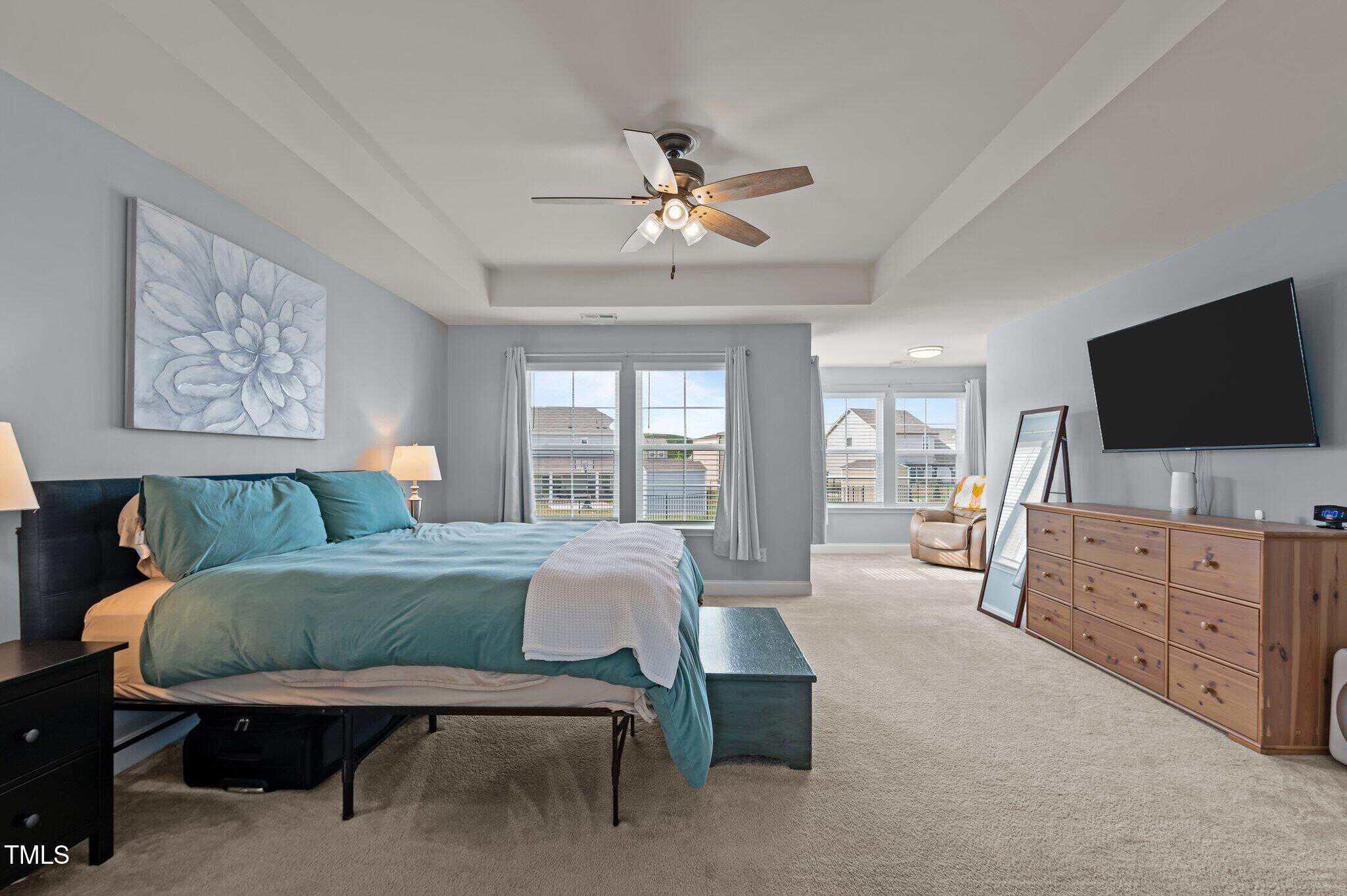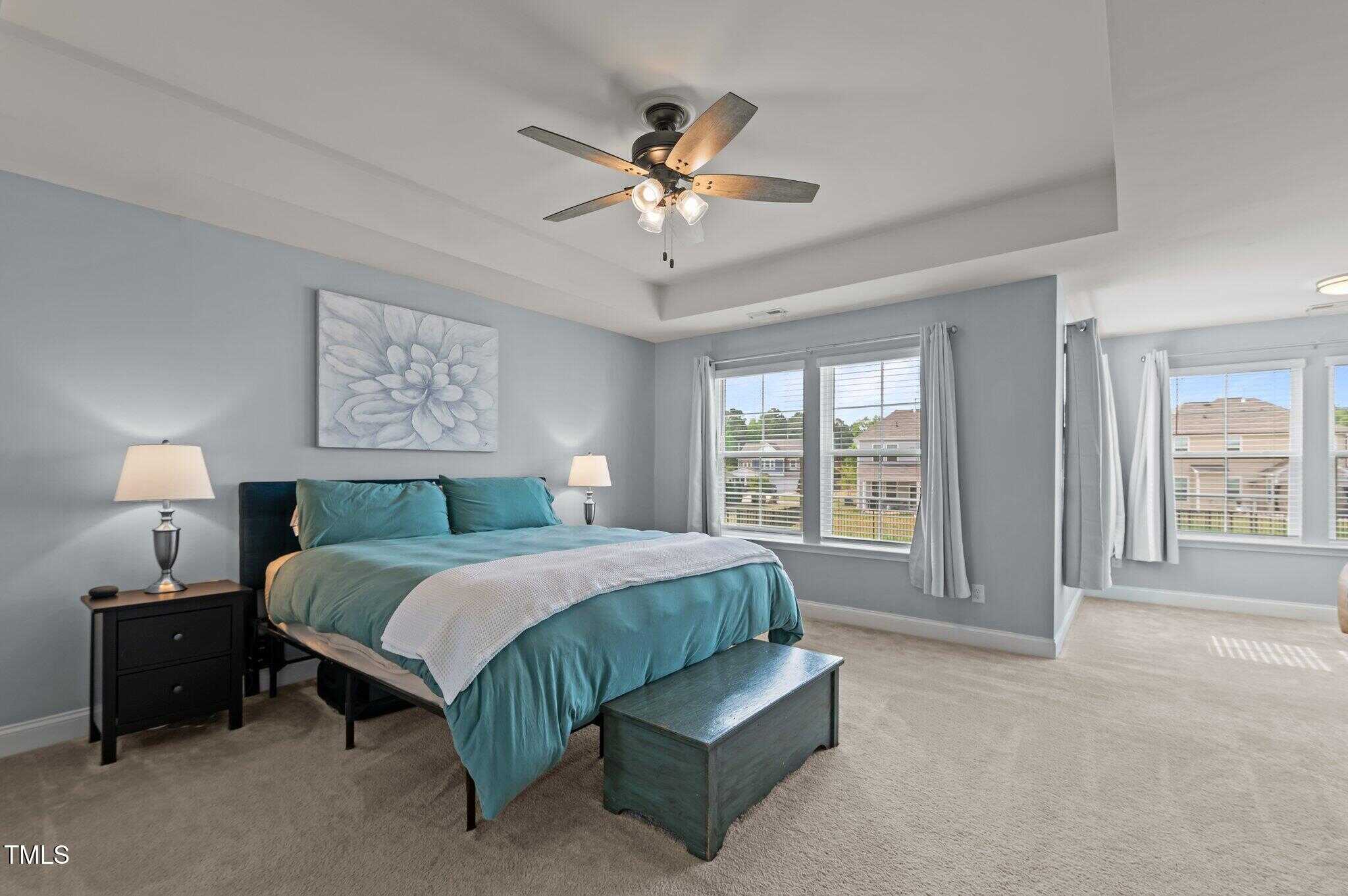 Large Loft/Bonus Room area at the top of the steps and Three Additional Bedrooms including a Grand Primary Suite w/ Tray Ceiling & Sitting Room. Primary Bath features Dual Vanity w/ updated fixtures, Large Tile Surround Shower w/ Body Jets, Rainfall Shower Head, and Handheld Wand, Private Water Closet, and Huge Walk-in Closet. Epoxy Flooring and Raised Storage in the Garage. Patio with Covered Pergola overlooks the Large Fenced Backyard.