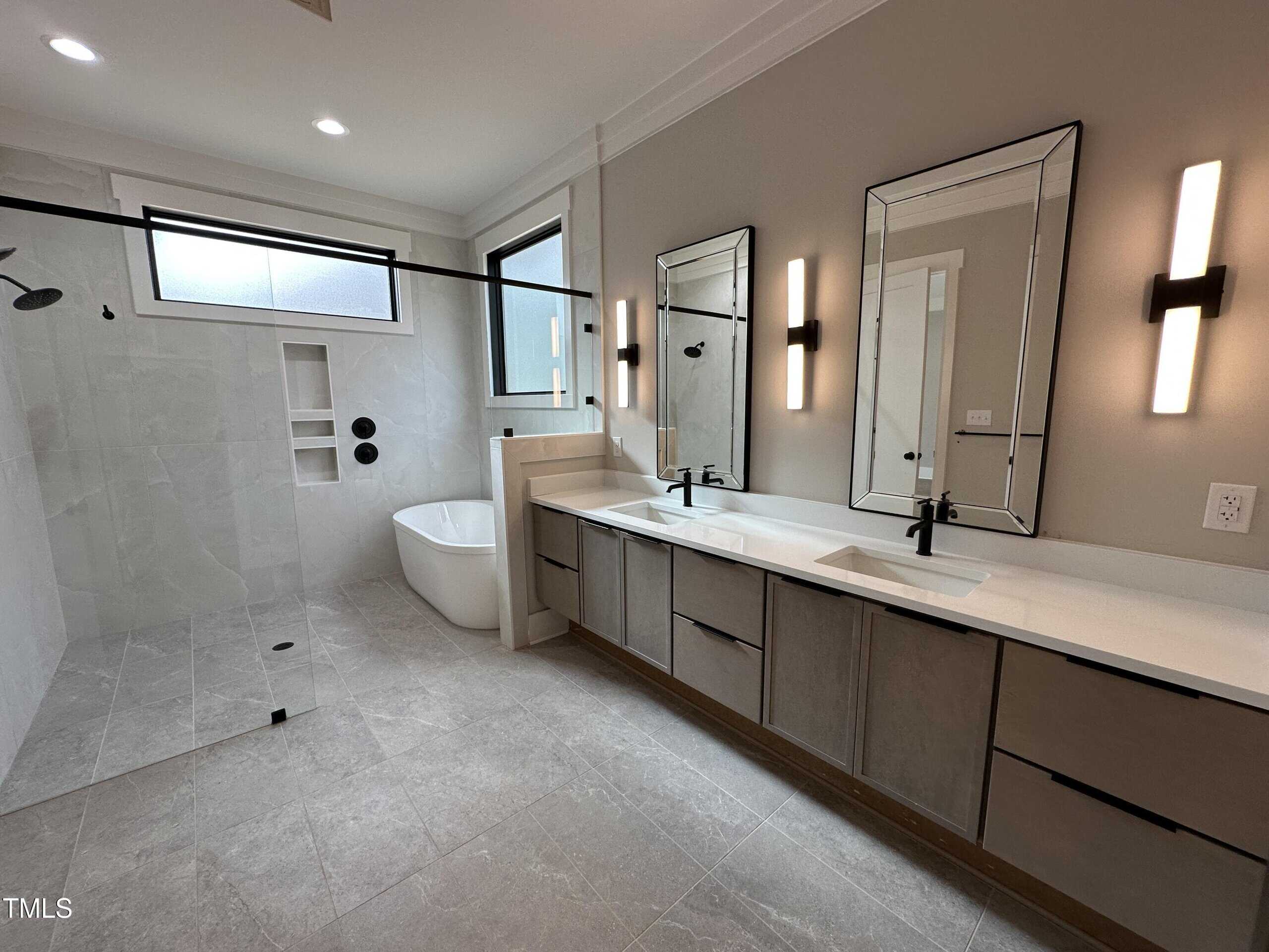 Primary Suite: Foyer Entry, HWDs & Large Triple Window Overlooking Backyard! Primary Bath: features Zero Entry Wet Room w/Spa Style Shower w/12×24 Matte Tile & Freestanding Tub! Custom Dual Vanity w/”White Zen” Quartz & Sconce Vanity Lights & WIC w/Custom Built ins!