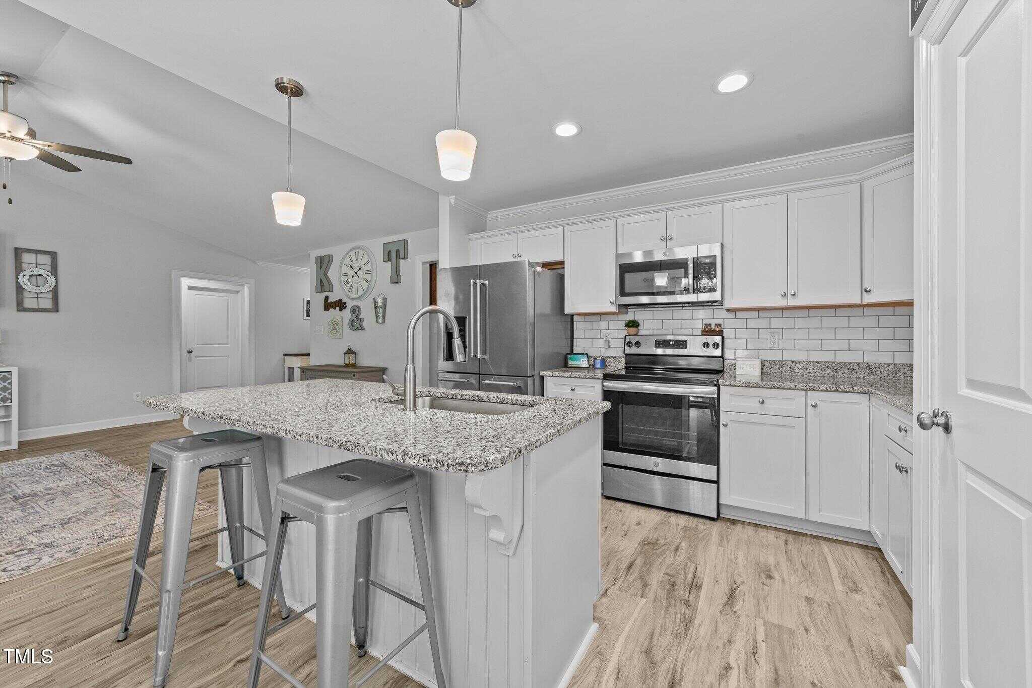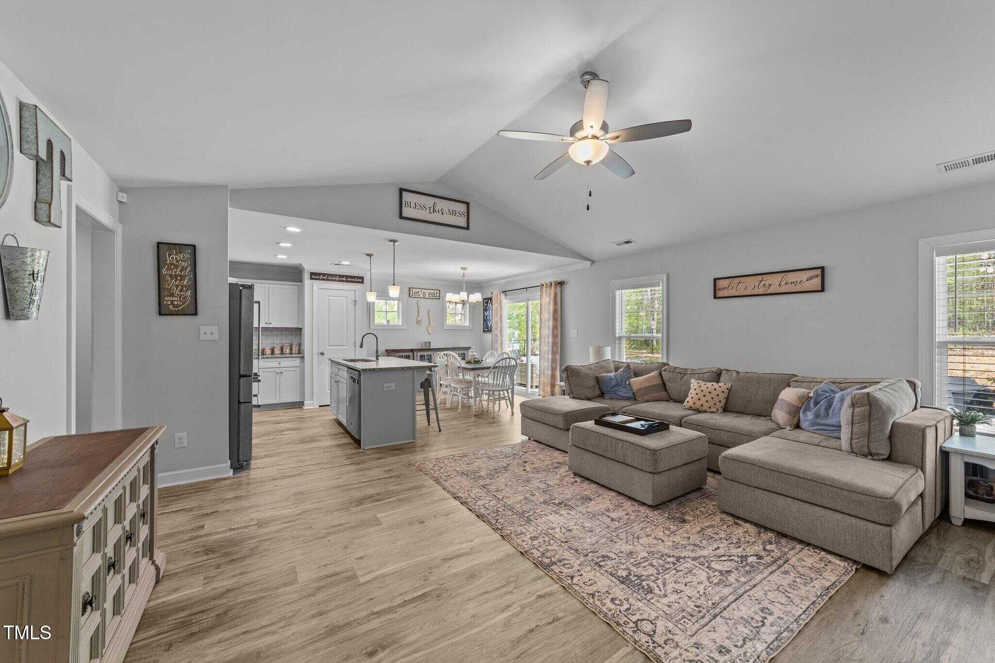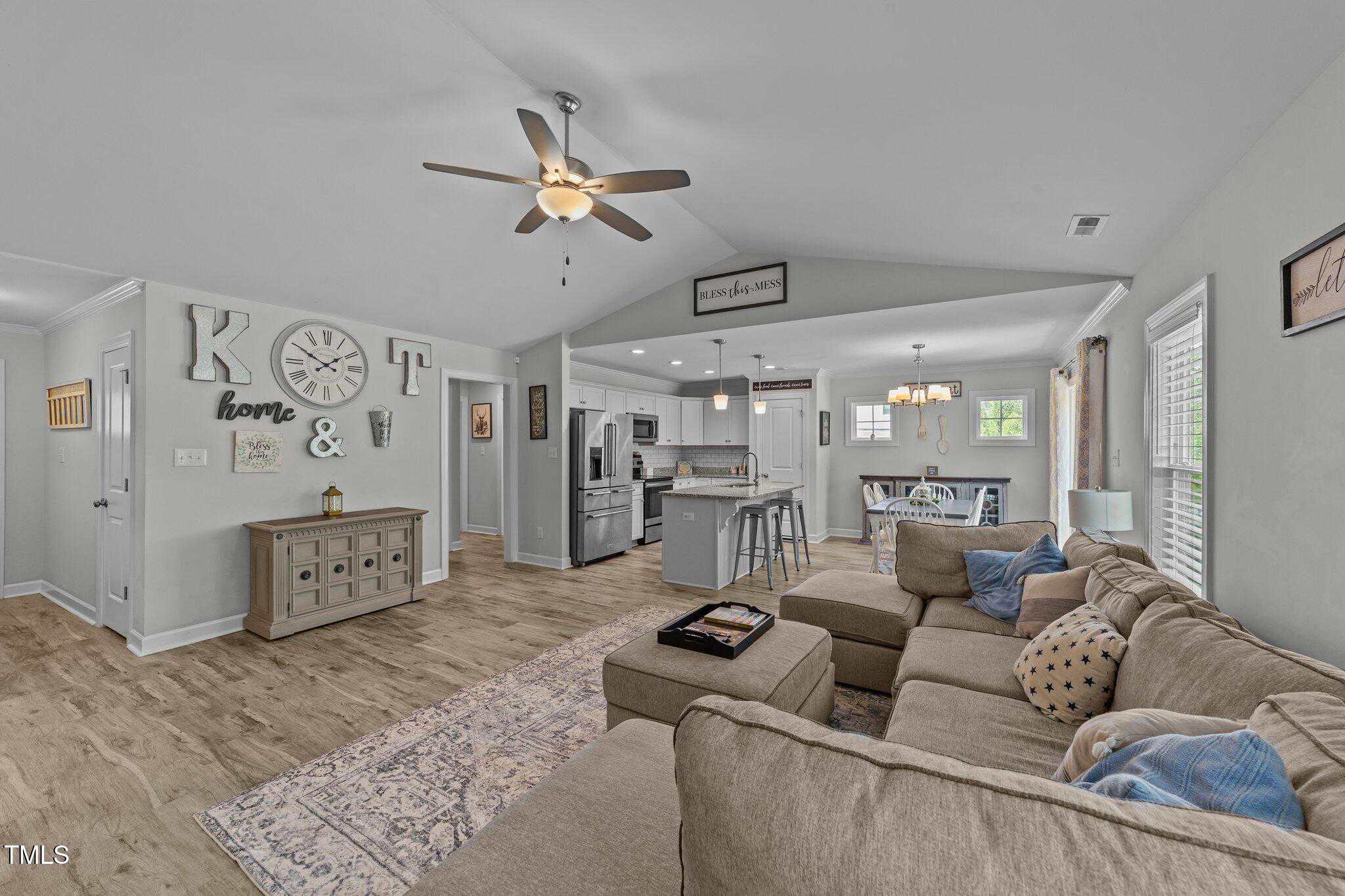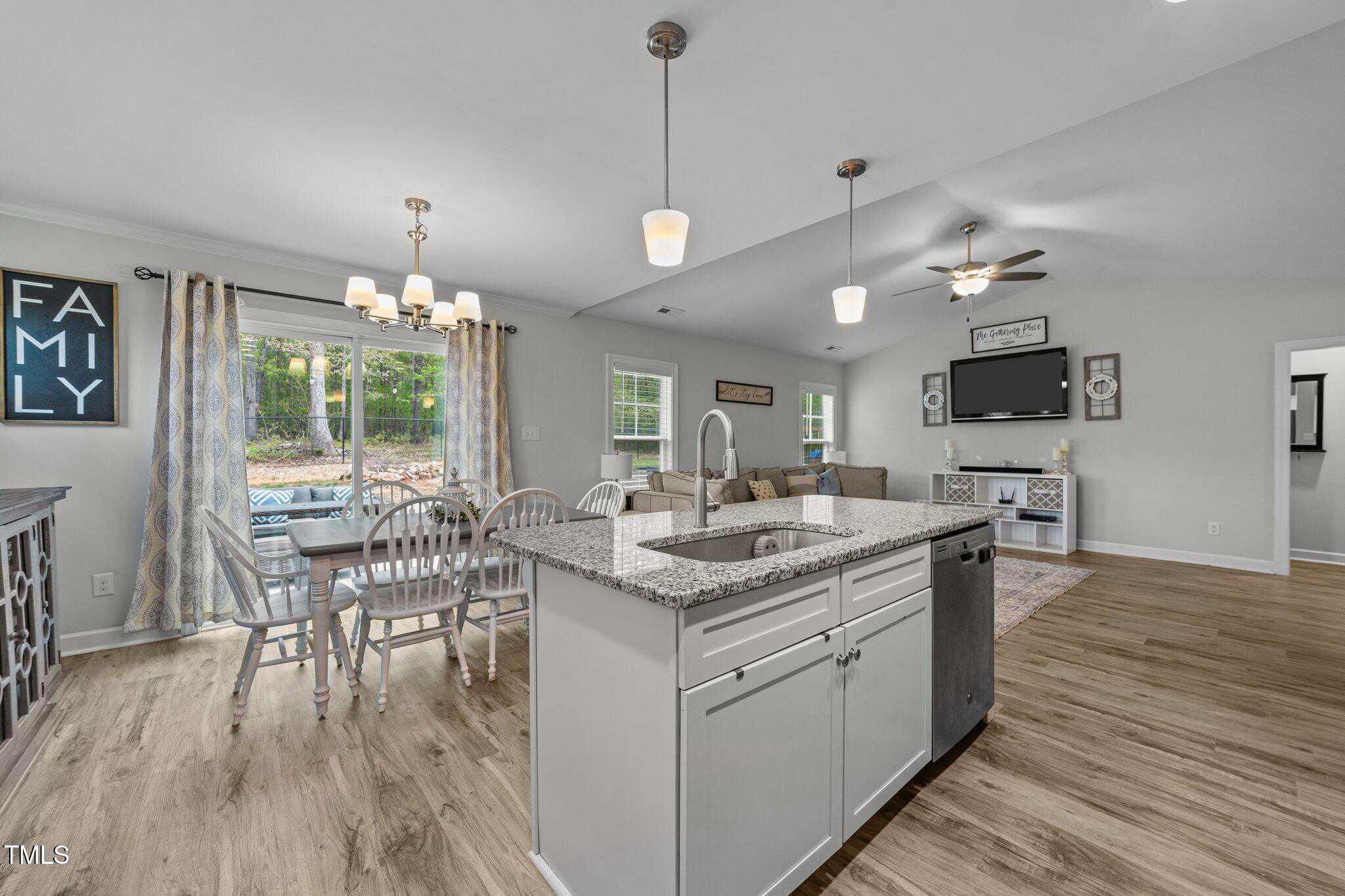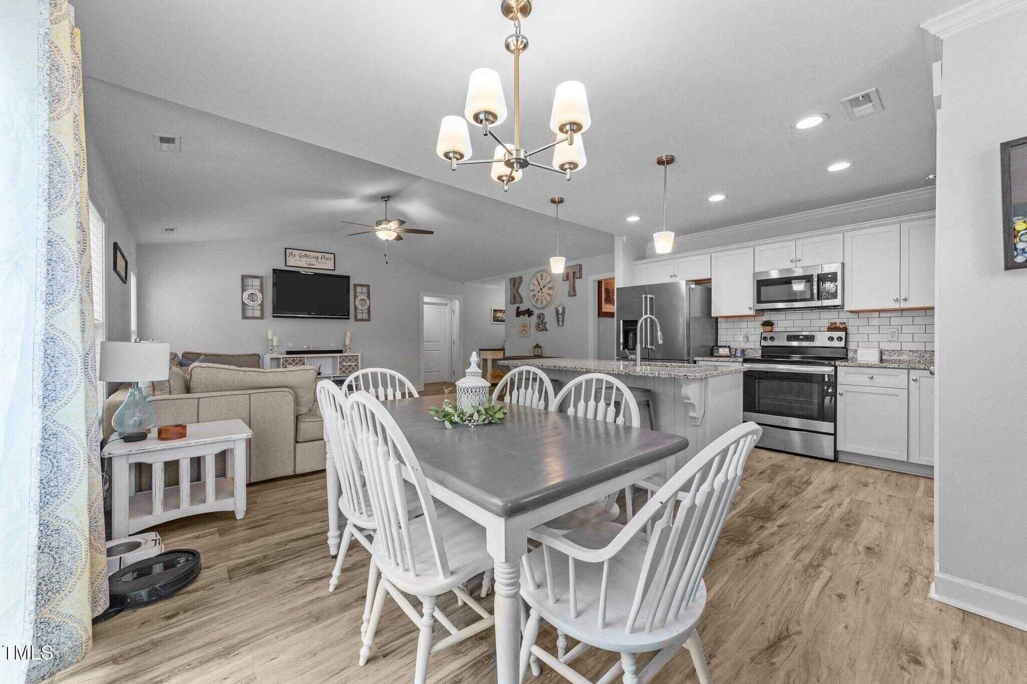 This home features an open floorplan with cathedral ceilings, creating a bright and inviting atmosphere. The kitchen boasts granite countertops, beautiful subway tile, stainless steel appliances including refrigerator, a large island for additional seating, and flows seamlessly into the living and dining areas.