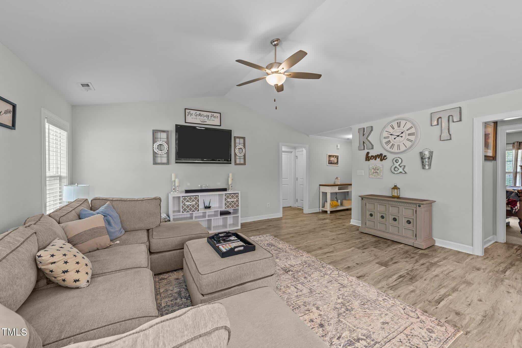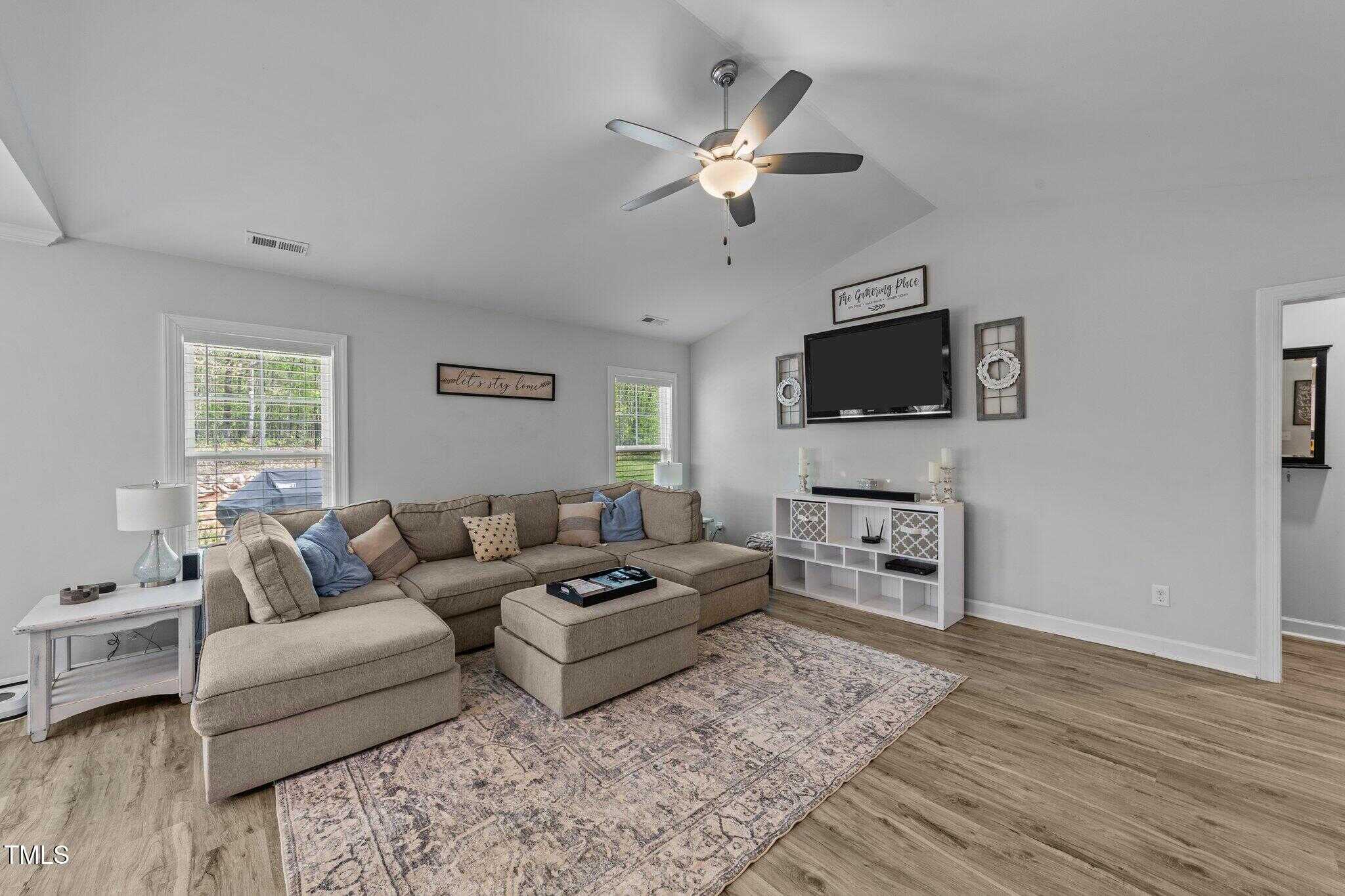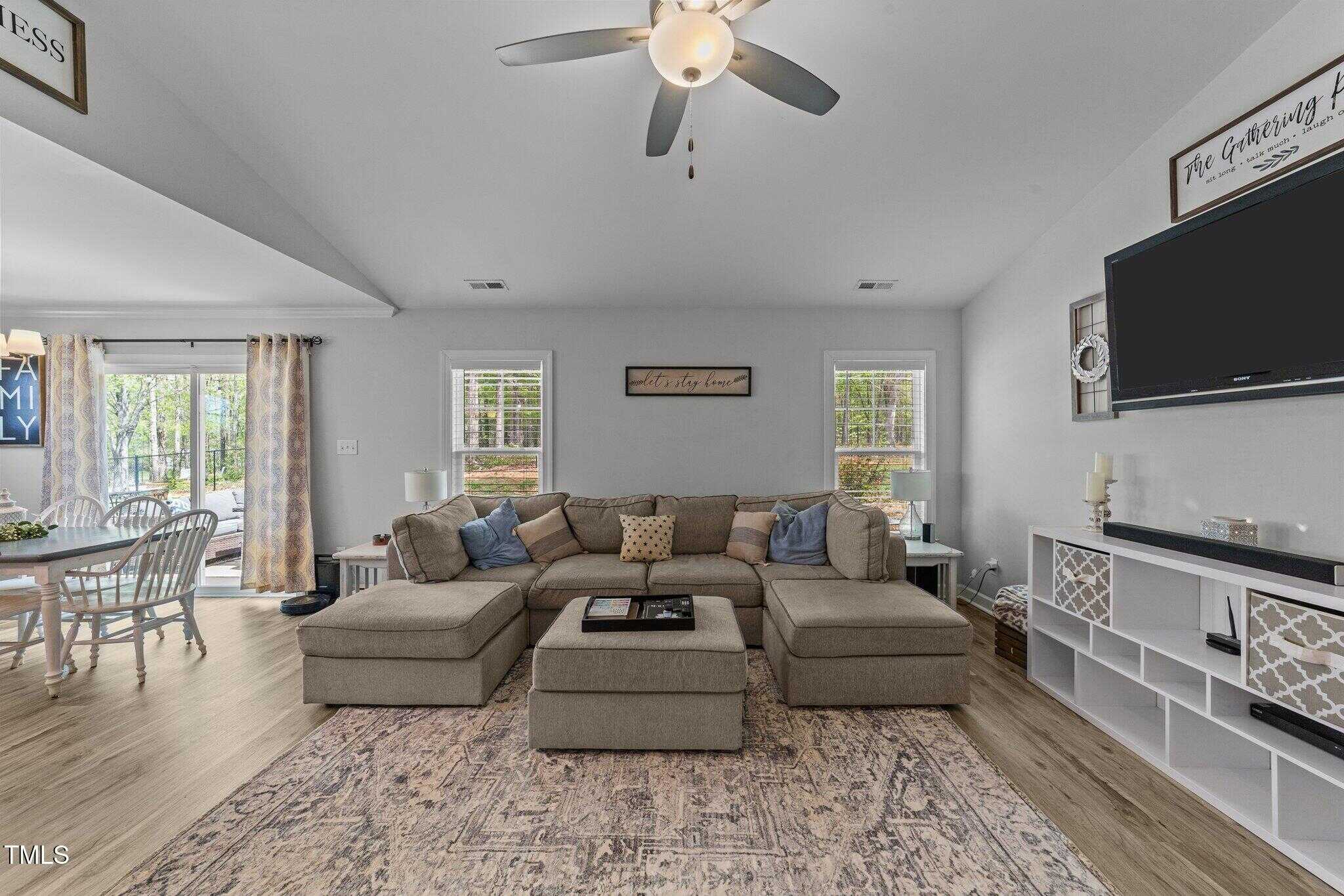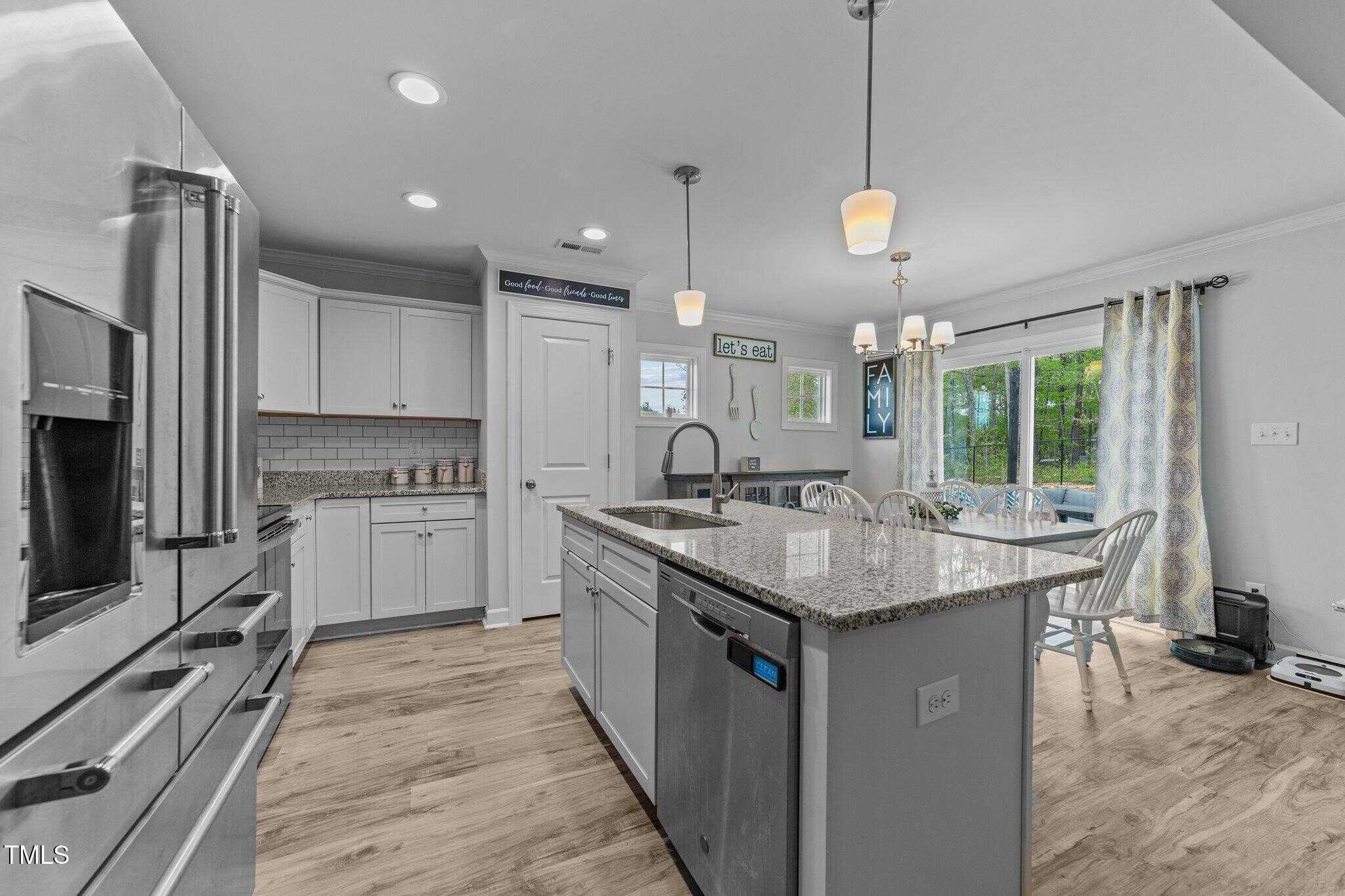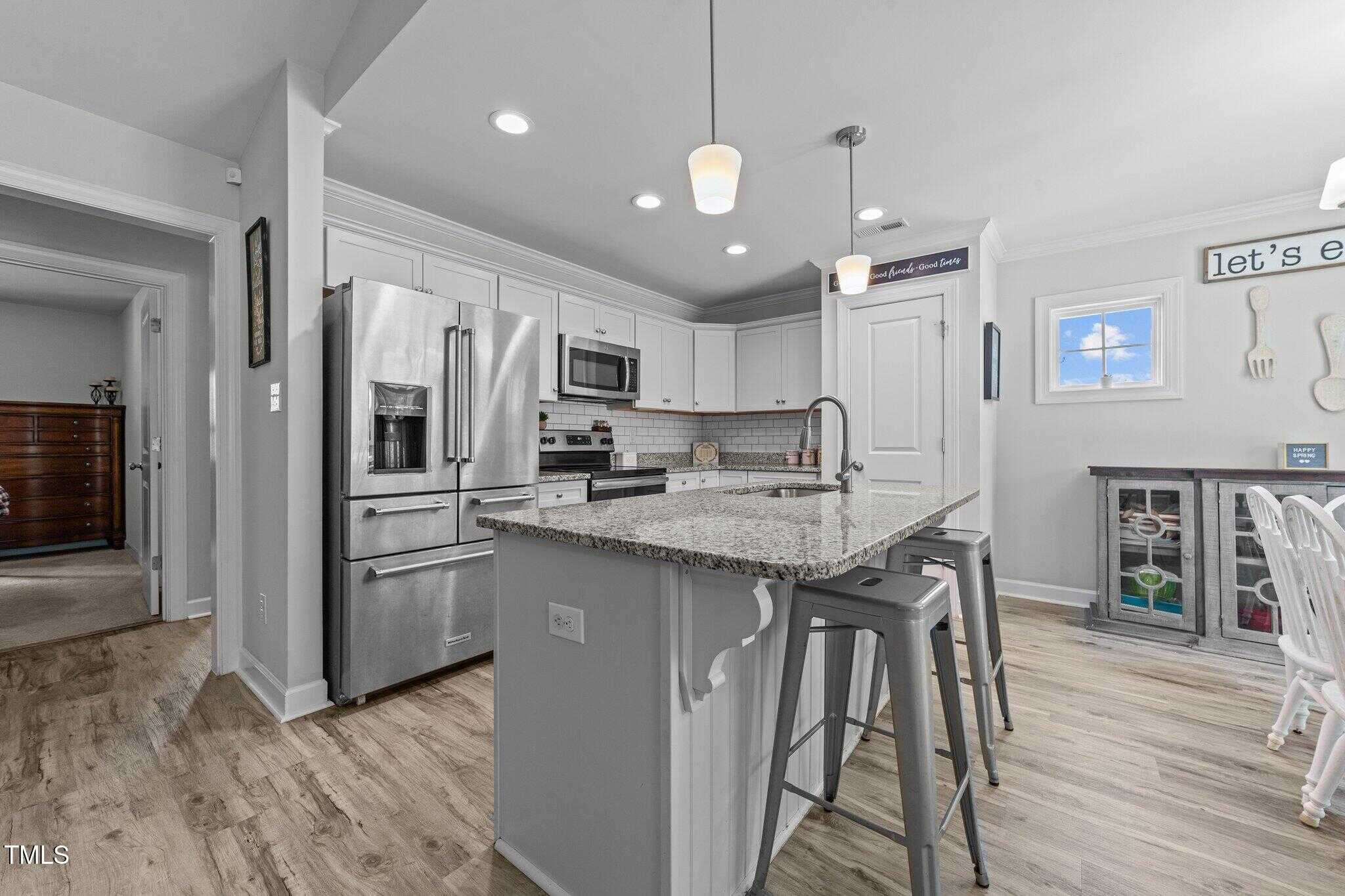 This home features an open floorplan with cathedral ceilings, creating a bright and inviting atmosphere. The kitchen boasts granite countertops, beautiful subway tile, stainless steel appliances including refrigerator, a large island for additional seating, and flows seamlessly into the living and dining areas.