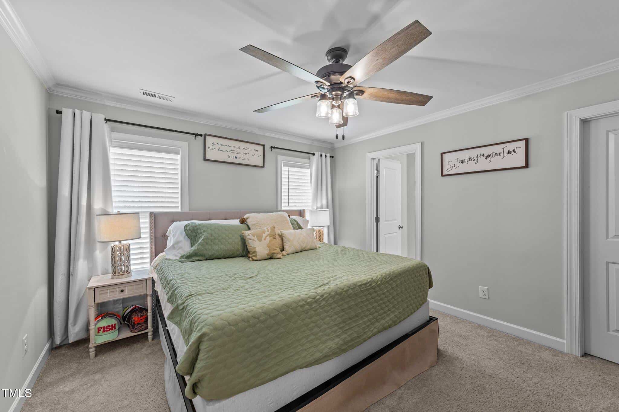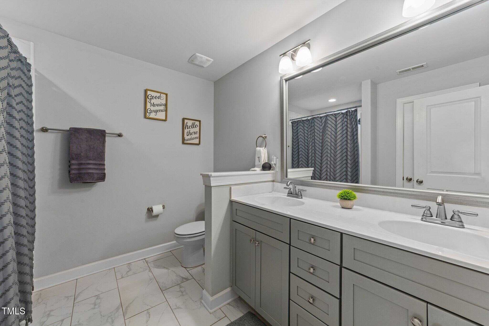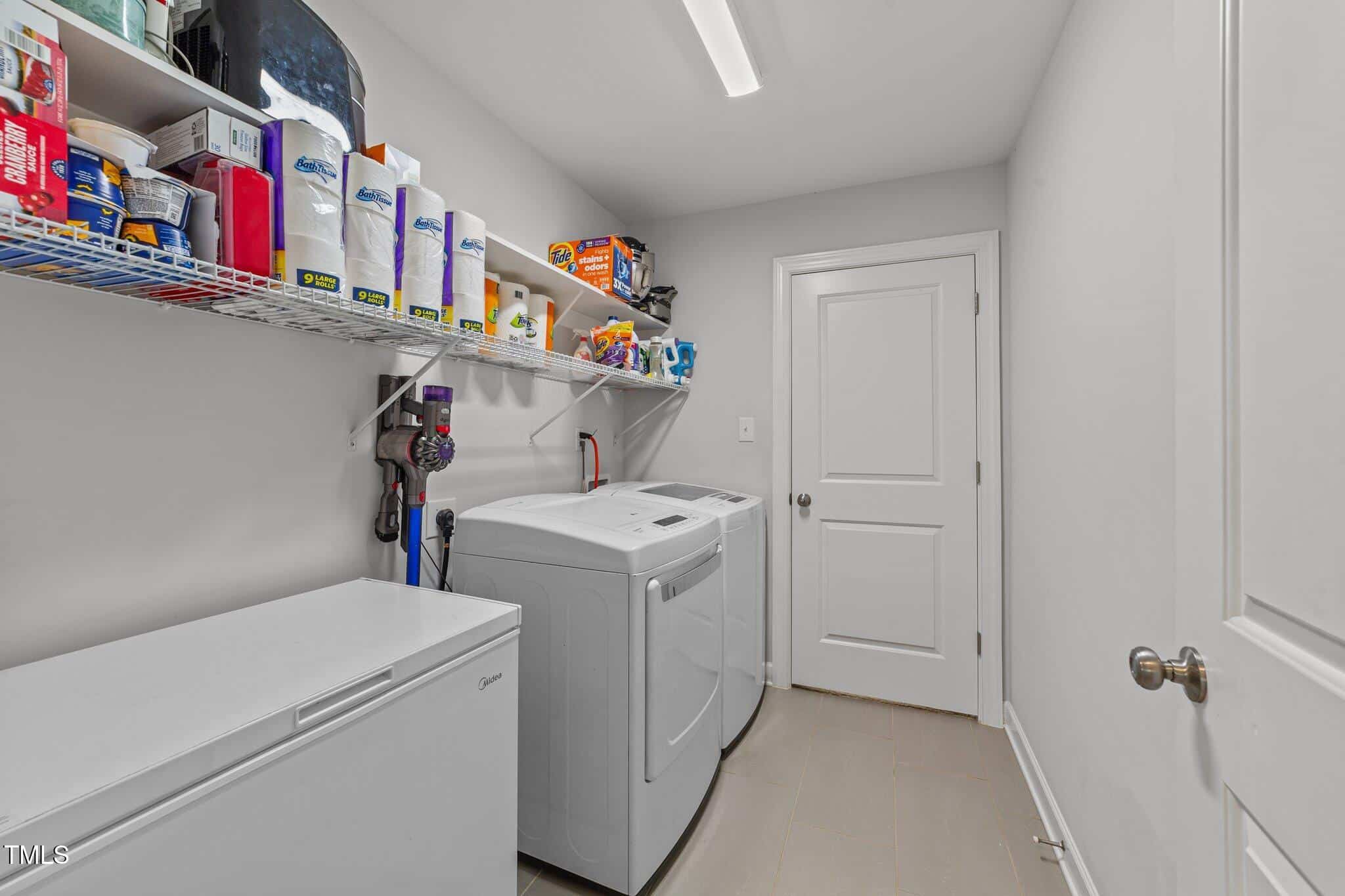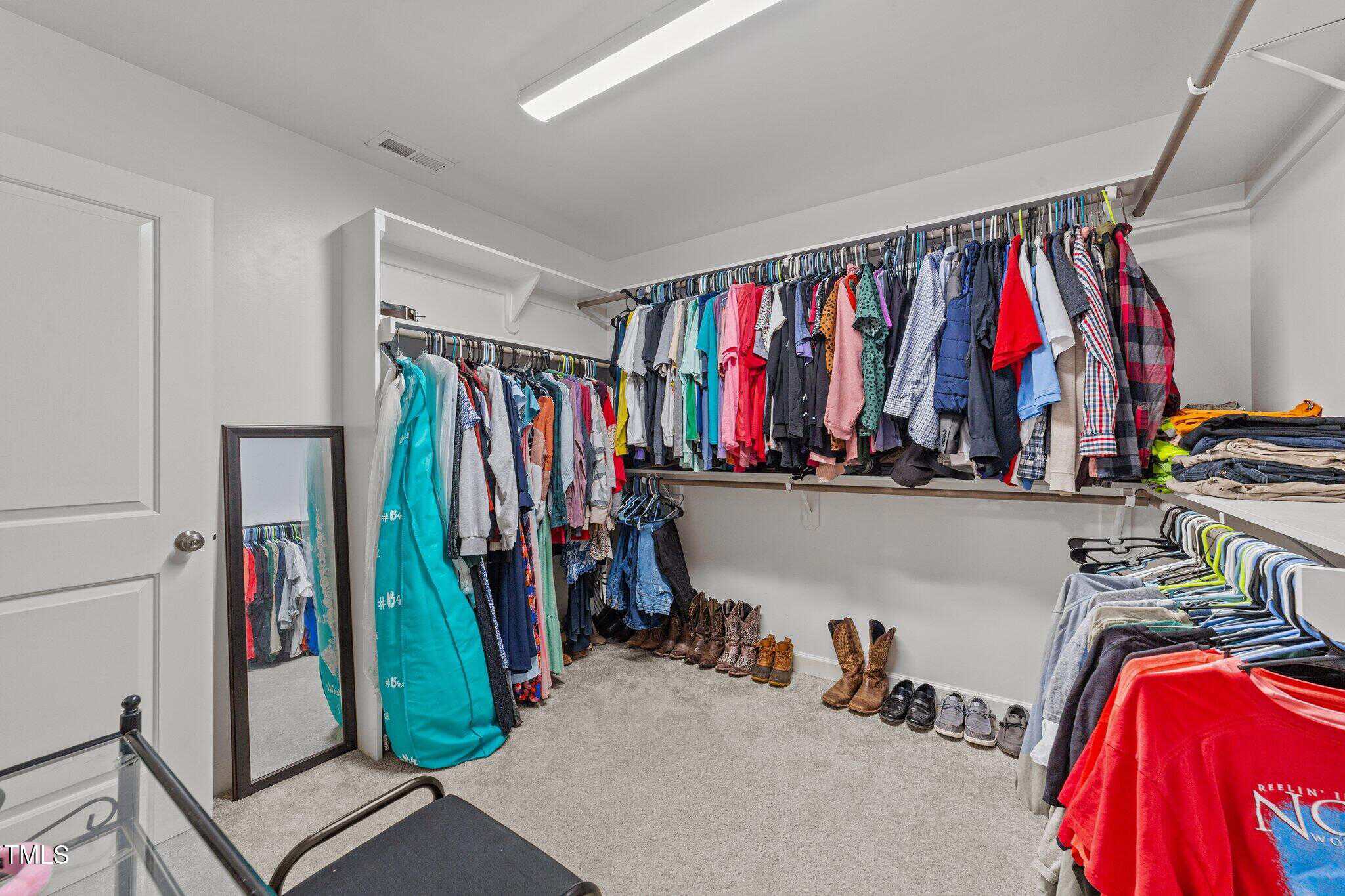 The primary bedroom offers a HUGE walk-in closet that opens into the laundry room for added convenience, as well as a large bathroom with a standup shower and dual vanities.