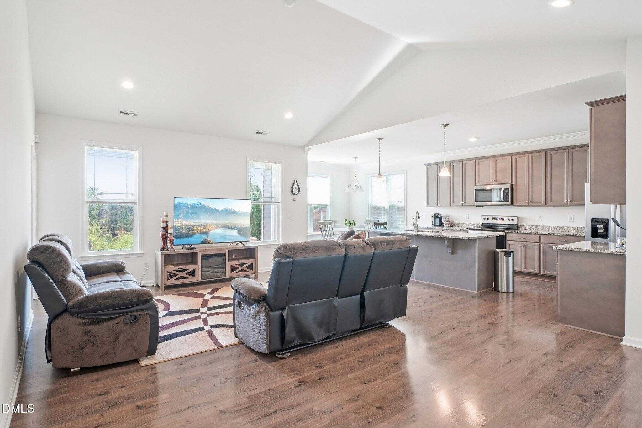 This charming 1.5-story ranch-style home offers an open and inviting floor plan with thoughtful upgrades throughout. The main living area features a stunning cathedral ceiling that enhances the spacious feel, flowing seamlessly into the combined kitchen and dining area. The kitchen is designed for both style and function, showcasing granite countertops, stainless steel appliances, an oversized island, pantry, and extra-long cabinetry for ample storage. Recessed lighting and elegant crown molding in the kitchen and primary bedroom add a refined touch. All three bedrooms and two full bathrooms are conveniently located on the first level, along with a laundry room for easy everyday living. Upstairs, a versatile bonus room provides the perfect space for a home office, media room, or guest retreat. Step outside to enjoy a fully fenced backyard that opens to a peaceful fishing pond, creating a relaxing outdoor setting ideal for unwinding or entertaining. Located less than ten minutes from shopping and dining, including the Kohl’s shopping center in Wake Forest, this home blends comfort, functionality, and scenic charm in one beautiful package.