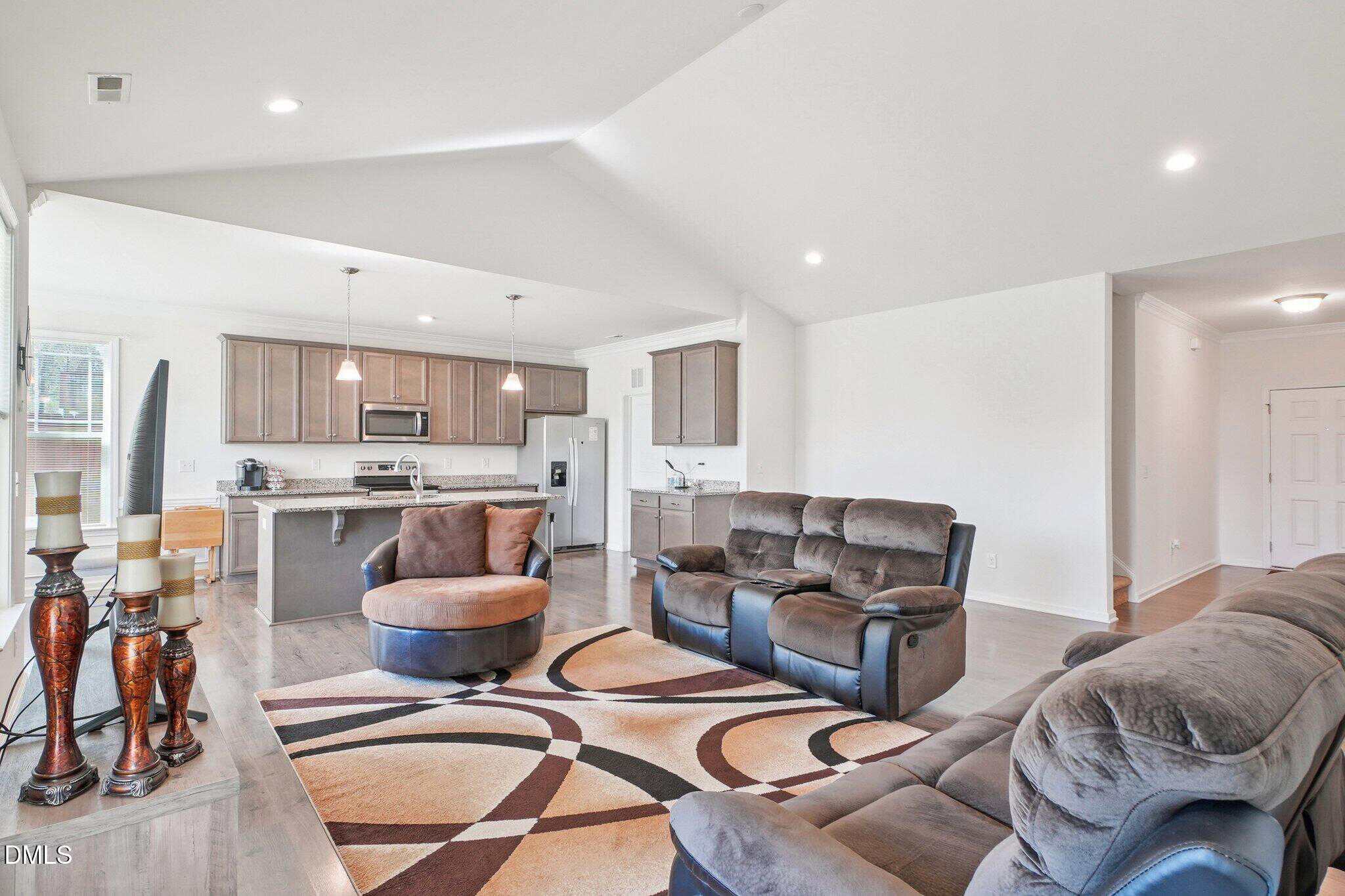 This charming 1.5-story ranch-style home offers an open and inviting floor plan with thoughtful upgrades throughout. The main living area features a stunning cathedral ceiling that enhances the spacious feel, flowing seamlessly into the combined kitchen and dining area. The kitchen is designed for both style and function, showcasing granite countertops, stainless steel appliances, an oversized island, pantry, and extra-long cabinetry for ample storage. Recessed lighting and elegant crown molding in the kitchen and primary bedroom add a refined touch.