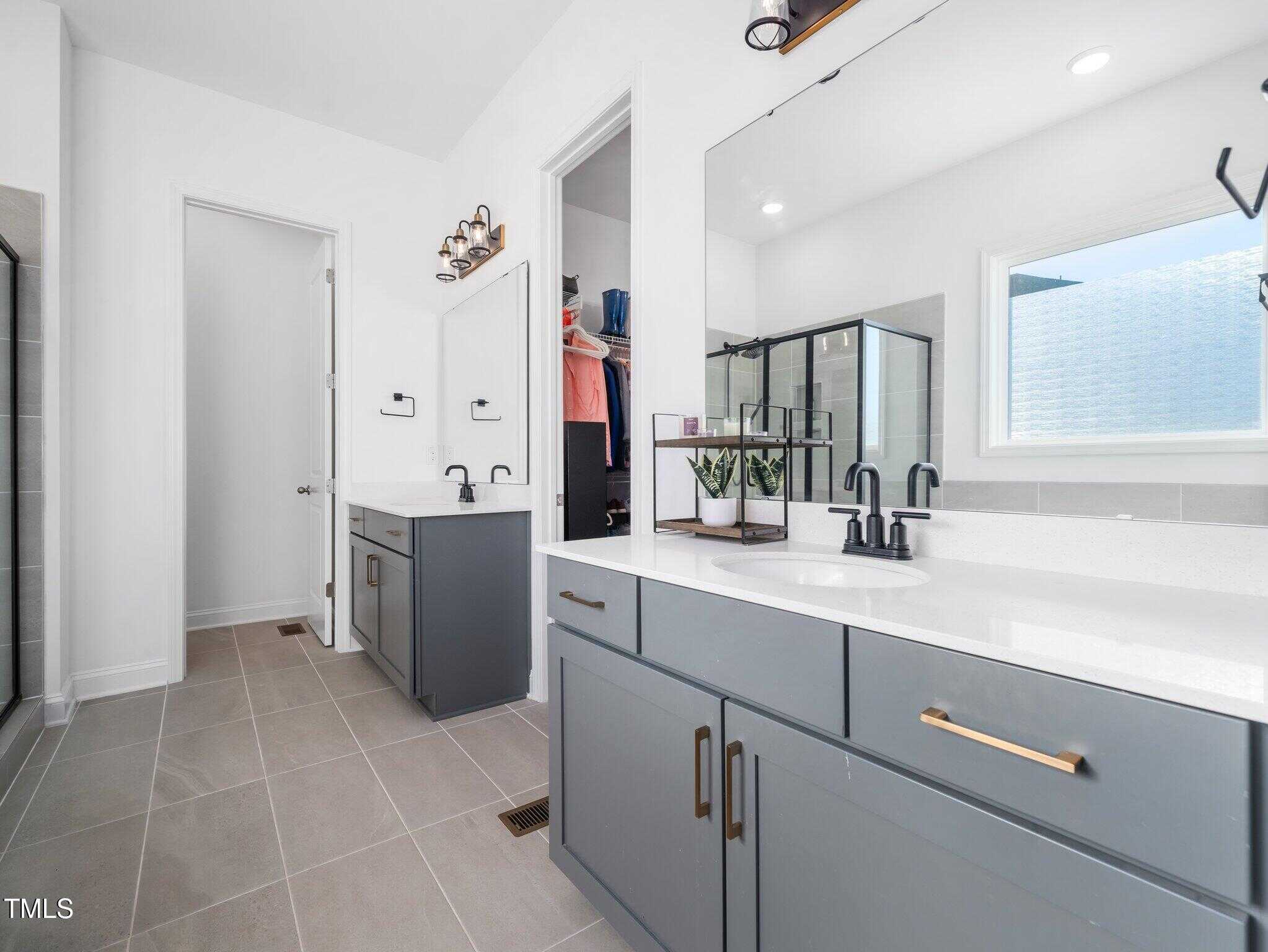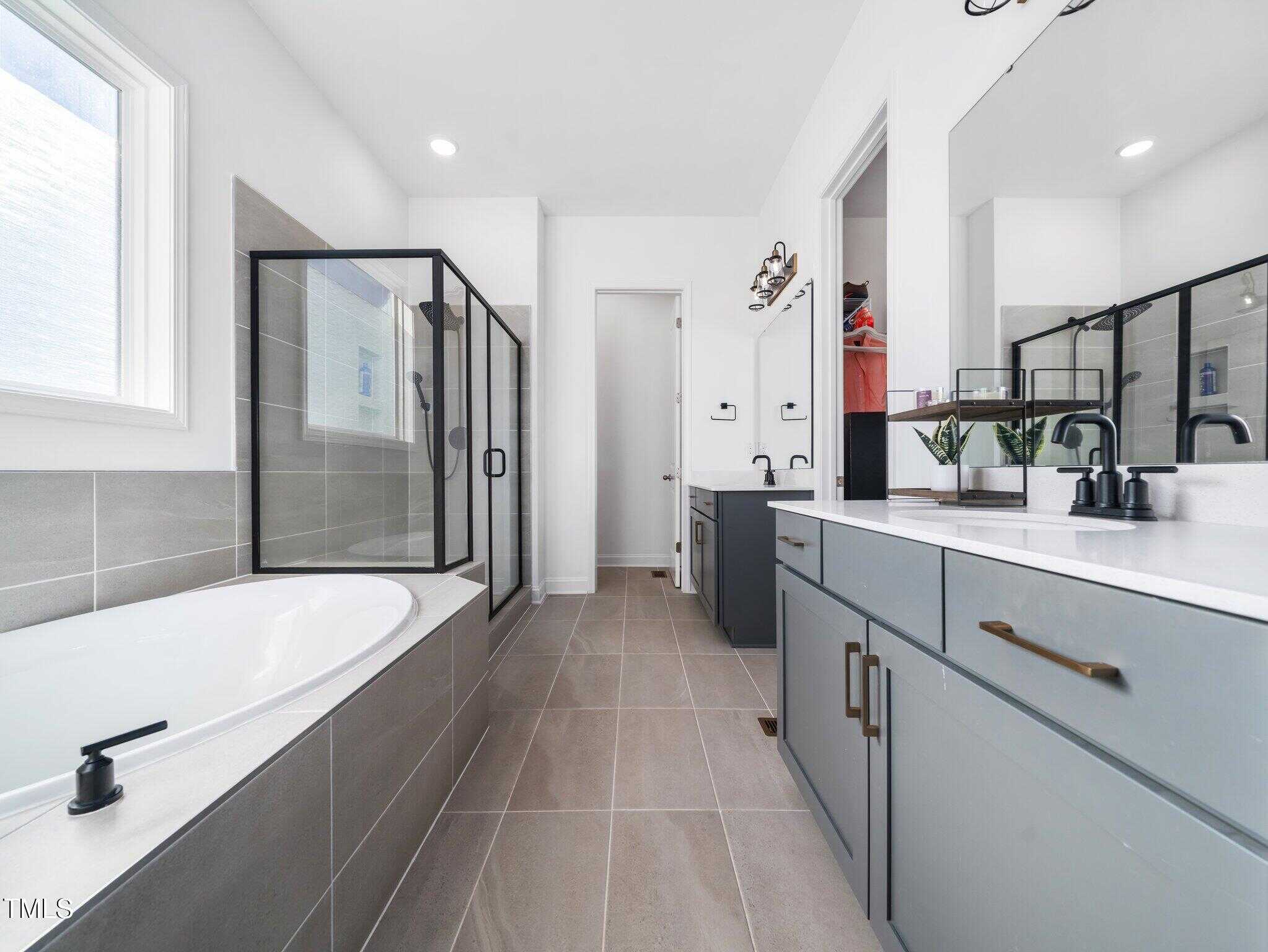 This modern farmhouse was designed with comfort and style in mind, featuring a first-floor master suite that serves as a peaceful retreat with dual vanities, a garden tub, a separate shower, and a huge walk-in closet.