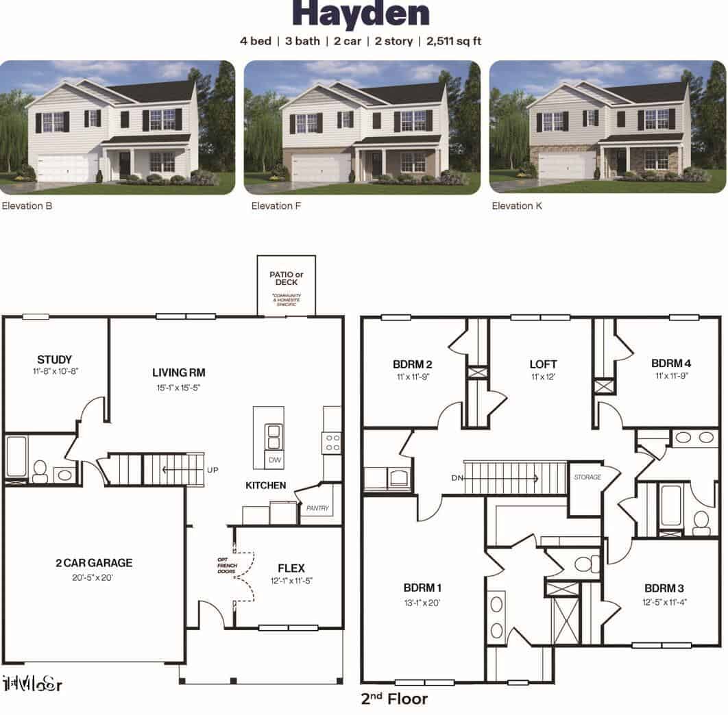 Welcome to the Hayden! This home features 4 bedrooms, 3 bathrooms, 2,511 sq. ft. of living space, and a 2-car garage and 10X12 deck. Upon entering the home, you’ll be greeted by an inviting foyer passing by the flex room, then led into the center of the home. This open-concept space features a functional kitchen overlooking the living room, a breakfast area, a 1st floor study located beside full bath. The kitchen is equipped with a corner walk-in pantry, quartz countertops, stainless steel appliances, kitchen island, and a breakfast area. From the breakfast area you can step out onto the deck, perfect for entertaining guests or relaxing after a long day.