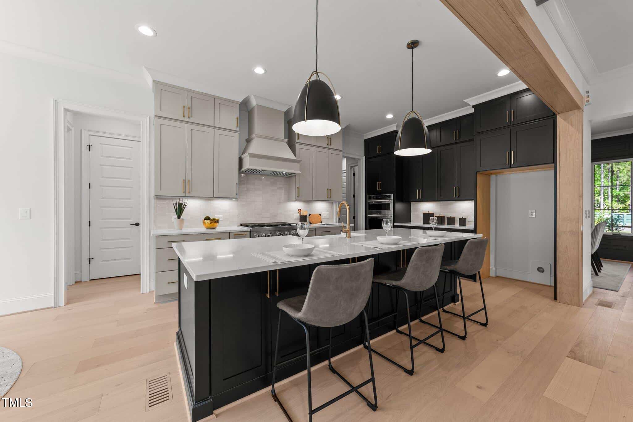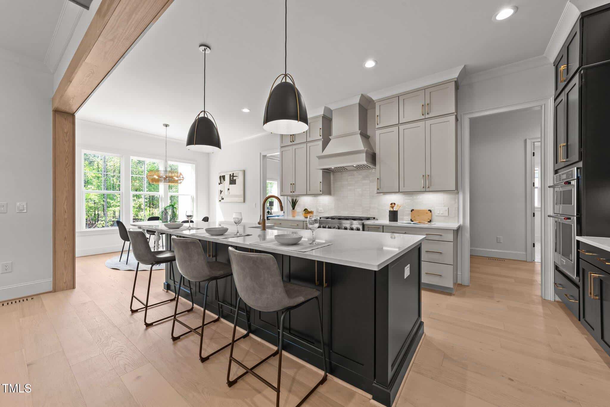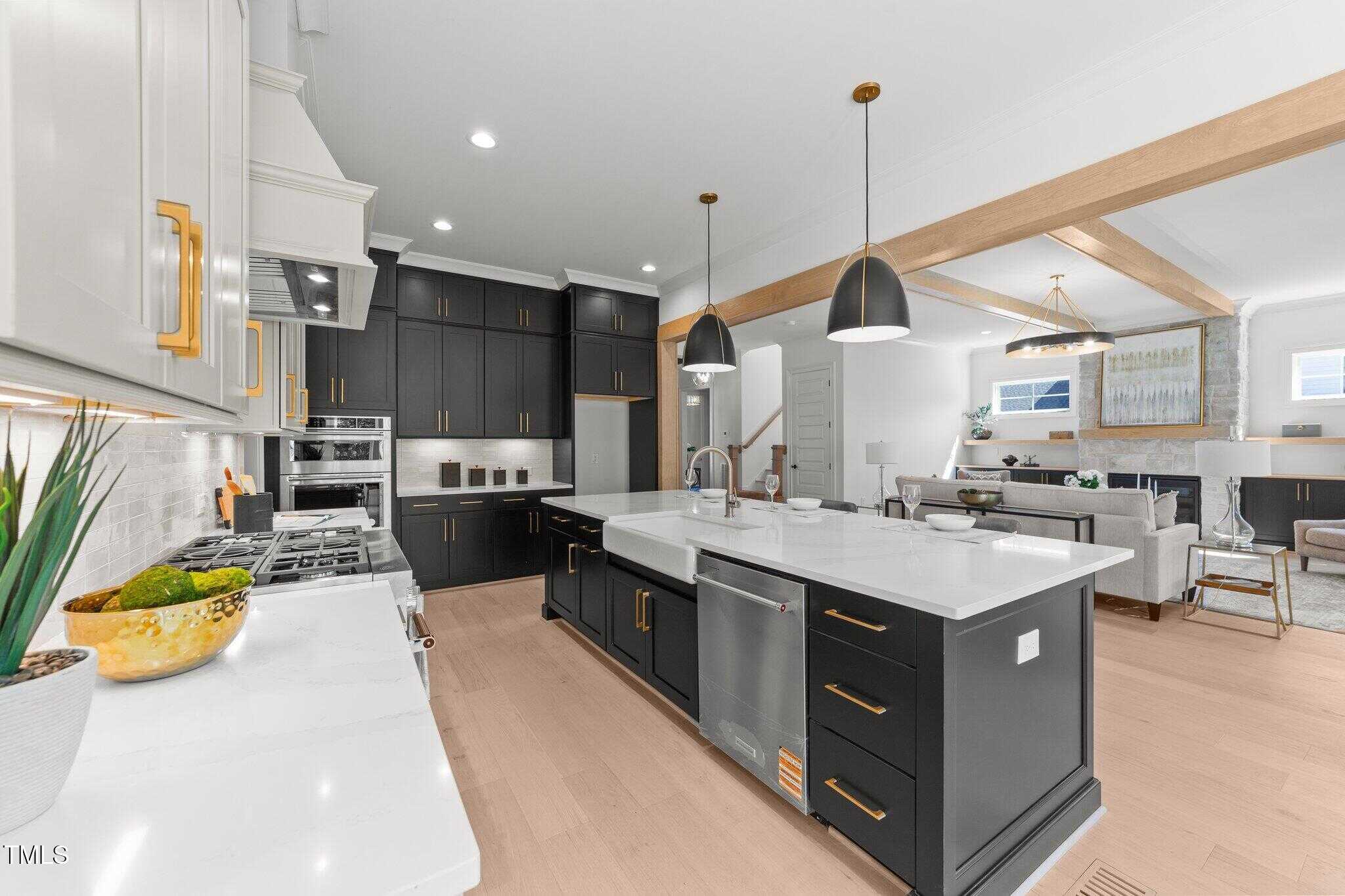 3 Car, Side Entry Garage! Wide Plank HWDs Through Main Living! Gourmet Kit: White Quartz Countertops, Custom Two Tone Painted Cabinetry, White Gloss Tile Backsplash, Oversized Island w/White Farm Sink, Designer Pendants, KitchenAid SS Appls Incl 6-Burner Gas Range, Convection/Wall Oven & Dishwasher & Walk in Pantry! Formal & Informal Dining!