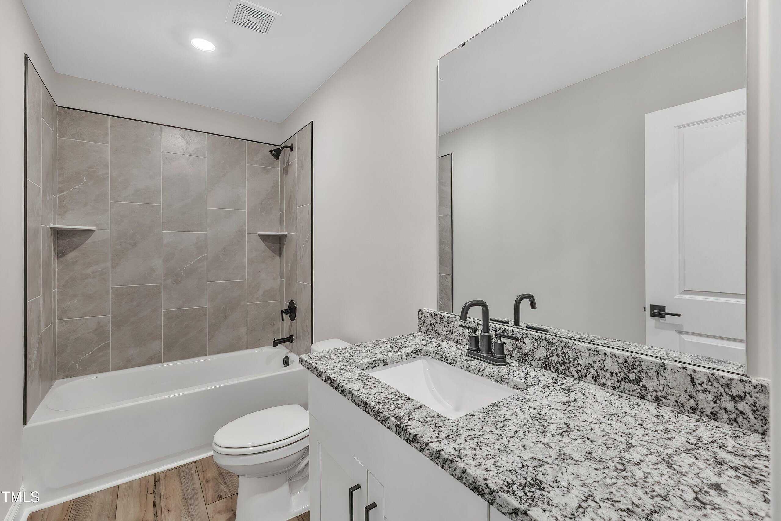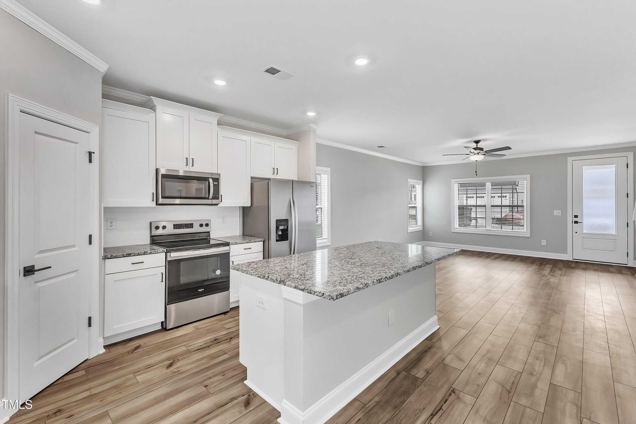 This one & half story home has 3 beds, 2 baths and spacious common areas. An expansive covered patio off the living room provides a great place for outdoor dining and relaxation. Off the dining area, you’ll find a study ideal for a home office. The kitchen showcases granite countertops, recessed lighting, and white cabinets with hardware plus stainless steel kitchen appliances. A large island separates the kitchen from the family room, providing the ideal place for serving food.