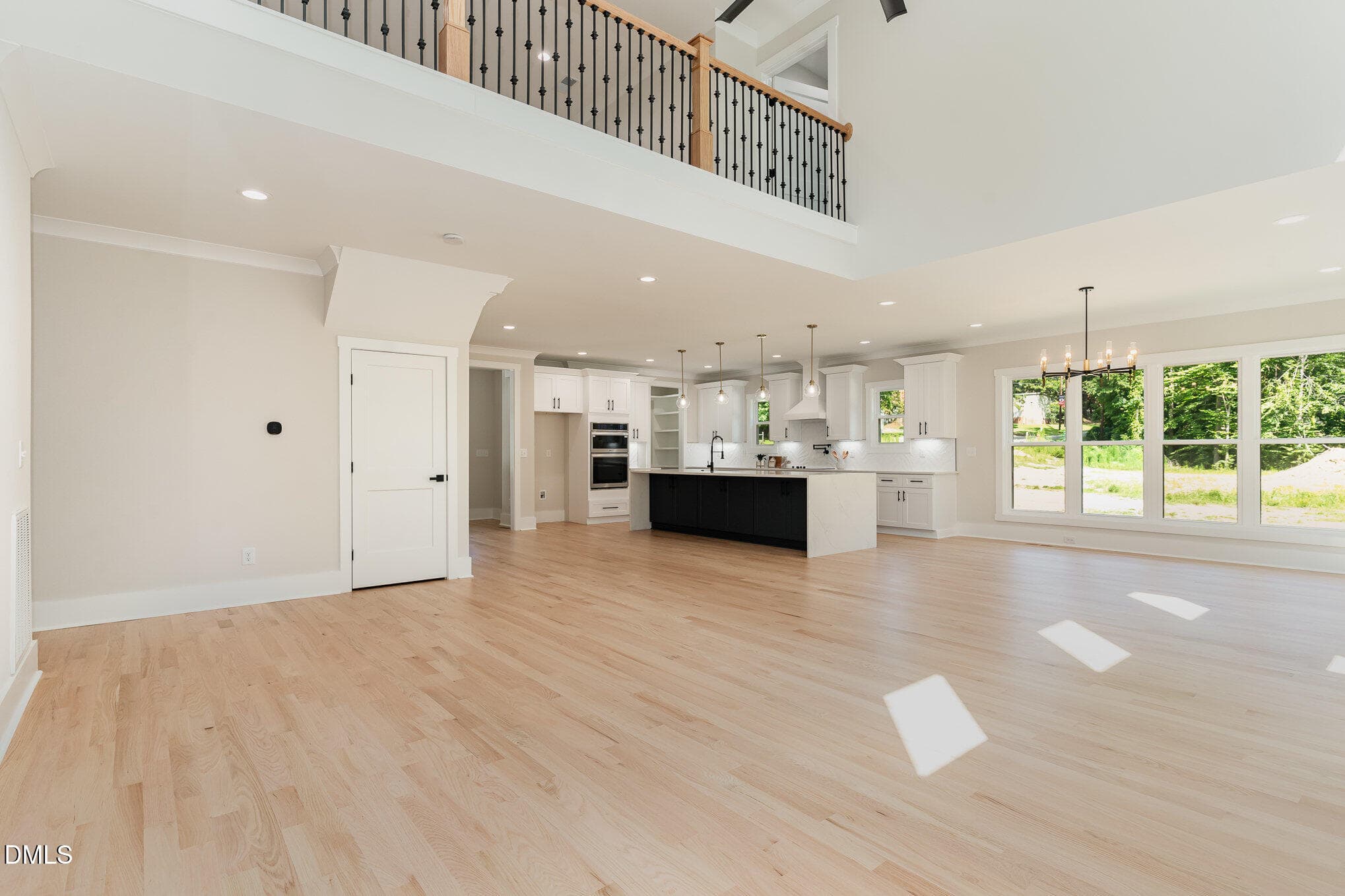 The gourmet kitchen is the centerpiece of the home, showcasing a massive 10-foot island, quartz countertops, stainless steel appliances, stylish cabinetry, and a walk-in pantry. The kitchen flows into the spacious living area with dramatic ceilings and a second-floor overlook, creating a bright and inviting space ideal for entertaining.