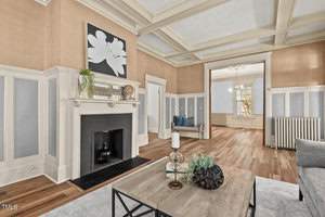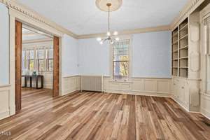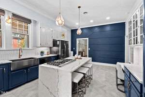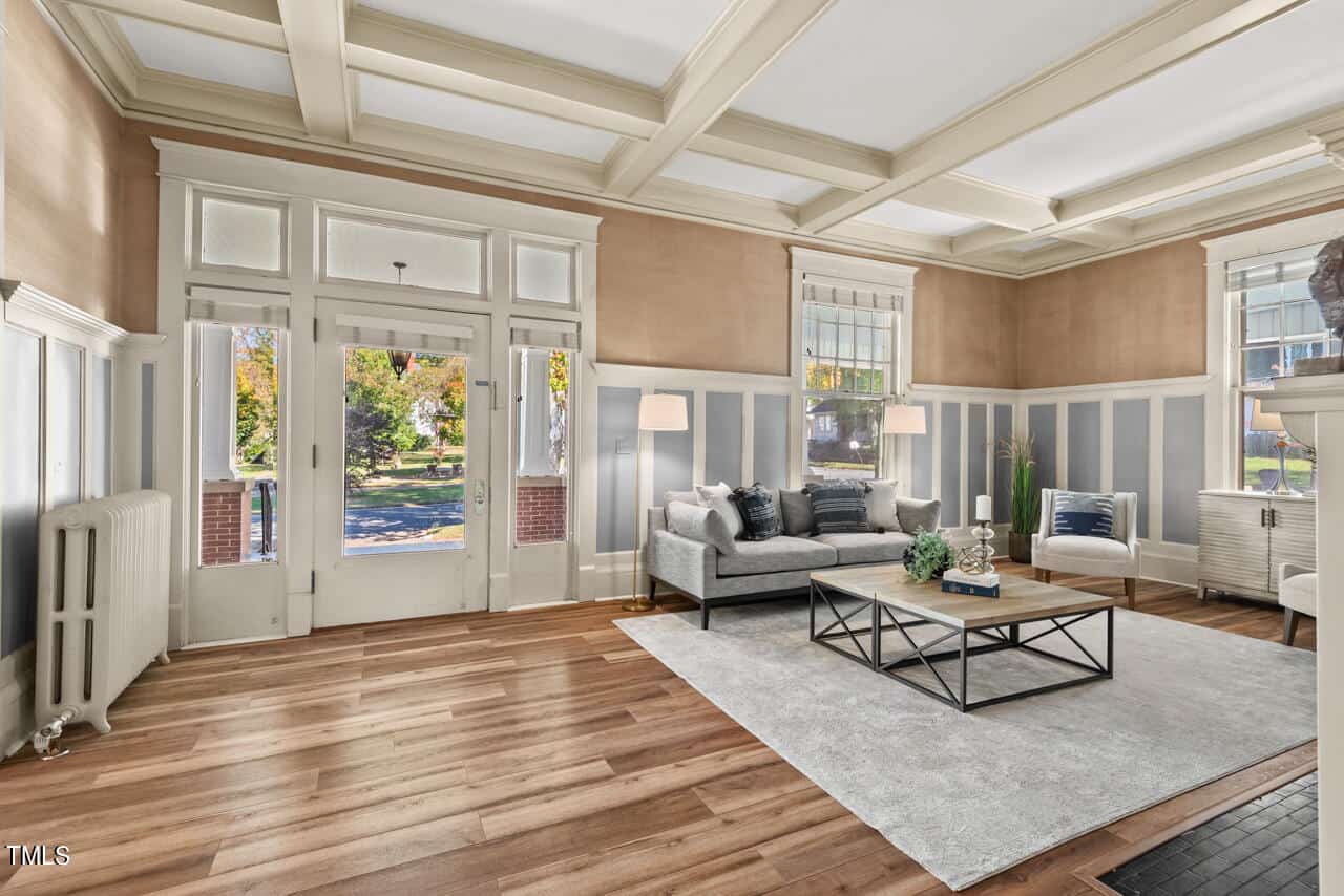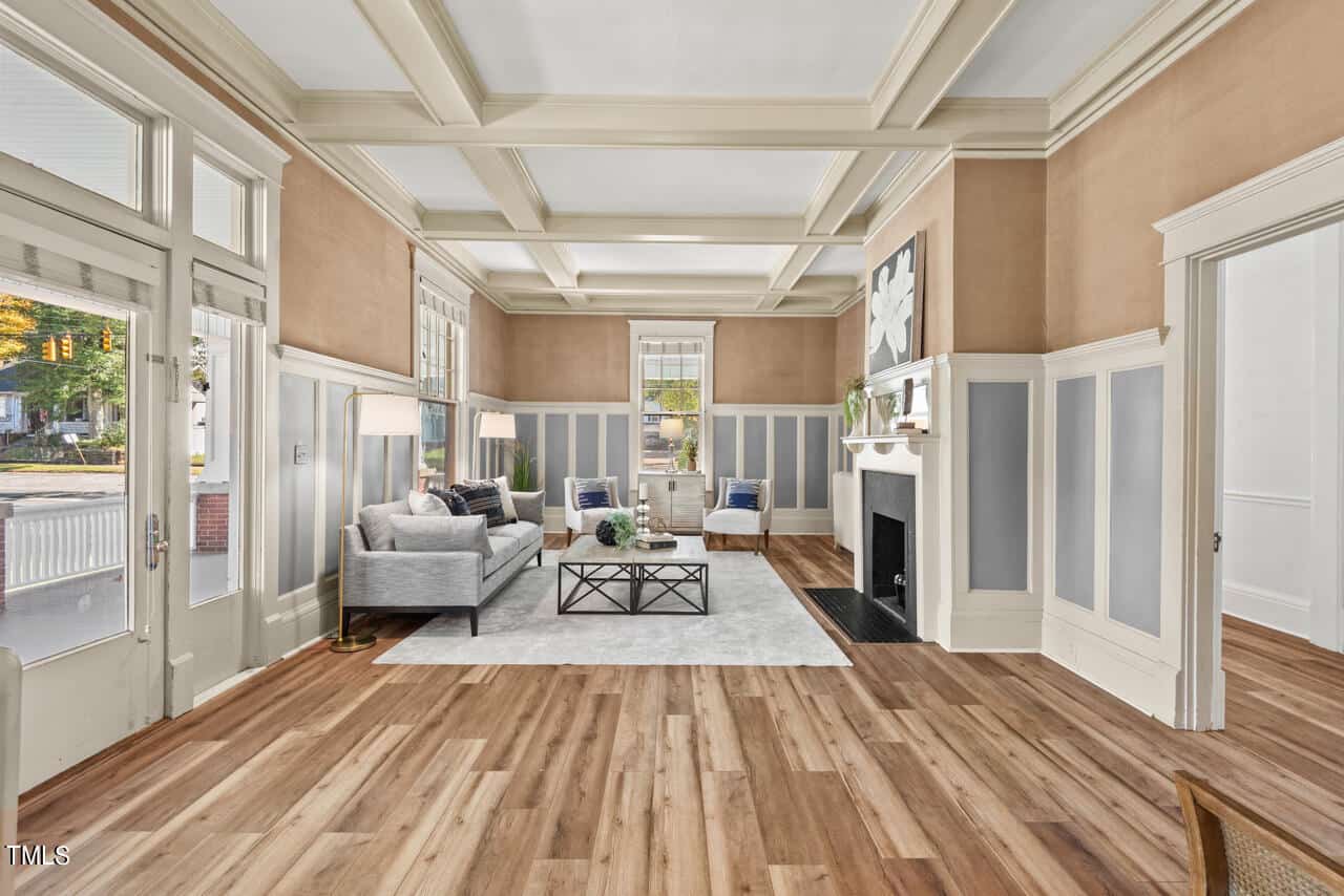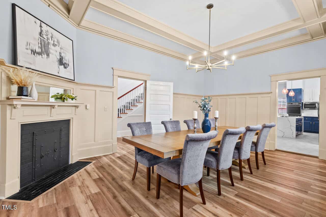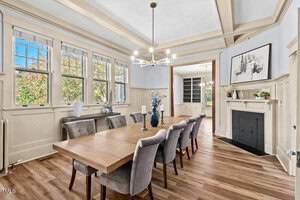 As you approach the home, you’ll be greeted by a huge wrap-around porch, an inviting space to relax and enjoy the charming neighborhood. Step inside to discover stunning 12-inch coffered ceilings in the dining room, adding a touch of elegance to your dining experiences.