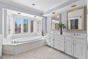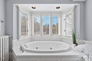 The first-floor primary bedroom suite offers a luxurious ensuite bathroom complete with a whirlpool tub, perfect for unwinding after a long day. The updated kitchen is a chef’s dream, featuring new appliances, a stylish backsplash, and ample counter space for meal preparation.