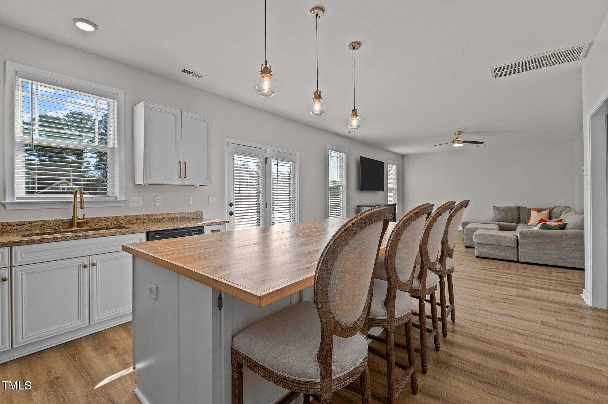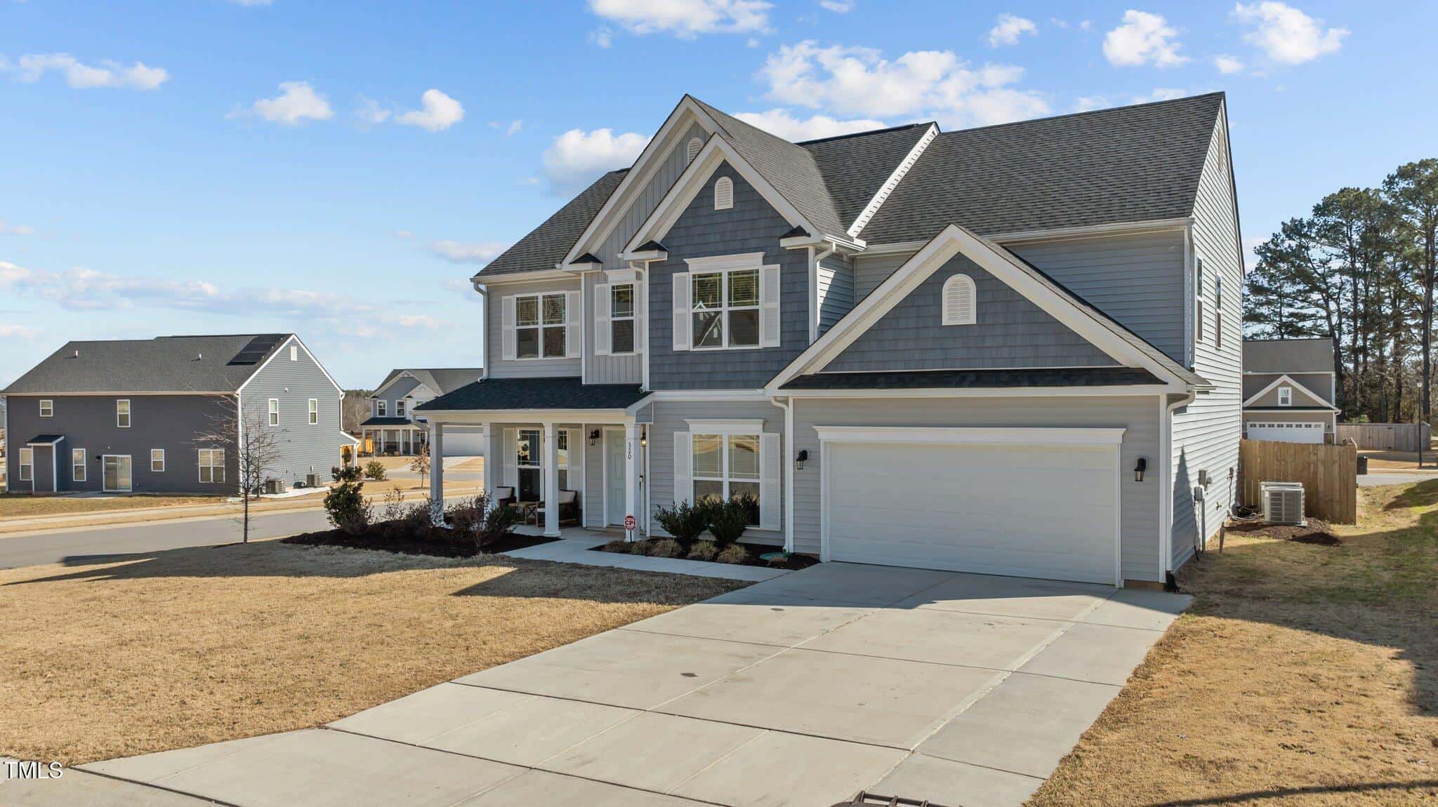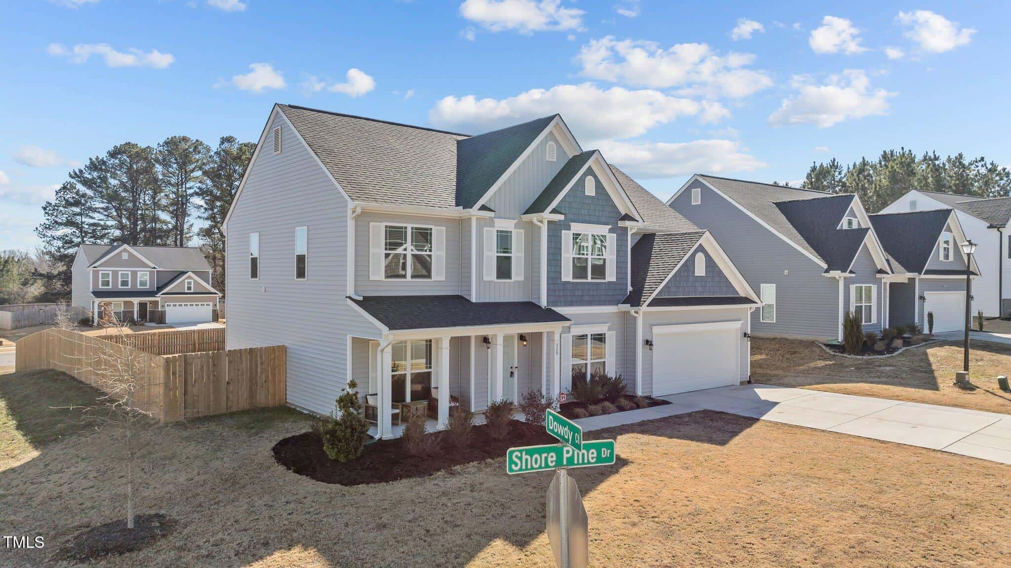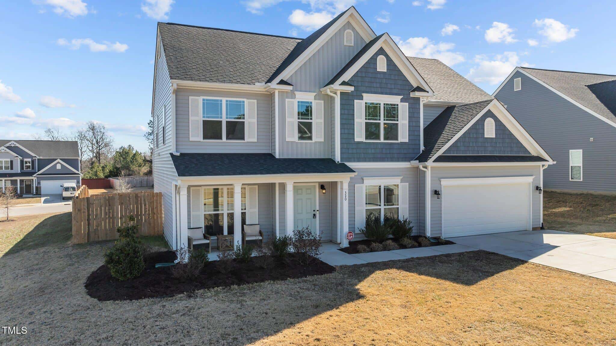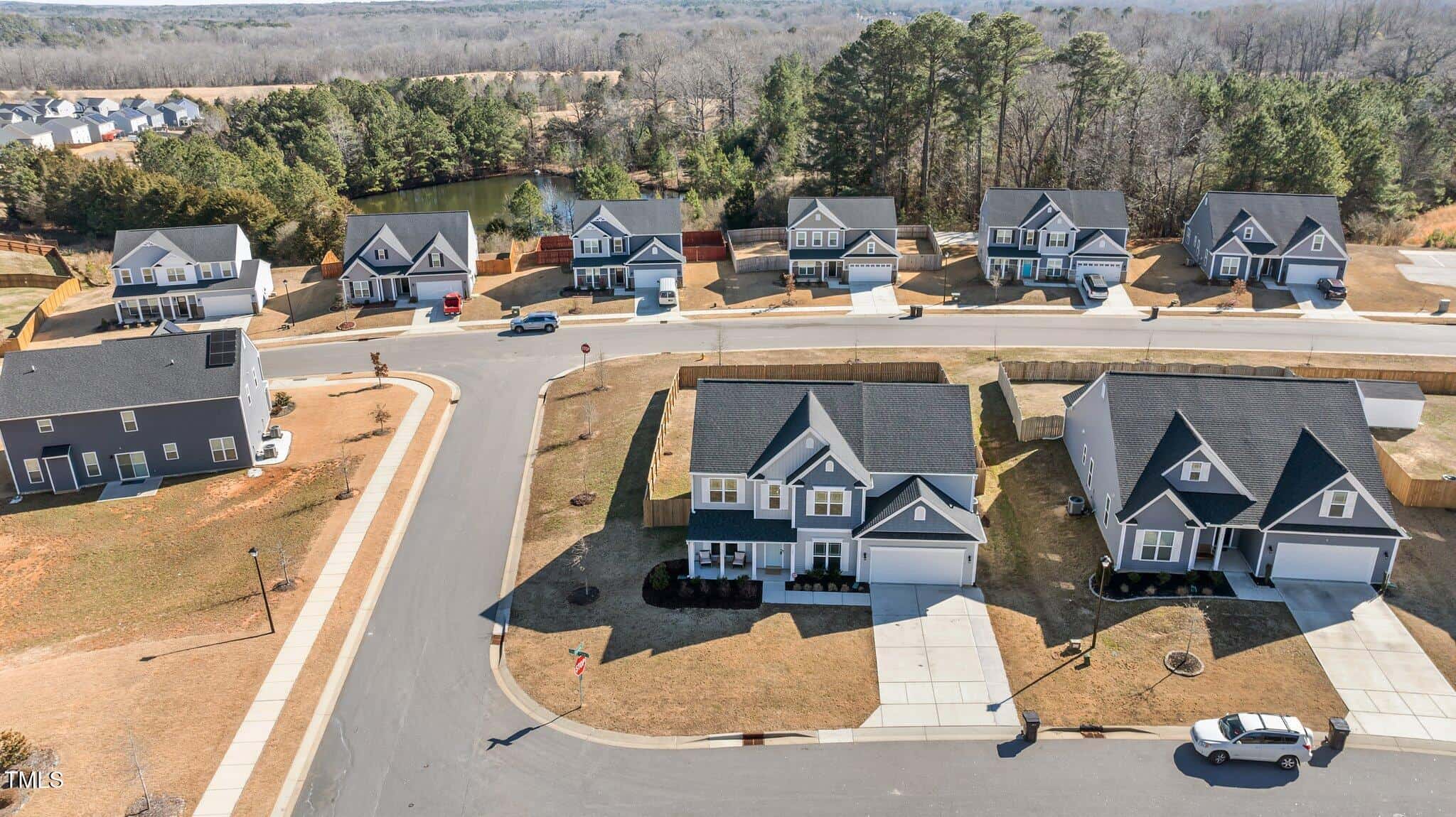 This is the One! Gorgeous, better-than-new two-story home located on a large flat corner lot with amazing curb appeal! The home is meticulously maintained and offers a huge fenced rear yard, perfect for outdoor activities or relaxation. Enjoy the extended driveway and oversized walk-out patio in the back. The charming front porch offers the perfect space to unwind and enjoy your peaceful surroundings. Situated next to a cul-de-sac, this home is also part of a walkable, family-friendly neighborhood. Step inside and be greeted by a spacious vaulted foyer entry, setting the tone for the rest of the home. The main level includes two home offices, each featuring brand-new custom-built cabinets and shelving—ideal for remote work or study. A flexible space, currently used as a dining area, provides additional versatility. The heart of the home is the beautifully remodeled kitchen, which includes granite countertops, an oversized butcher block eat-in island, custom cabinetry, and a smart fridge. Do not miss the awesome custom pantry complete with new custom cabinets, shelving and a coffee bar! The kitchen overlooks the large family room, making it perfect for entertaining and there is a walk-out patio as well where you have views of the backyard from your family room and the windows at the kitchen sink. You’ll love the new luxury vinyl plank (LVP) flooring throughout the main level, including the staircase and primary bedroom. Upstairs, the enormous primary bedroom offers a sitting area, a walk-in closet, and a spacious en-suite bathroom. Three additional generously sized guest bedrooms provide ample space for family or guests. A beautifully designed full bath completes the upper level. This home is just a short drive from downtown Youngsville, Wake Forest, North Raleigh, and Durham, giving you easy access to dining, shopping, and entertainment. Don’t miss out on the chance to make this stunning property yours—schedule a showing today!