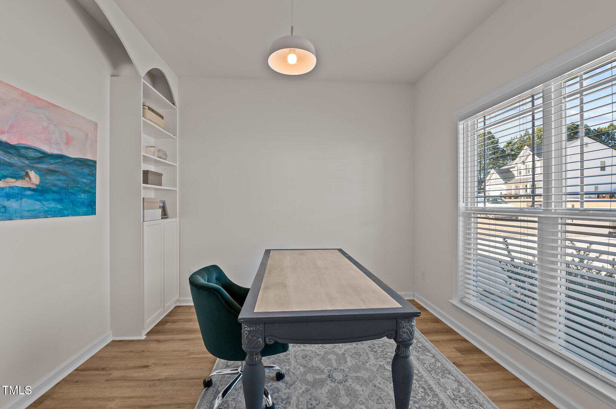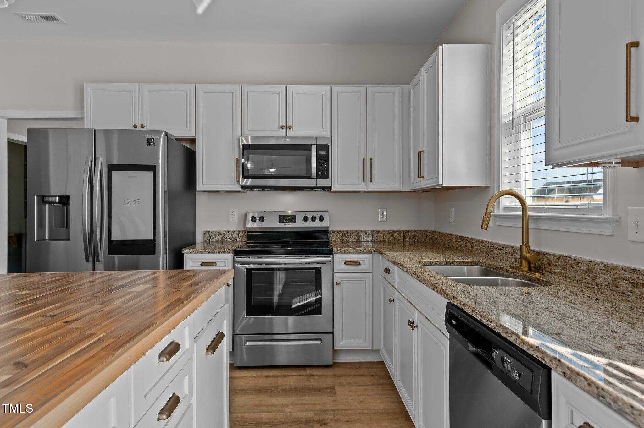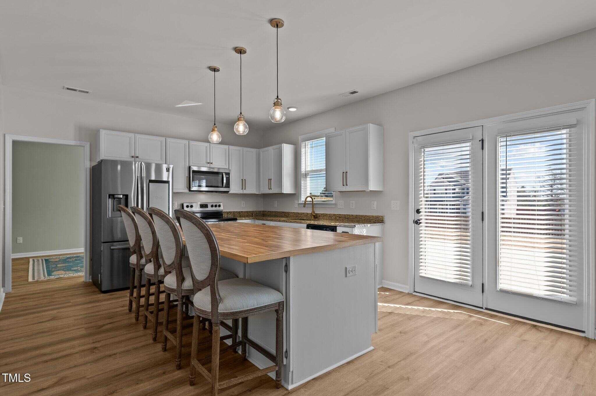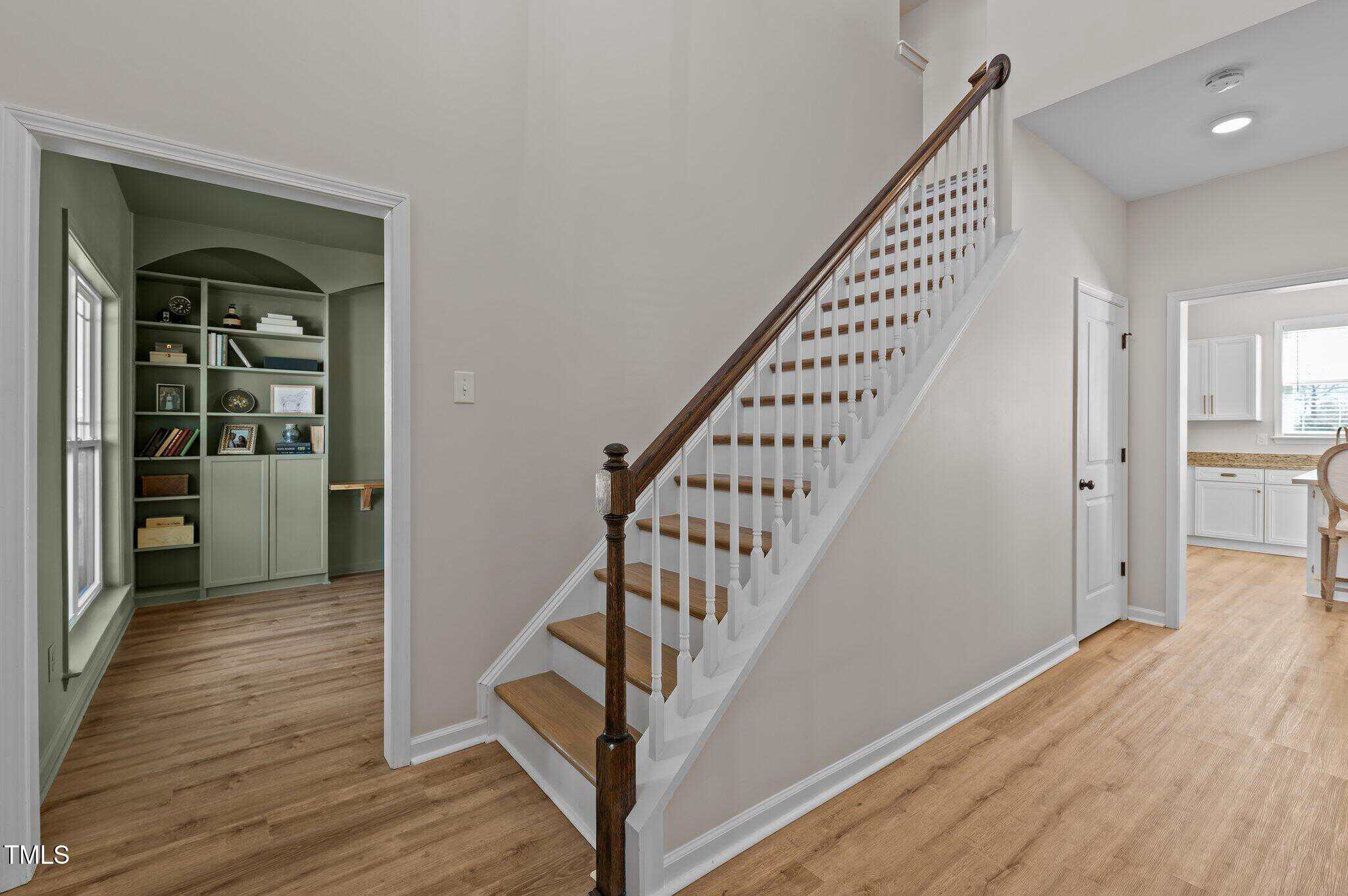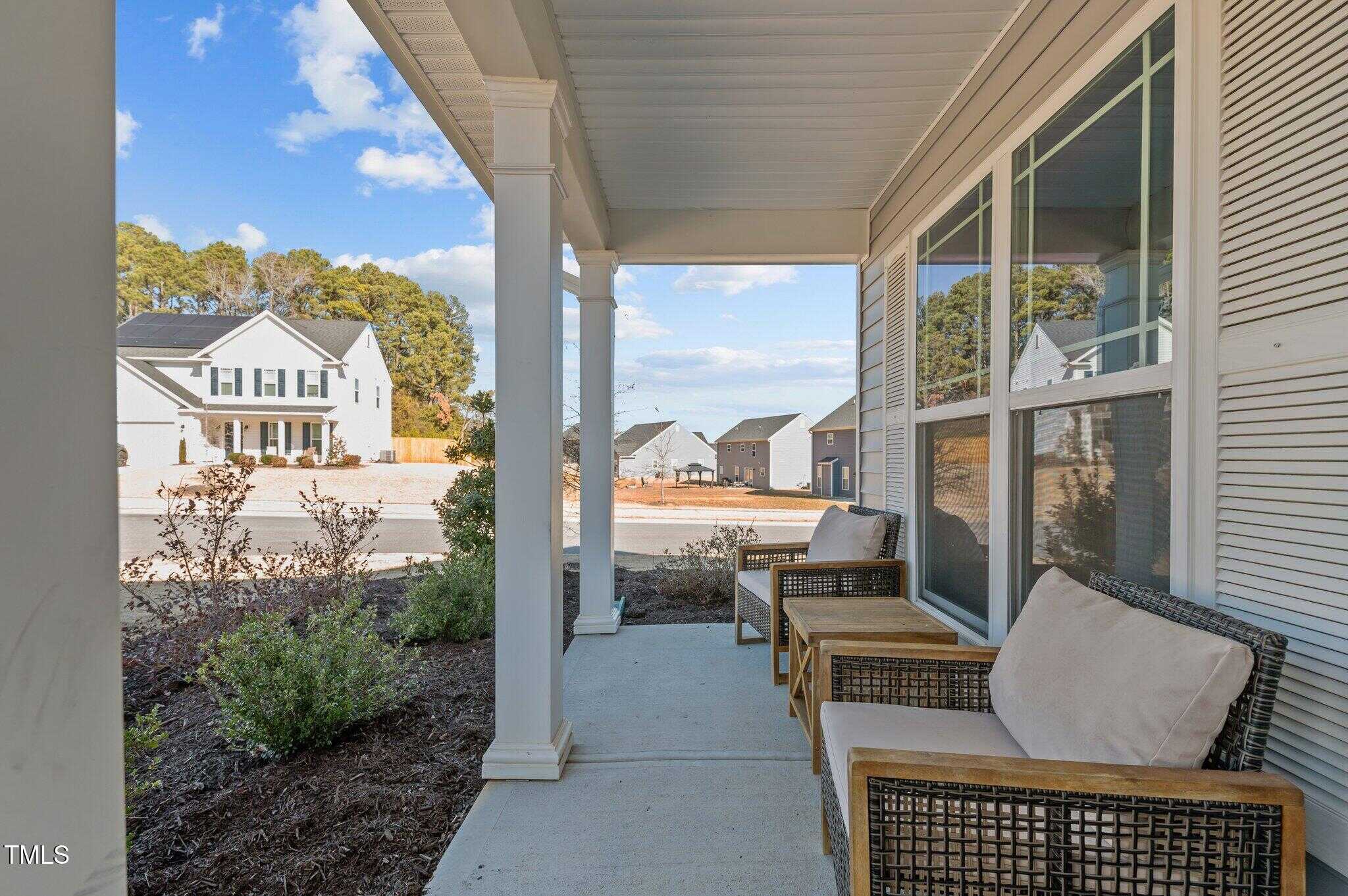 This is the One! Gorgeous, better-than-new two-story home located on a large flat corner lot with amazing curb appeal! The home is meticulously maintained and offers a huge fenced rear yard, perfect for outdoor activities or relaxation. Enjoy the extended driveway and oversized walk-out patio in the back. The charming front porch offers the perfect space to unwind and enjoy your peaceful surroundings. Situated next to a cul-de-sac, this home is also part of a walkable, family-friendly neighborhood. Step inside and be greeted by a spacious vaulted foyer entry, setting the tone for the rest of the home. The main level includes two home offices, each featuring brand-new custom-built cabinets and shelving—ideal for remote work or study. A flexible space, currently used as a dining area, provides additional versatility. The heart of the home is the beautifully remodeled kitchen, which includes granite countertops, an oversized butcher block eat-in island, custom cabinetry, and a smart fridge. Do not miss the awesome custom pantry complete with new custom cabinets, shelving and a coffee bar! The kitchen overlooks the large family room, making it perfect for entertaining and there is a walk-out patio as well where you have views of the backyard from your family room and the windows at the kitchen sink. You’ll love the new luxury vinyl plank (LVP) flooring throughout the main level, including the staircase and primary bedroom. Upstairs, the enormous primary bedroom offers a sitting area, a walk-in closet, and a spacious en-suite bathroom. Three additional generously sized guest bedrooms provide ample space for family or guests. A beautifully designed full bath completes the upper level. This home is just a short drive from downtown Youngsville, Wake Forest, North Raleigh, and Durham, giving you easy access to dining, shopping, and entertainment. Don’t miss out on the chance to make this stunning property yours—schedule a showing today!