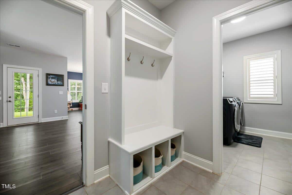 The thoughtful layout includes a convenient laundry area with a powder room and a mudroom, complete with cubby space designed for organization and easeโan ideal drop-off zone for busy households. The first-floor primary suite is a true retreat, offering a large bedroom, a spa-like bath, and a generous walk-in closet that provides both comfort and practicality.