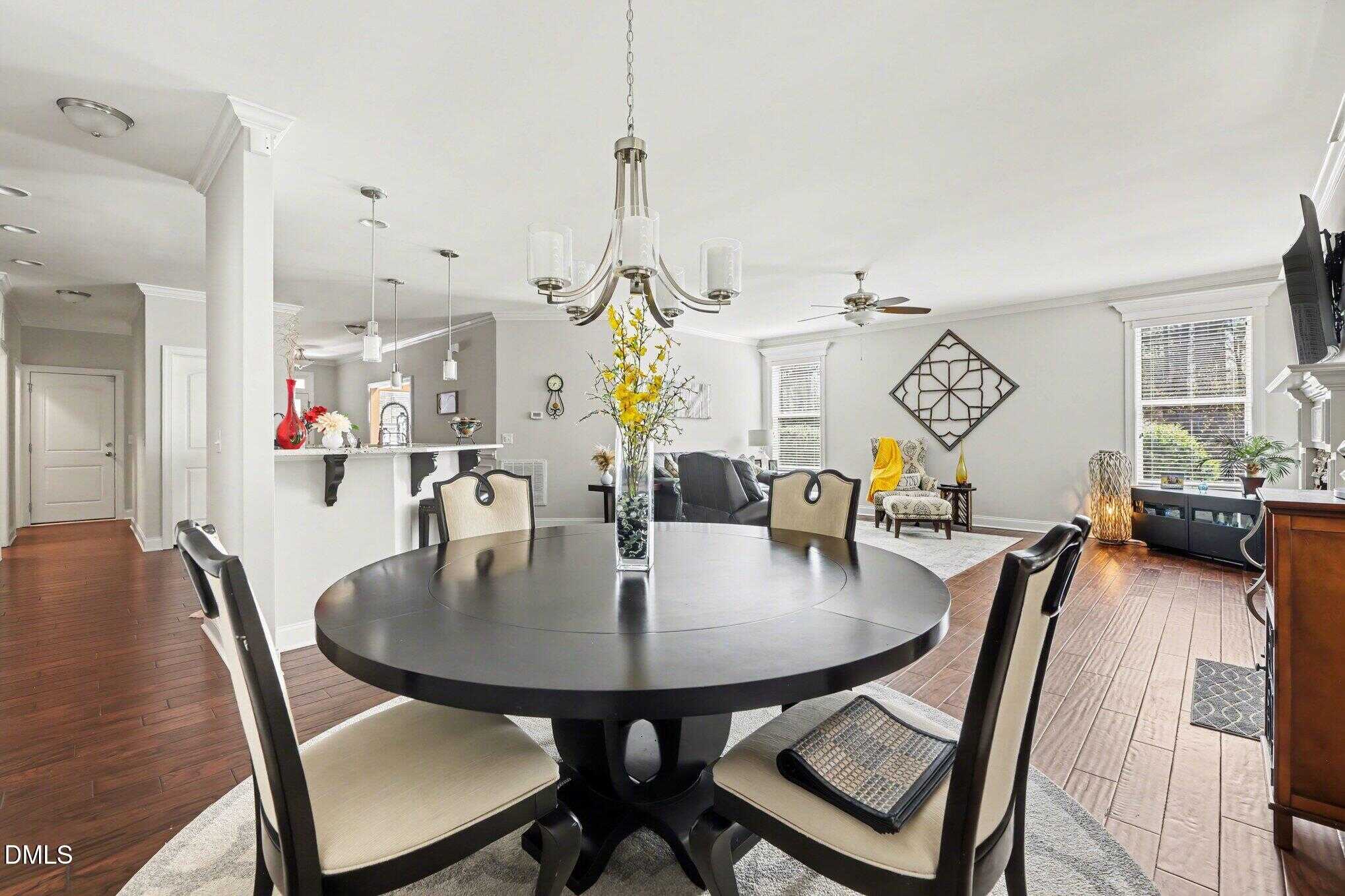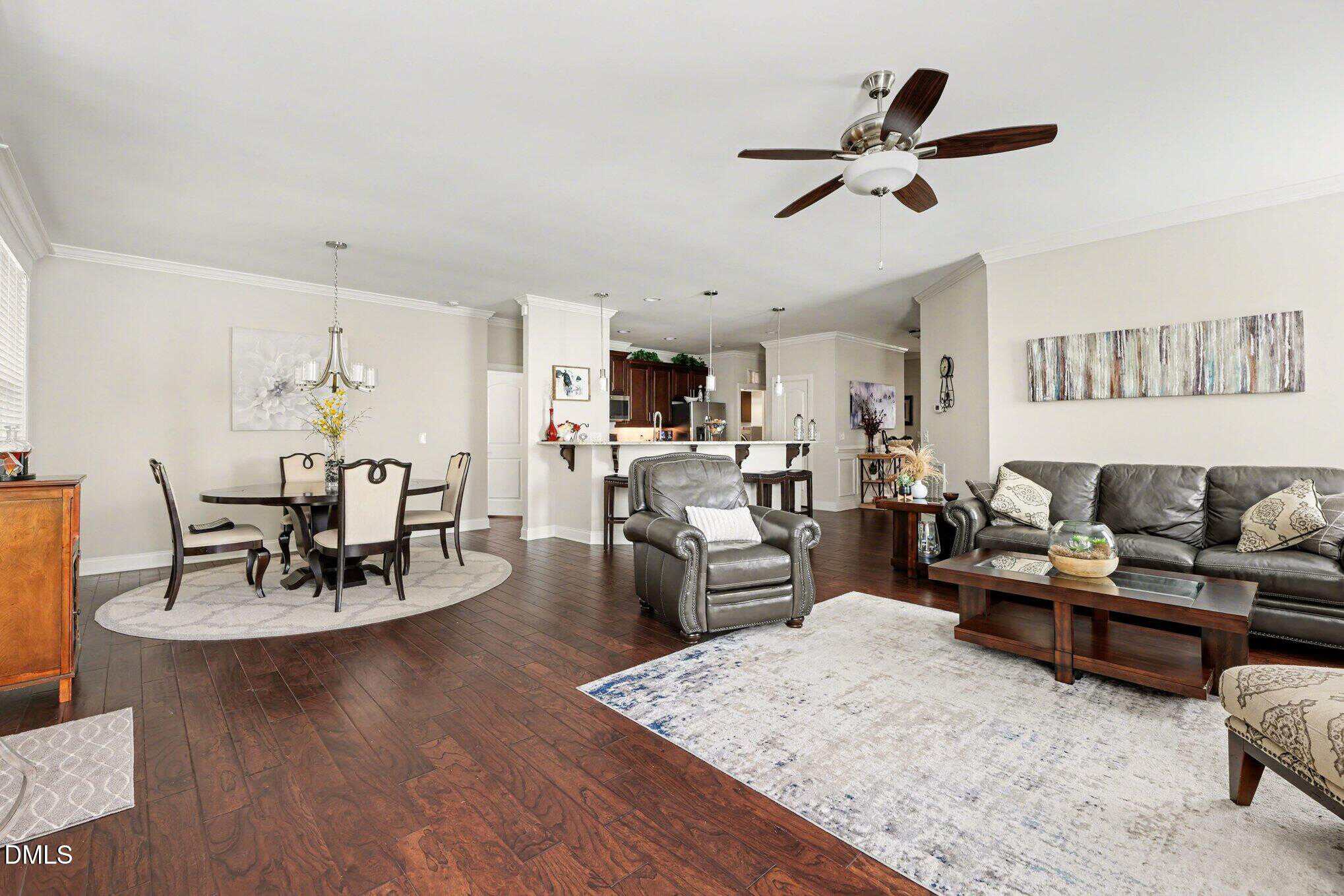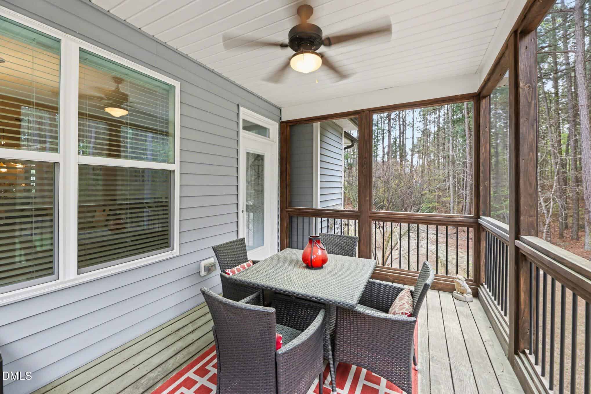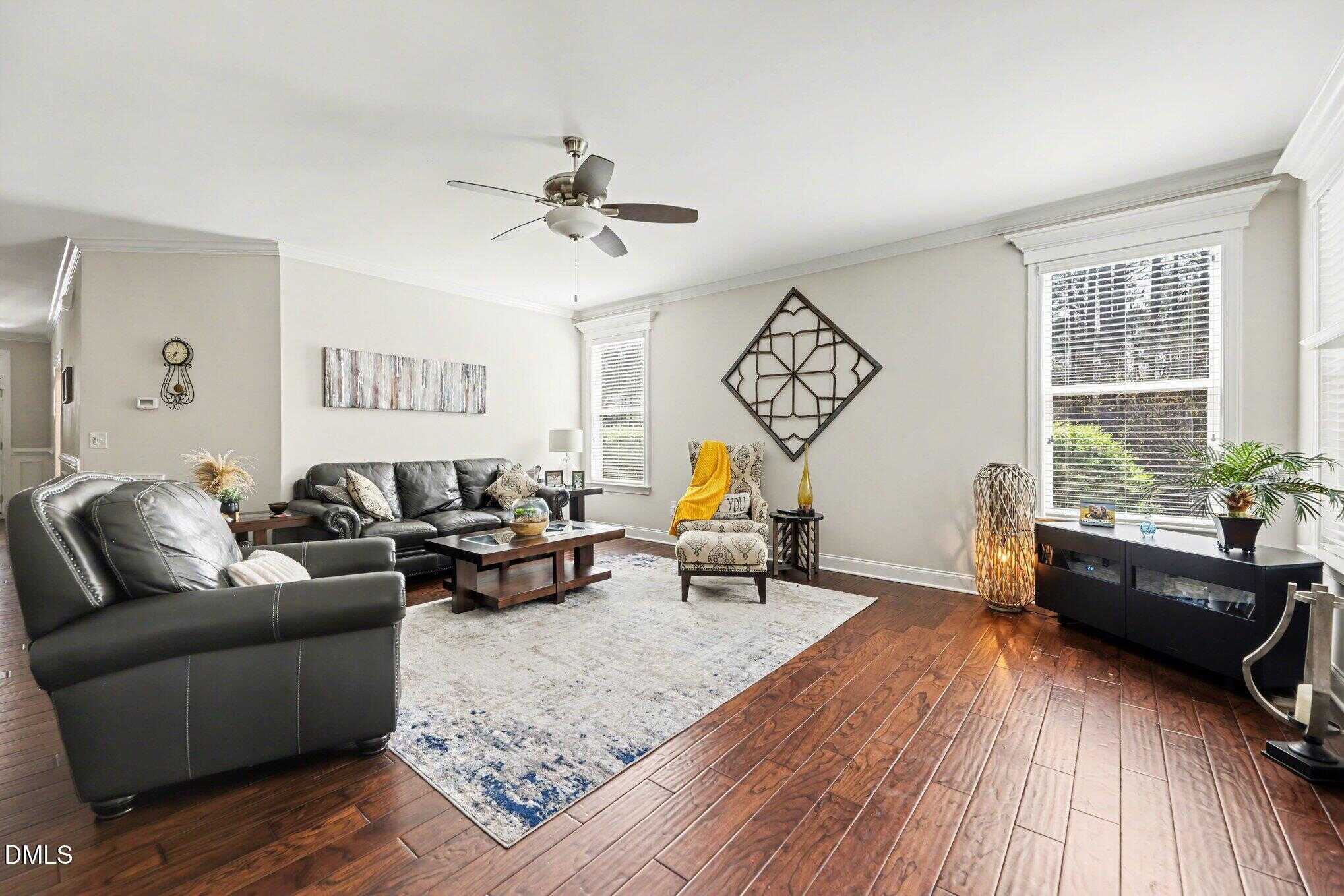 The spacious family room offers a custom gas log fireplace with mantle, crown molding, custom head casting on windows, ceiling fan, and direct access to the screened porch ideal for relaxing or entertaining.