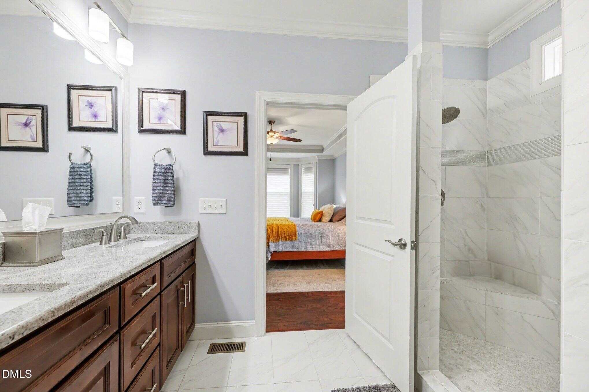 The main-level primary suite is a true retreat with tray ceiling, ceiling fan, bay window with blackout blinds, Primary bath featuring a 7-ft dual walk-in tile shower, dual vanity with granite tops, linen closet, private water closet, and large walk-in closet.