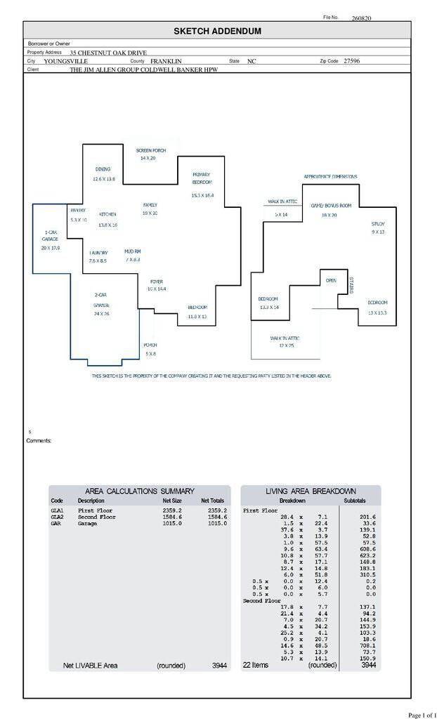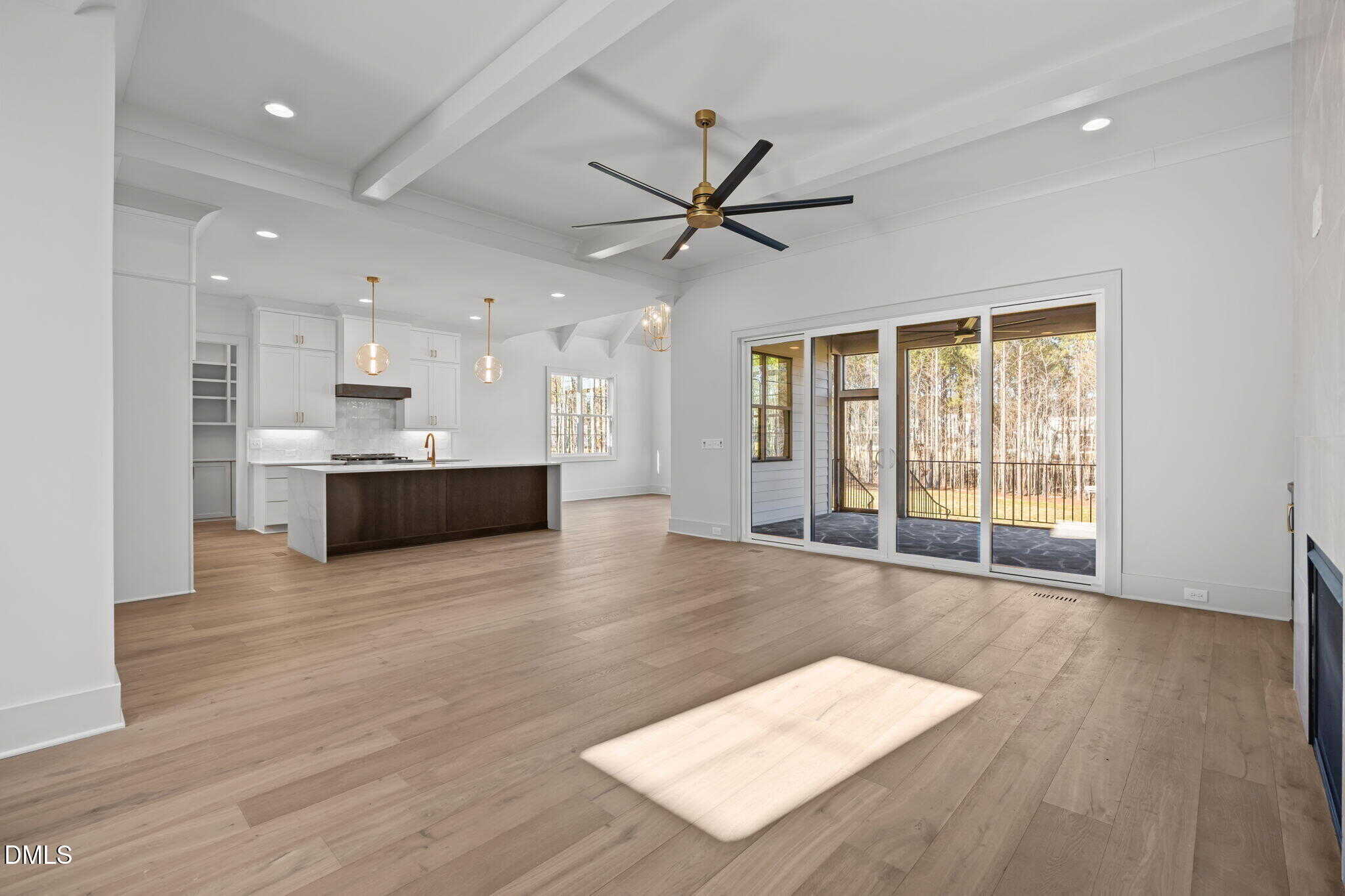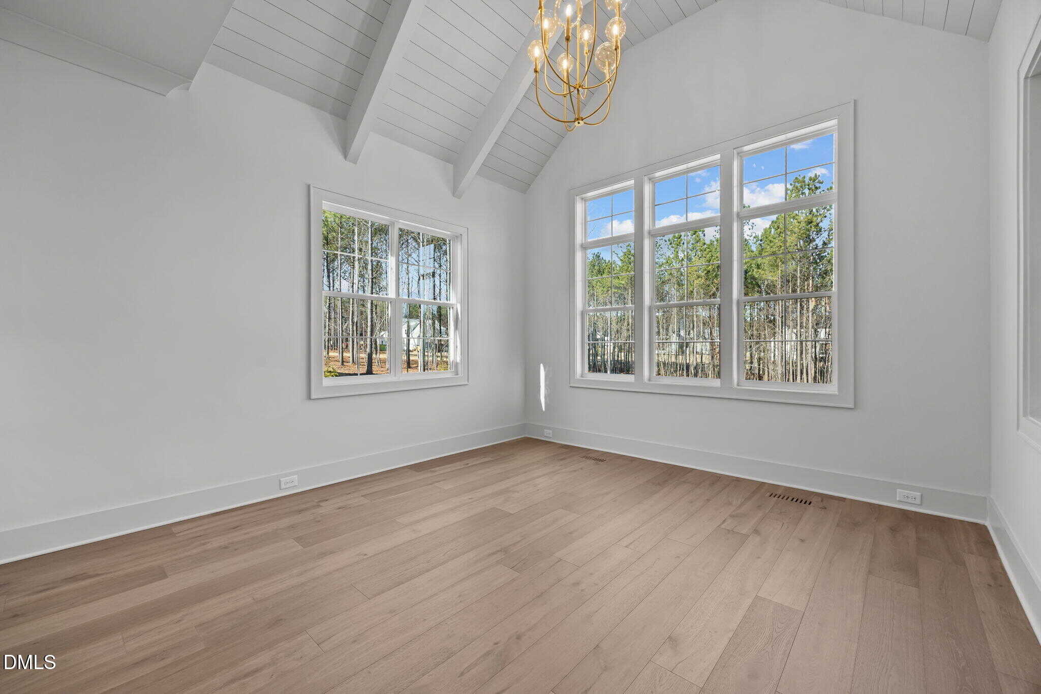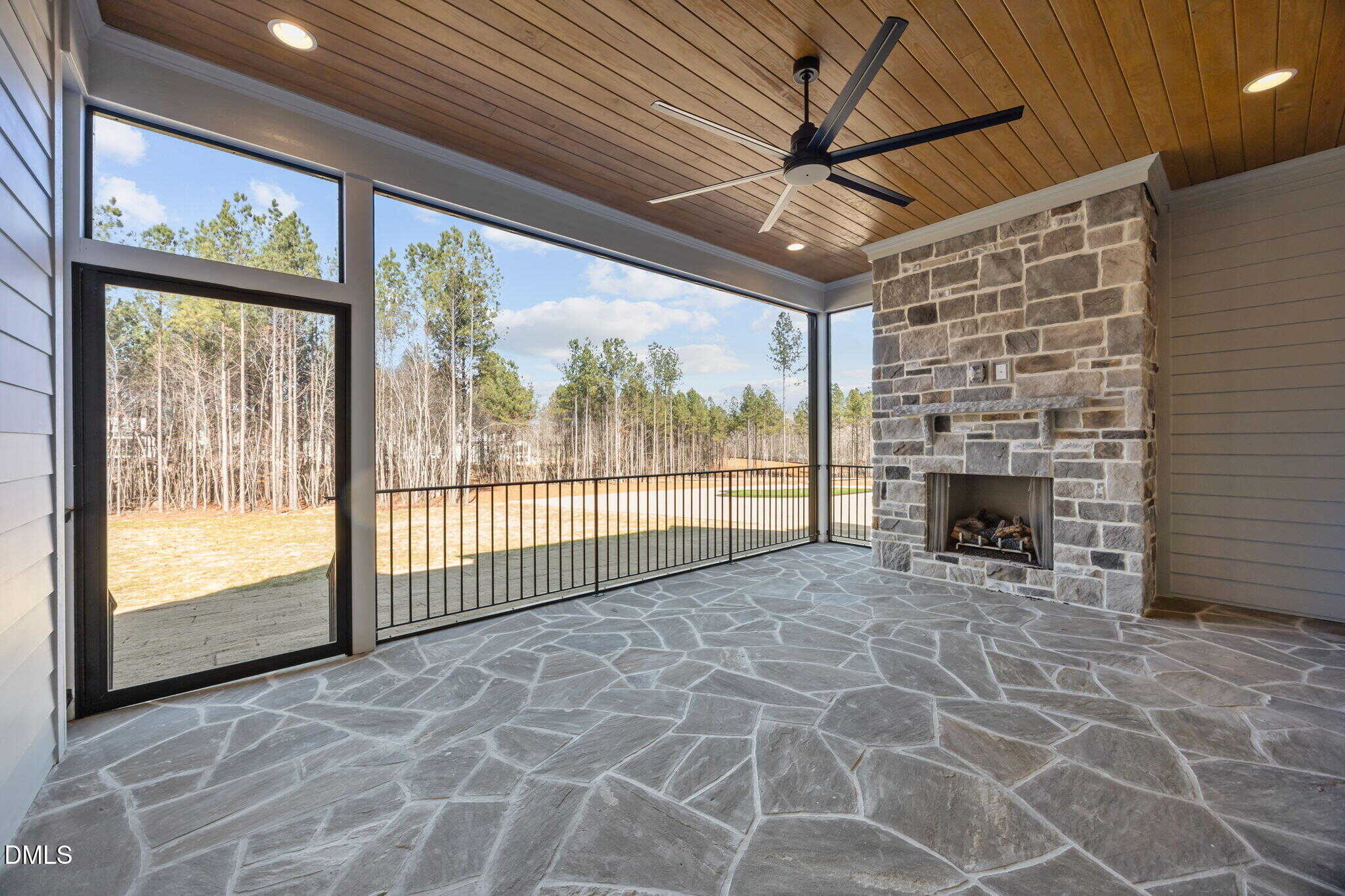 Custom built by Wilks Builders in the exclusive Sorrell Oaks community of Youngsville. Offering 3800 square feet with a soaring two-strory foyer entry and wide plank hardwoods throughout the main living areas. Designer lighting, upgraded trimwork and elegant finishes span throughout! The gourmet kitchen features a quartz island with waterfall edge and designer pendant lights, custom ceiling-height white painted cabinetry, stainless steel appliances includign a gas range and huge walk-in pantry, all opening to the vaulted dining area with exposed beams and shiplap accents. The main level primary suite with vaulted ceiling, hardwood flooring and luxurious en-suite bath with a zero-entry spa style shower wrapped with tile to ceiling, transoms and a freestanding tub, a painted dual vanity with quartz top and designer sconces and walk-in closet with custom built-ins. The family room features painted ceiling beams, gas fireplace with tile to ceiling surround and flanking built-in cabinets topped with floating shelves and a multi-slider to the rear screened porch with flagstone flooring and stone surround fireplace overlooking a huge, flat backyard! Upstairs offers a recreational room with buit-in wet bar, dedicated study, walk-in storage area and two spacious en-suite bedrooms!