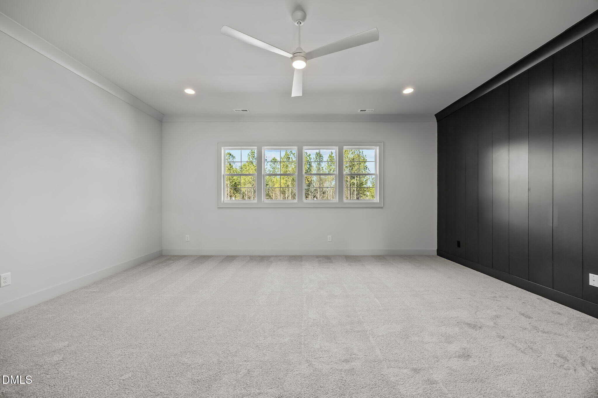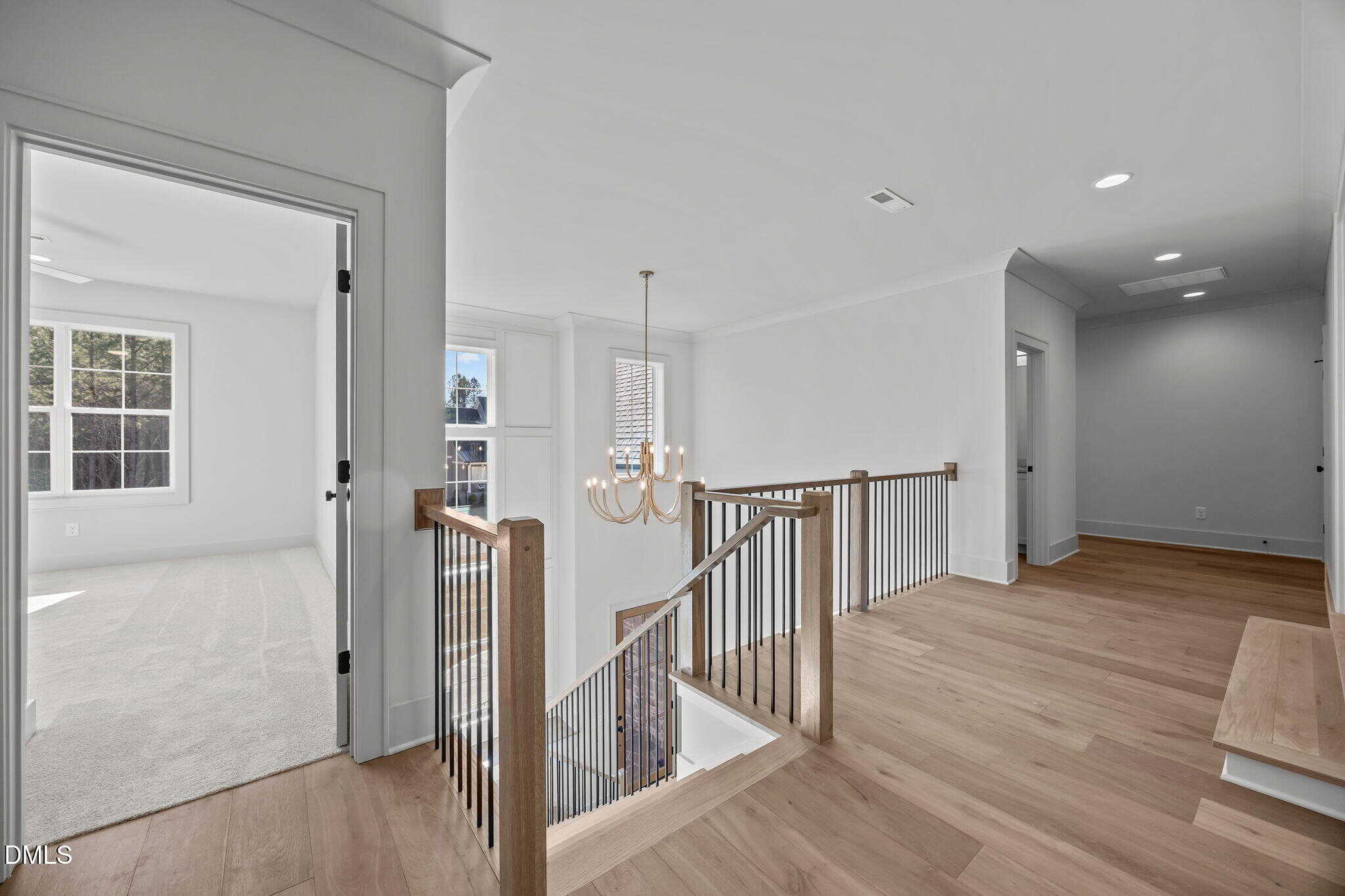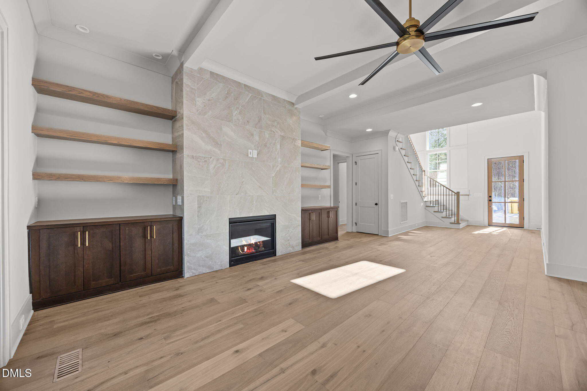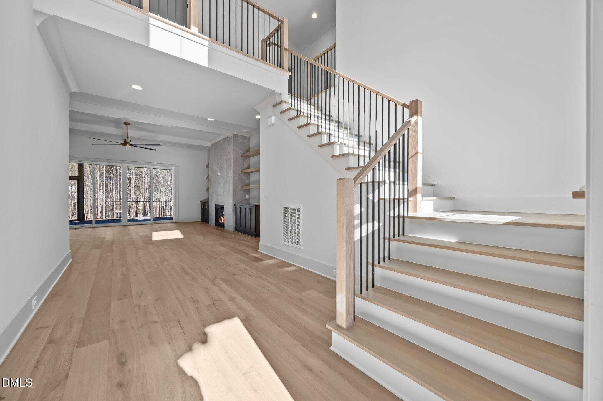 Custom built by Wilks Builders in the exclusive Sorrell Oaks community of Youngsville. Offering 3800 square feet with a soaring two-strory foyer entry and wide plank hardwoods throughout the main living areas. Designer lighting, upgraded trimwork and elegant finishes span throughout! The gourmet kitchen features a quartz island with waterfall edge and designer pendant lights, custom ceiling-height white painted cabinetry, stainless steel appliances includign a gas range and huge walk-in pantry, all opening to the vaulted dining area with exposed beams and shiplap accents. The main level primary suite with vaulted ceiling, hardwood flooring and luxurious en-suite bath with a zero-entry spa style shower wrapped with tile to ceiling, transoms and a freestanding tub, a painted dual vanity with quartz top and designer sconces and walk-in closet with custom built-ins. The family room features painted ceiling beams, gas fireplace with tile to ceiling surround and flanking built-in cabinets topped with floating shelves and a multi-slider to the rear screened porch with flagstone flooring and stone surround fireplace overlooking a huge, flat backyard! Upstairs offers a recreational room with buit-in wet bar, dedicated study, walk-in storage area and two spacious en-suite bedrooms!