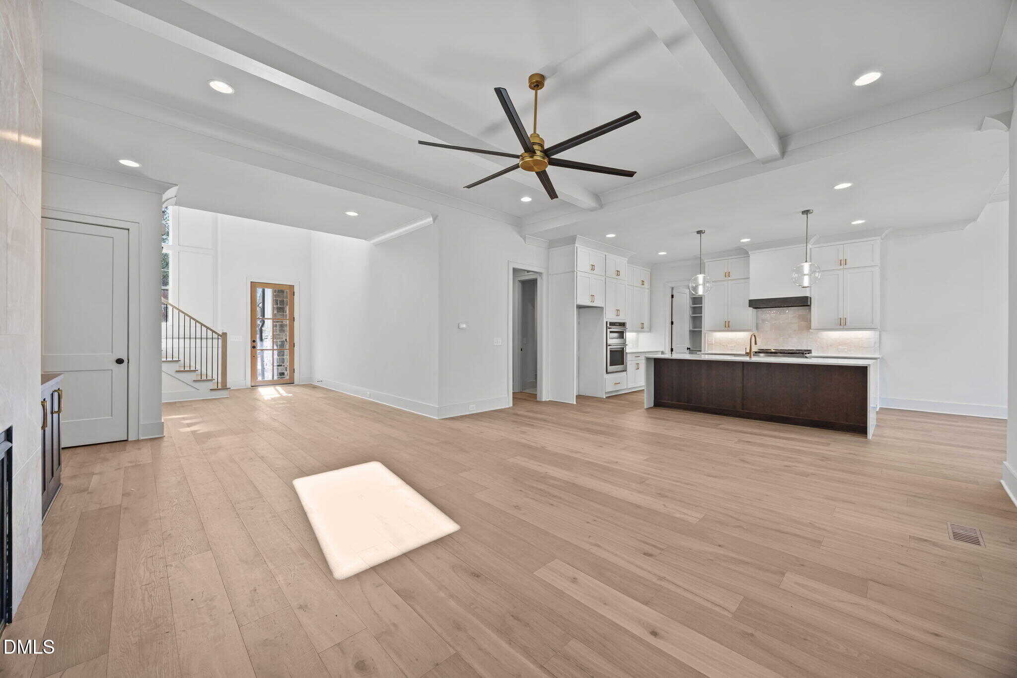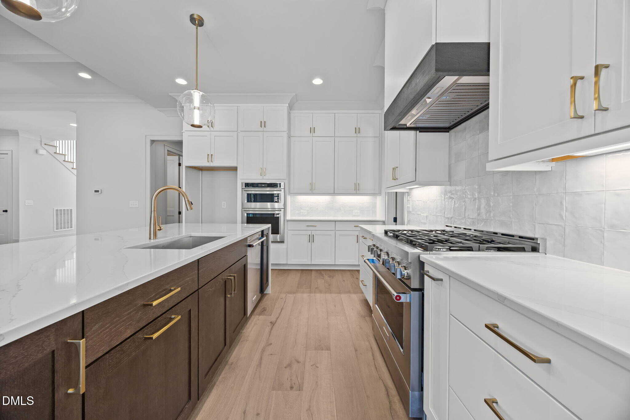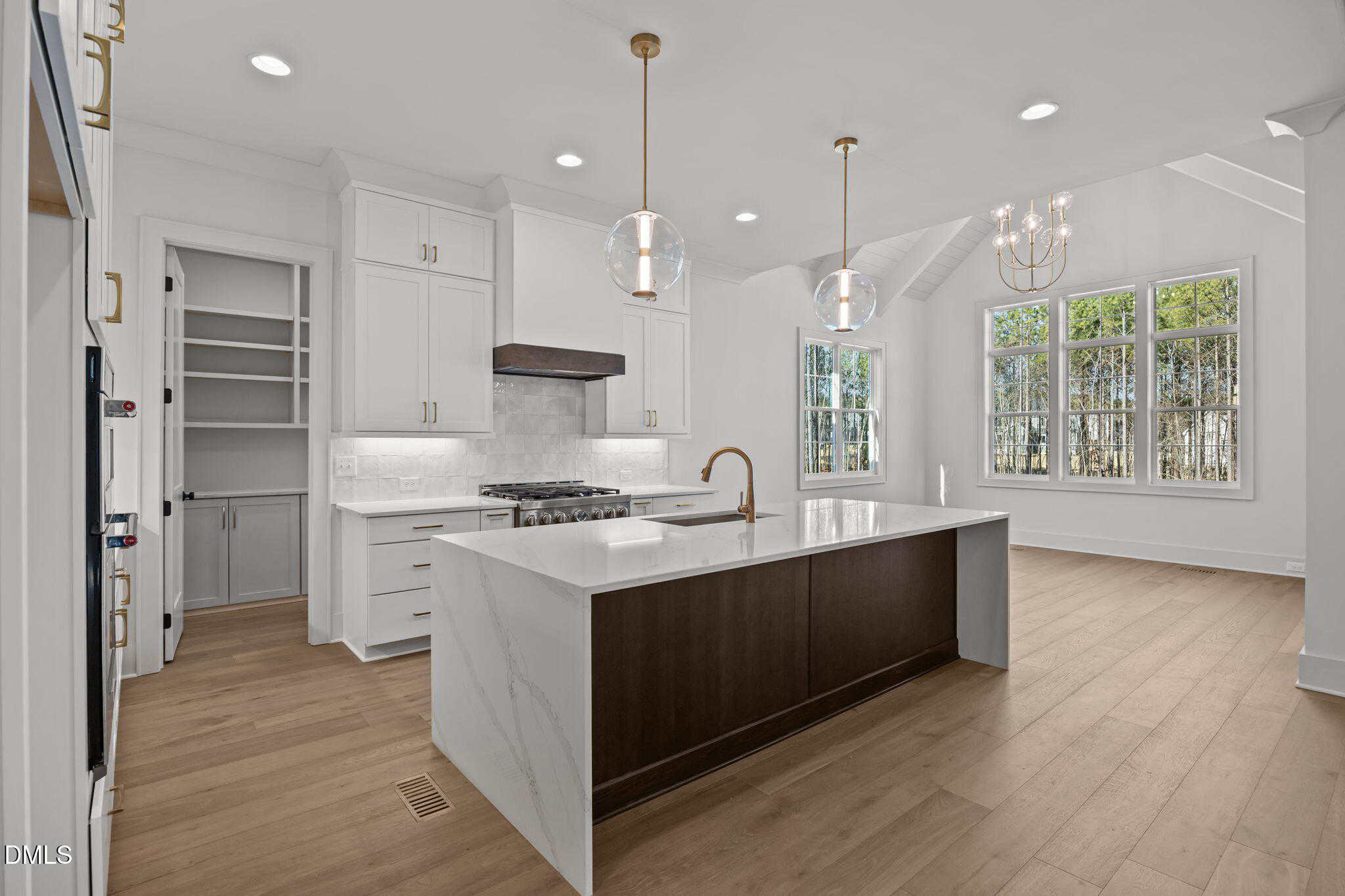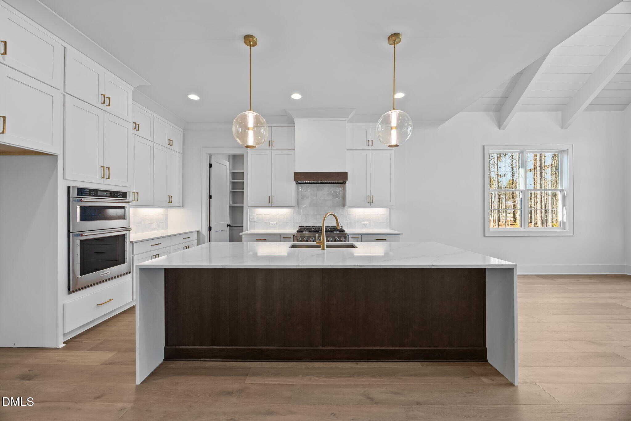 The gourmet kitchen features a quartz island with waterfall edge and designer pendant lights, custom ceiling-height white painted cabinetry, stainless steel appliances includign a gas range and huge walk-in pantry, all opening to the vaulted dining area with exposed beams and shiplap accents.
